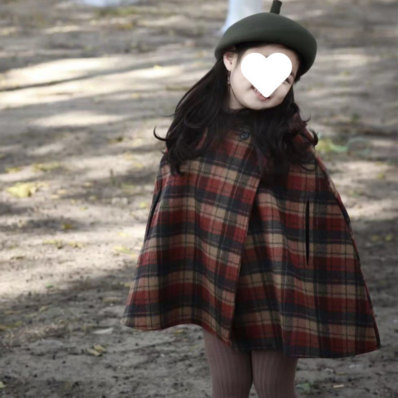소녀 코트 포인팅 모자 격자 면 두꺼운 모직 외투 망토 2024 가을 및 겨울 새로운 대외 무역 아동복스토어 가기
