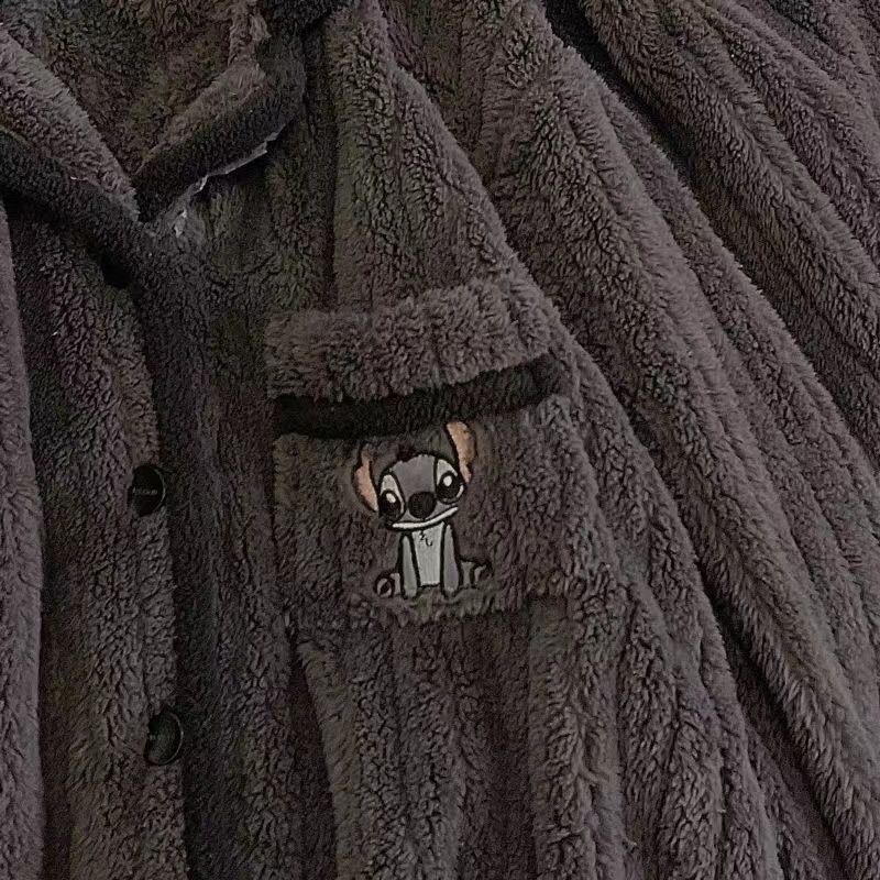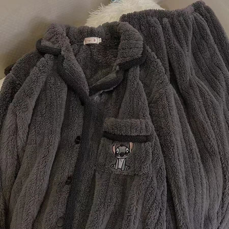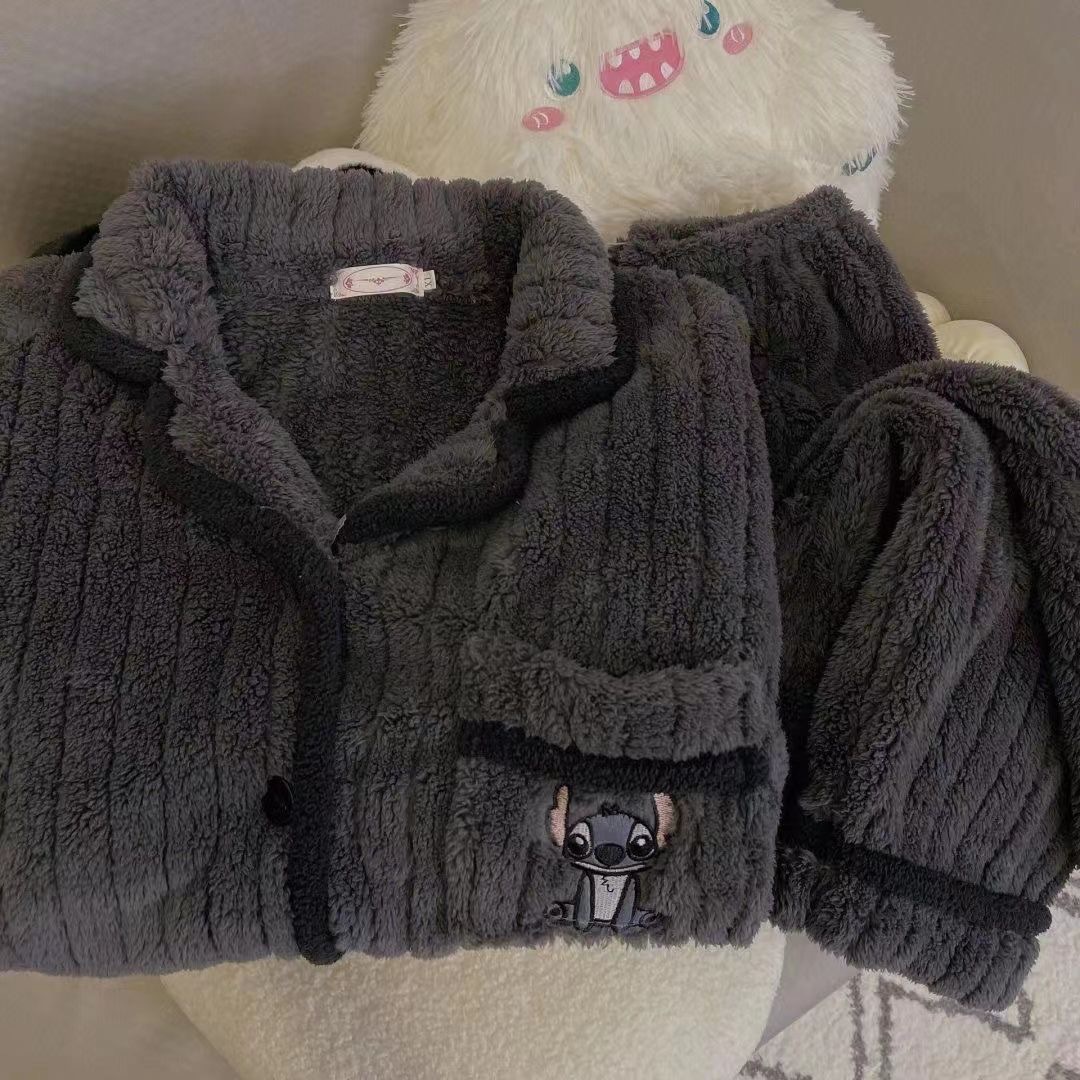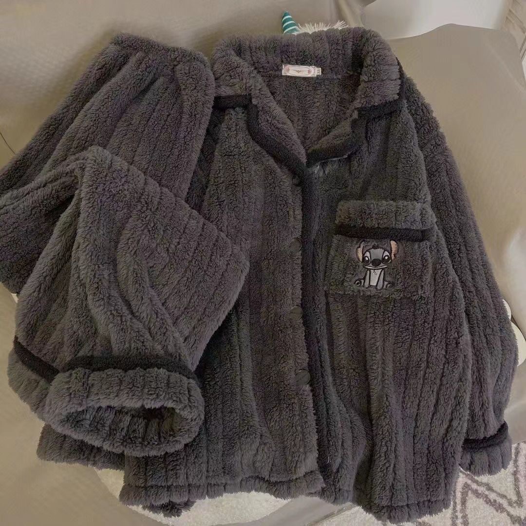 Ins 한국 스타일 Steychie 만화 커플 남성과 여성을위한 잠옷 가을 겨울 기모 두꺼운 산호 양털 홈 옷 세트스토어 가기