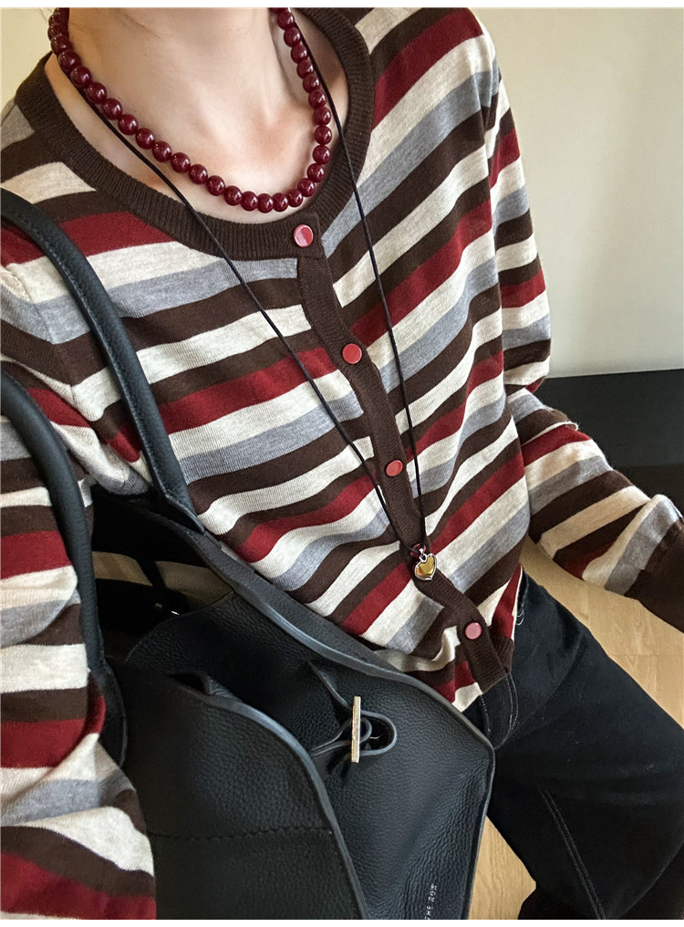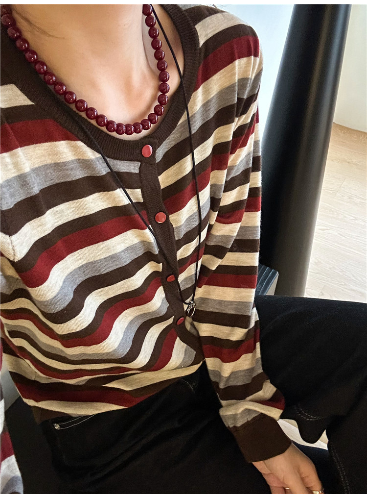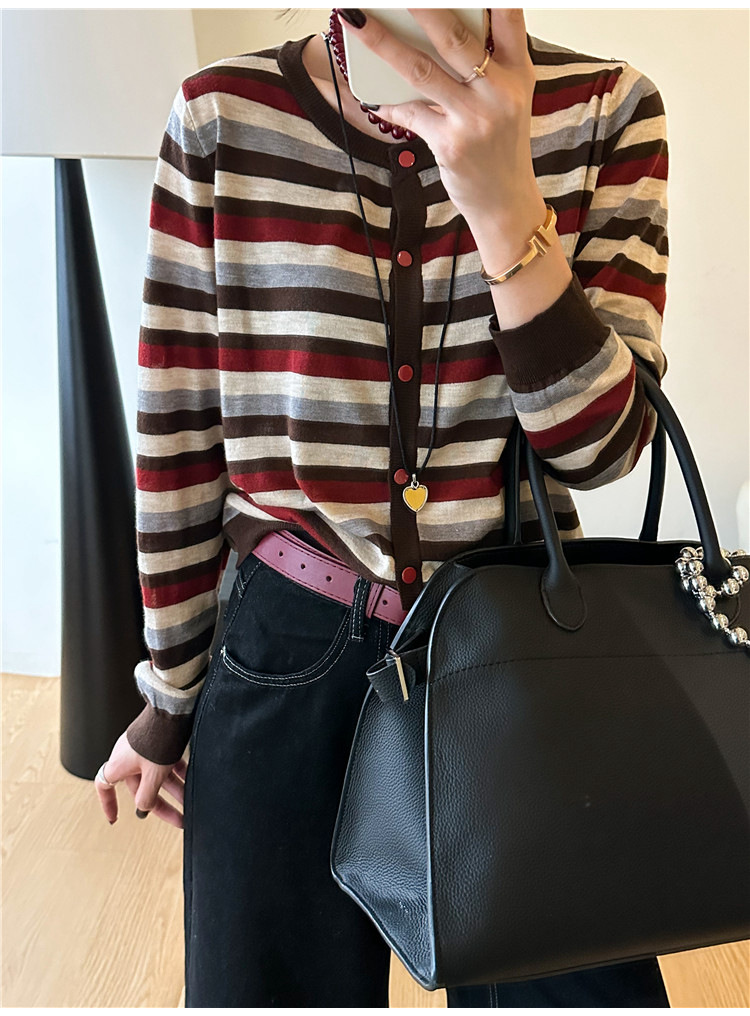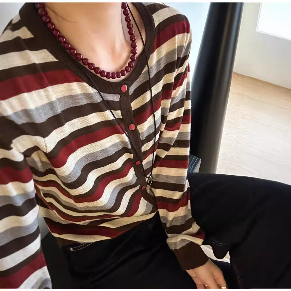 대조 줄무늬 양모 니트 카디건 여자 유럽 역 2024 가을 새로운 유럽 여성의 얇은 기지 셔츠 트렌디스토어 가기