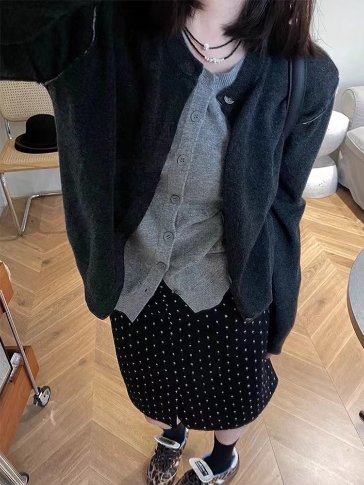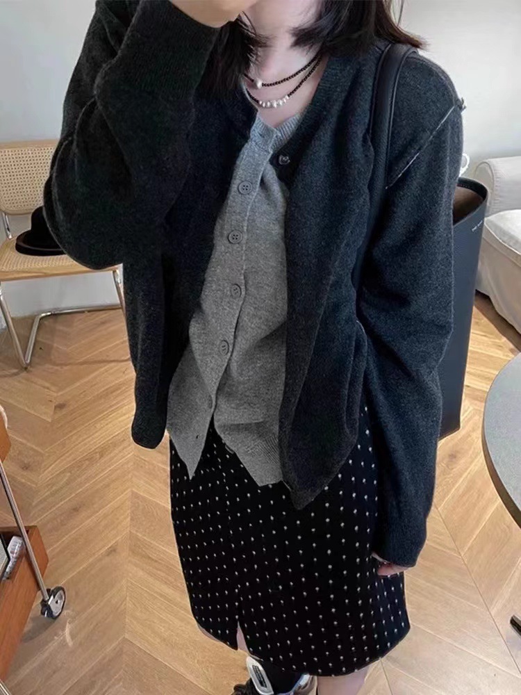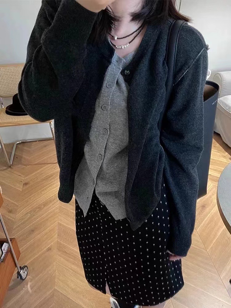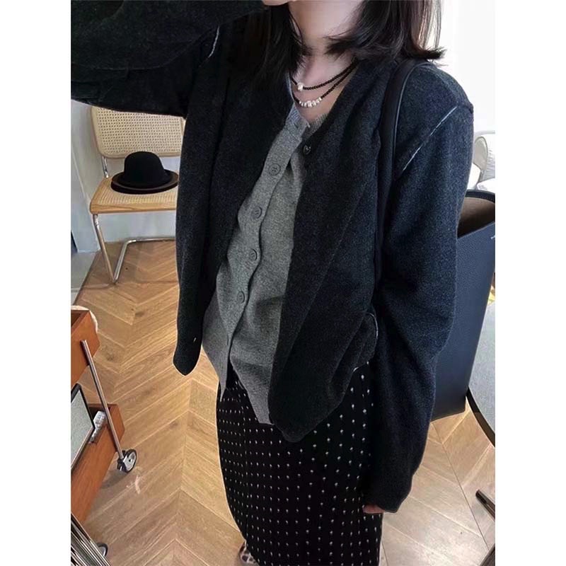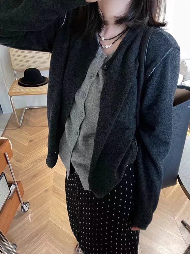 다크 그레이 가짜 2 피스 라운드 넥 니트 카디건 여성 가을 새로운 한국 스타일 디자인 감각 느슨한 올 매치 스웨터 재킷