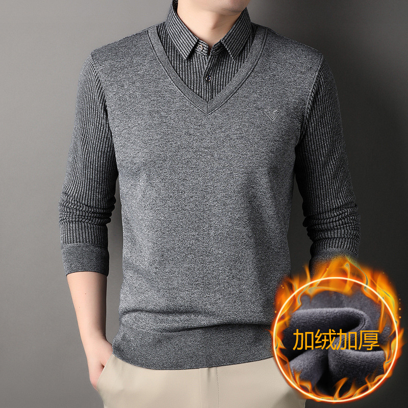국경 간 대외 무역 가을과 겨울 남자 가짜 투피스 니트 올 매치 셔츠 칼라 재킷 남자 스웨터 티셔츠 내부 기모