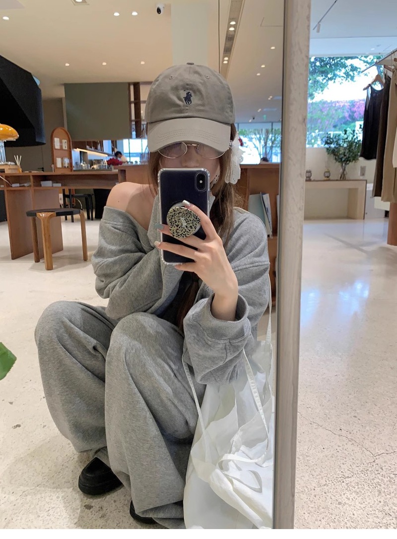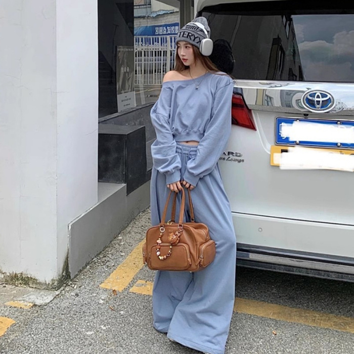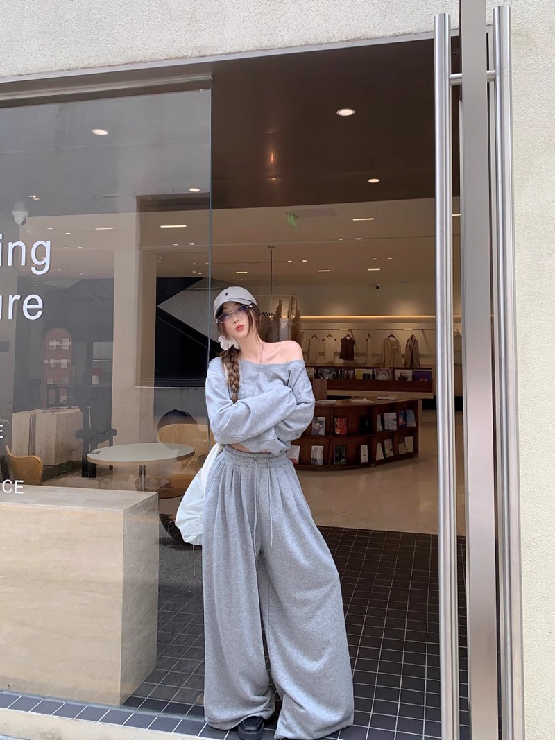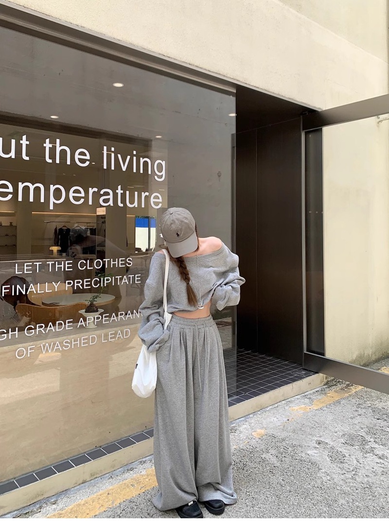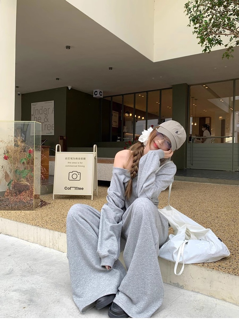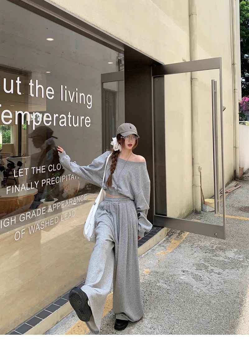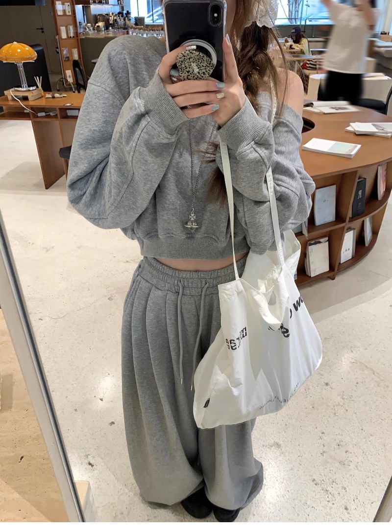 아메리칸 레트로 어깨 긴팔 땀 여자 가을 캐주얼 스포츠 세트 드로우 스트링 와이드 레그 팬츠 그레이 투피스 세트스토어 가기