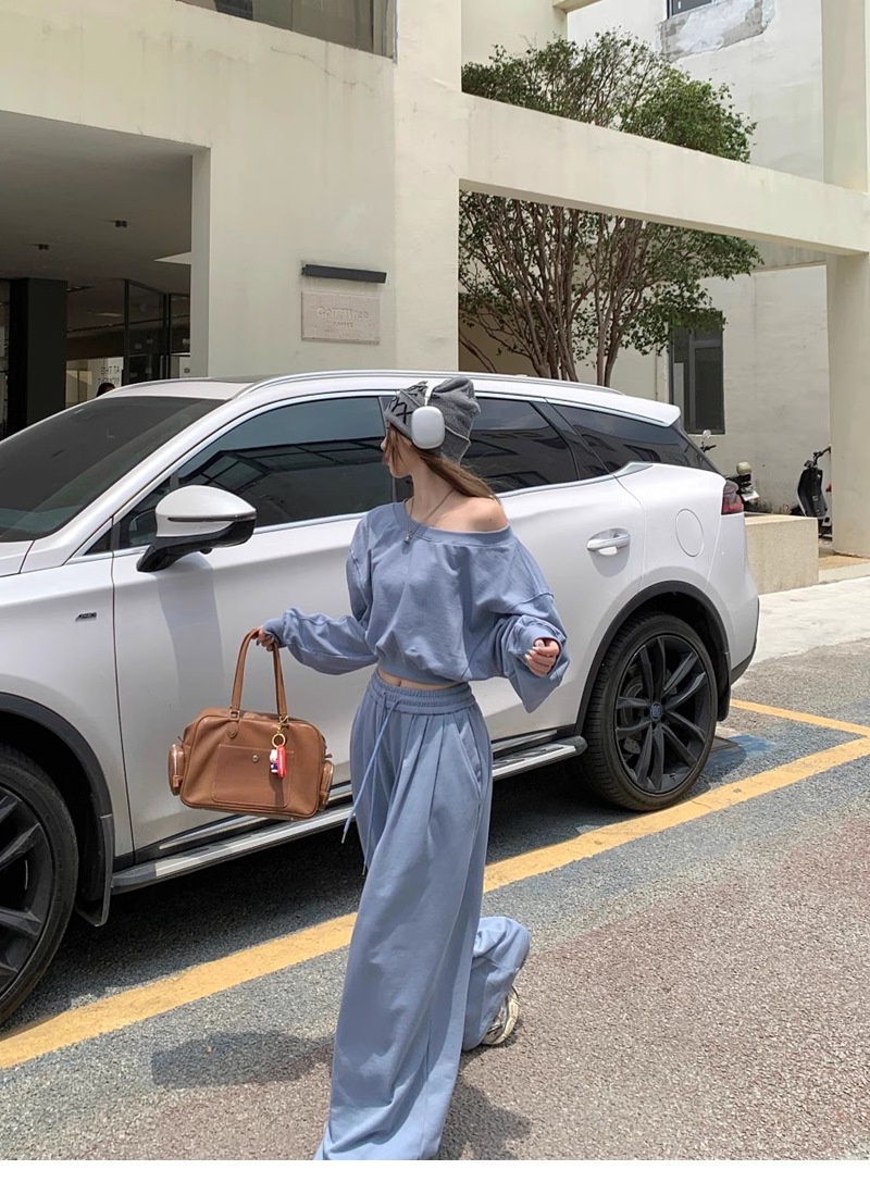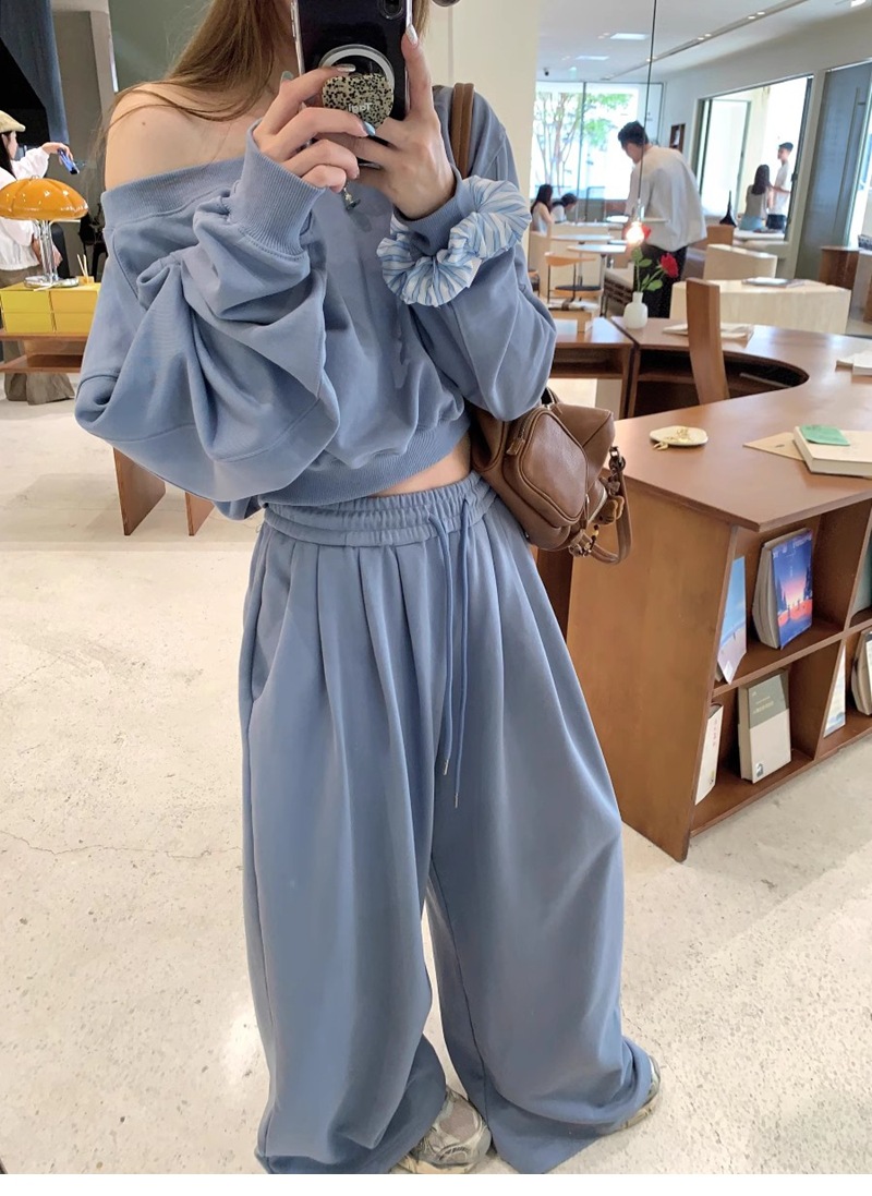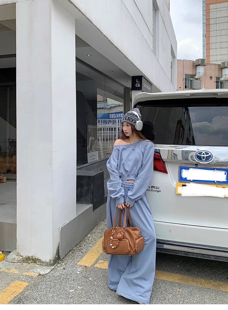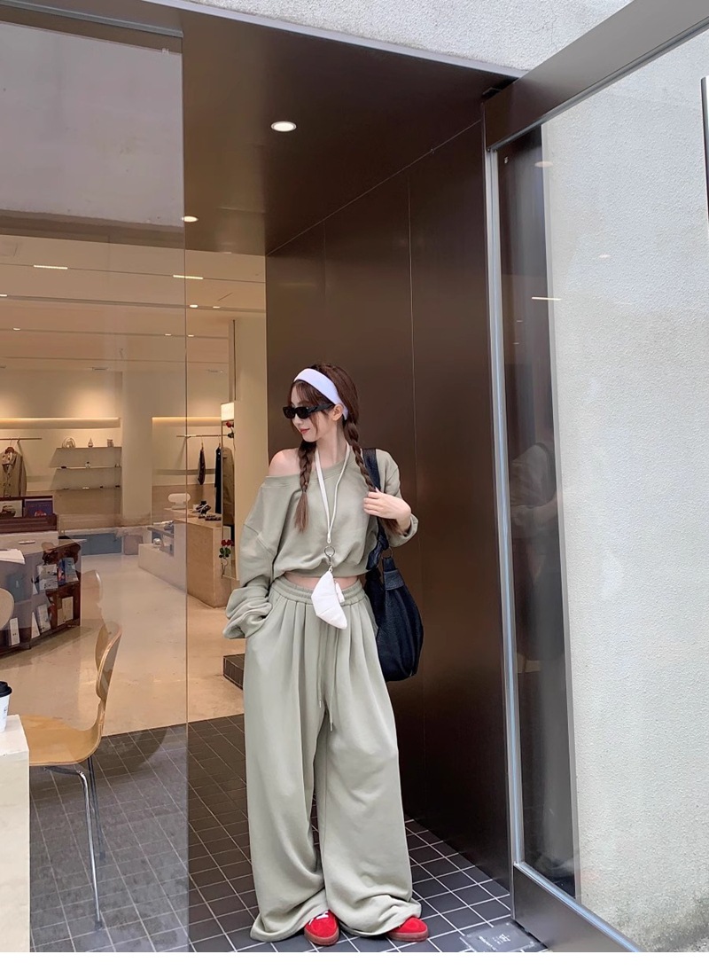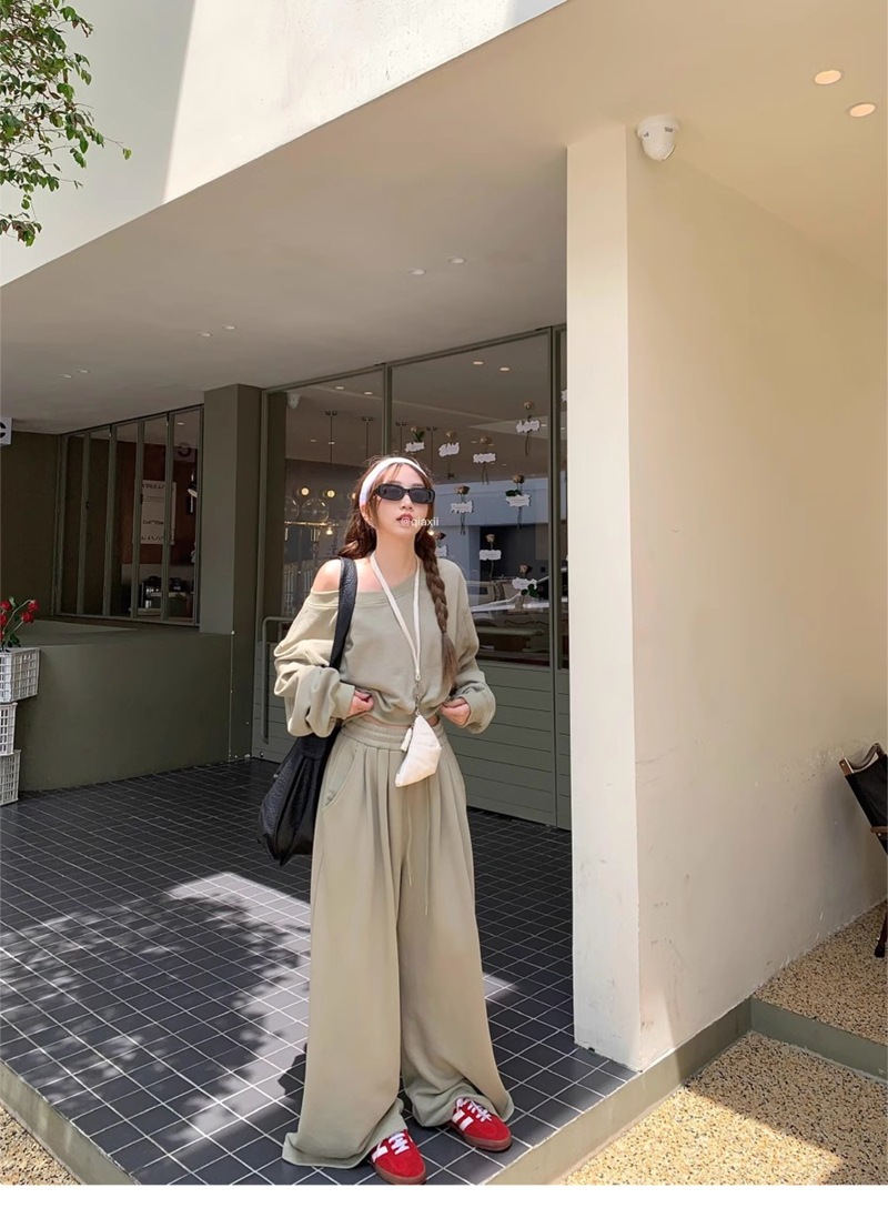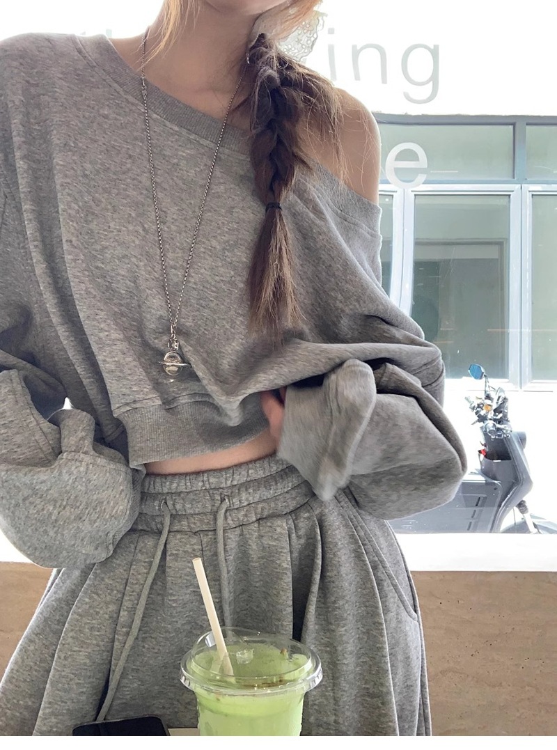 아메리칸 레트로 어깨 긴팔 땀 여자 가을 캐주얼 스포츠 세트 드로우 스트링 와이드 레그 팬츠 그레이 투피스 세트스토어 가기