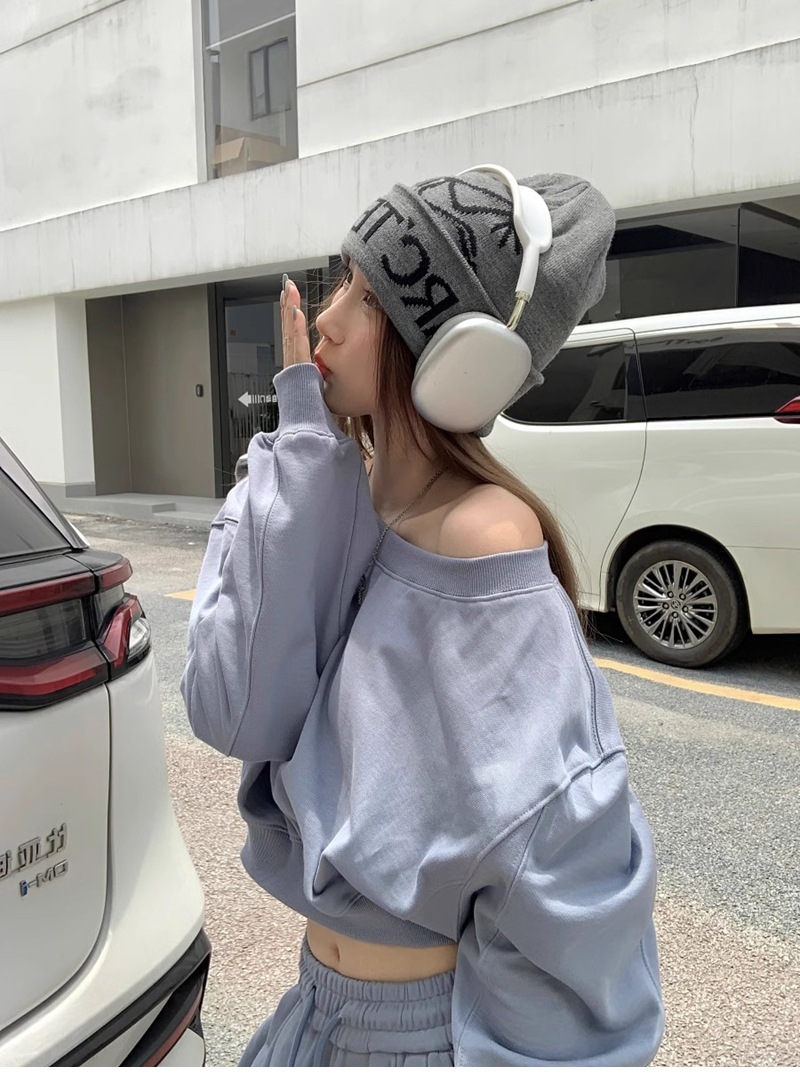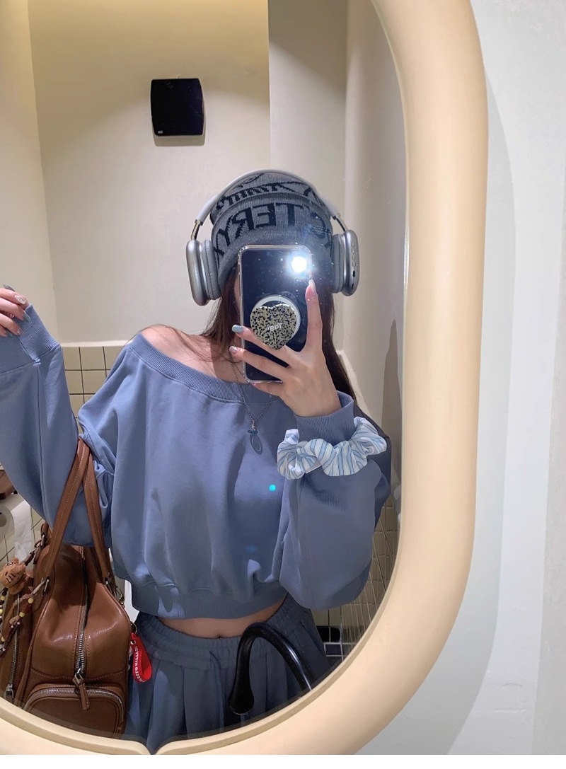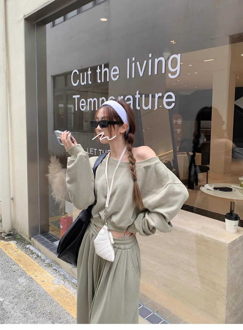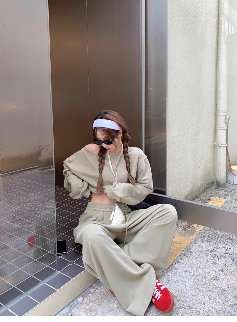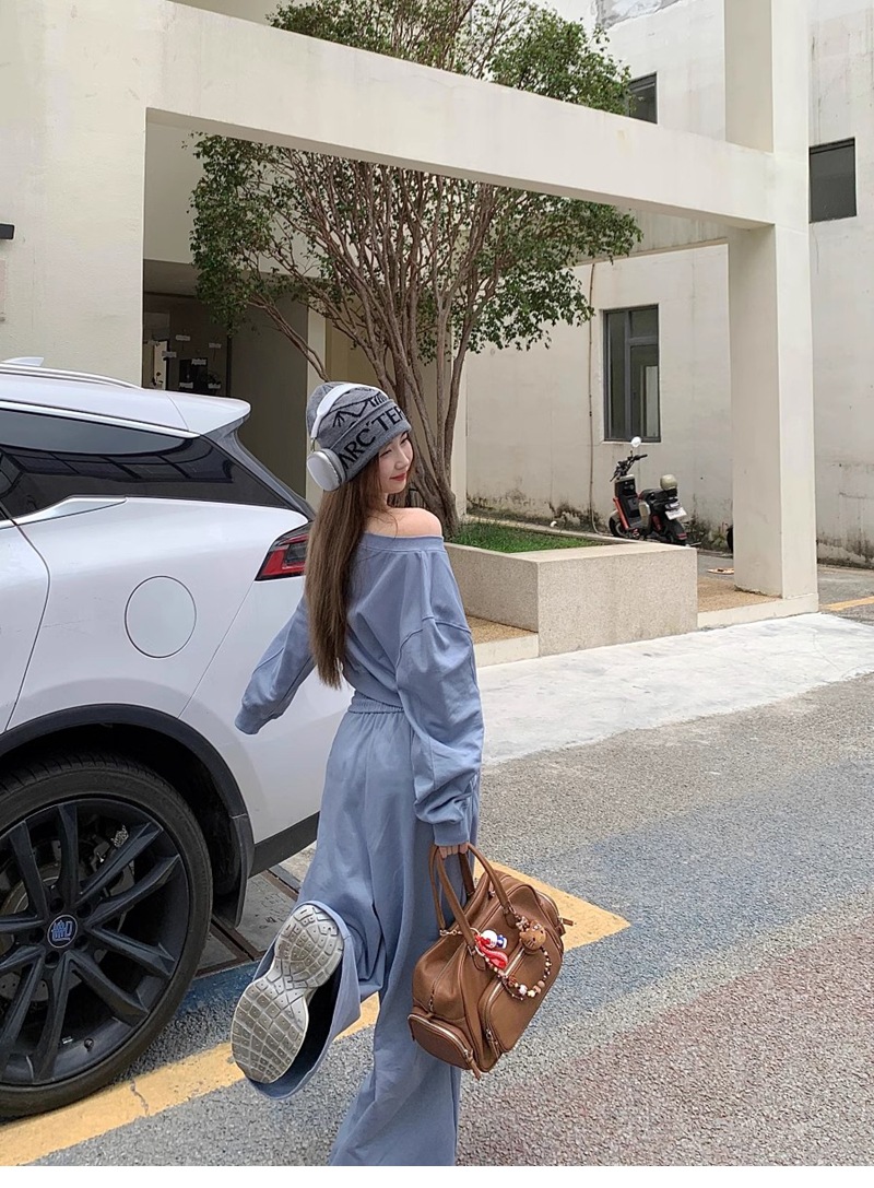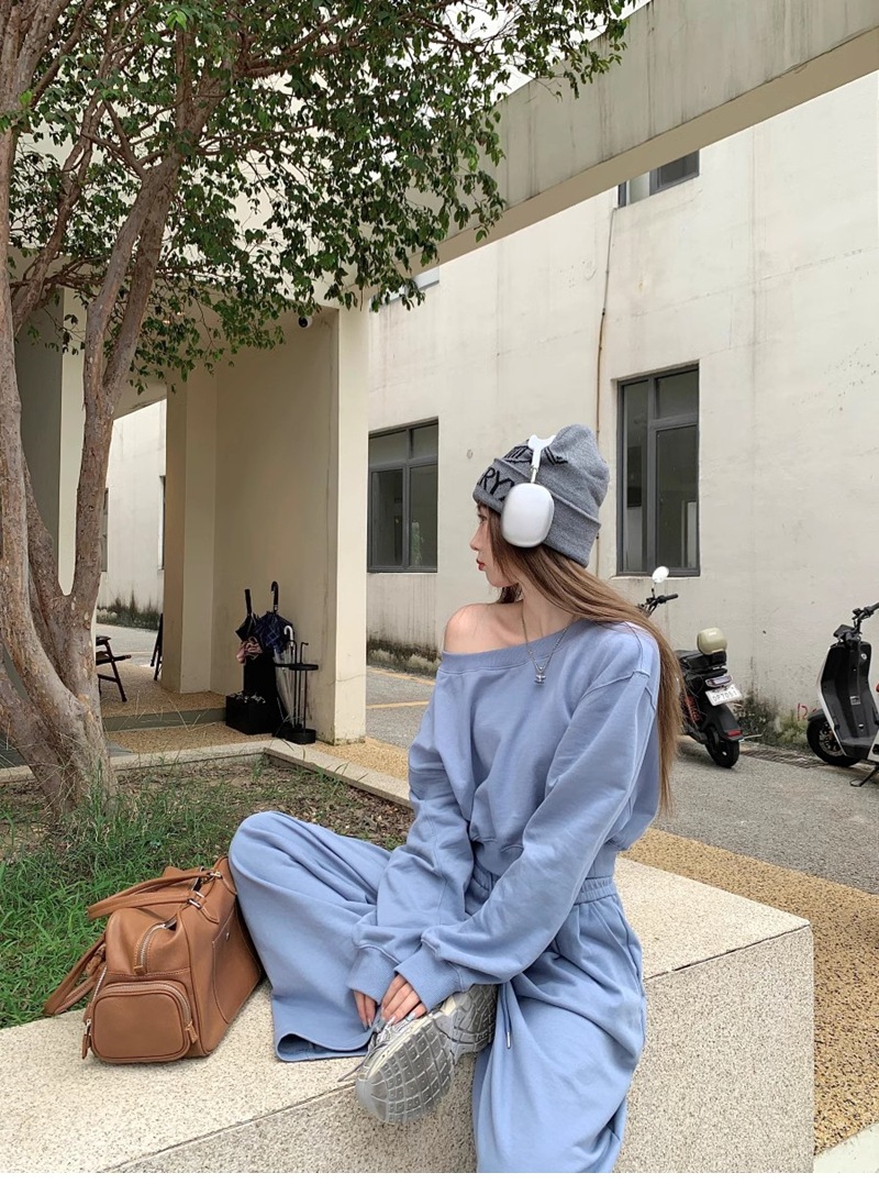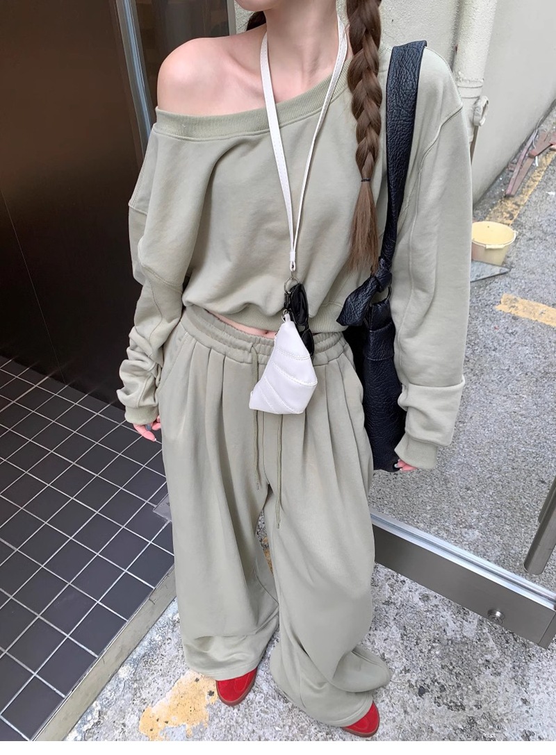 아메리칸 레트로 어깨 긴팔 땀 여자 가을 캐주얼 스포츠 세트 드로우 스트링 와이드 레그 팬츠 그레이 투피스 세트스토어 가기