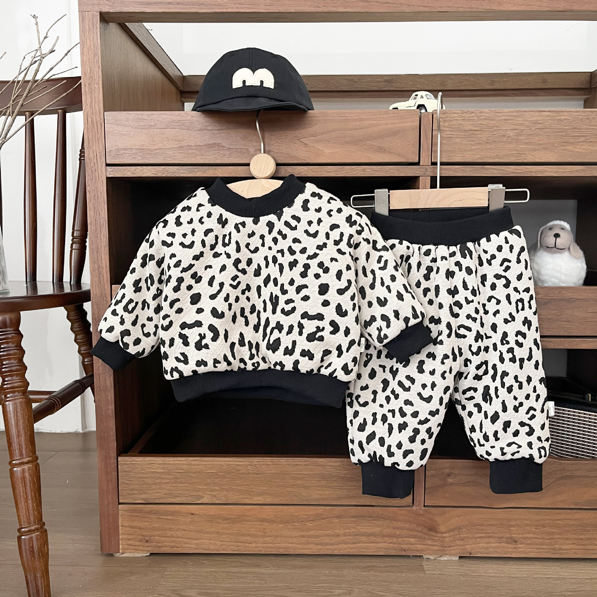 한국 버전의 조수 소년 겨울 세트 2024 새로운 서부 레오파드 무늬 둥근 목 패딩 스웨터 바지 따뜻한 투피스 세트