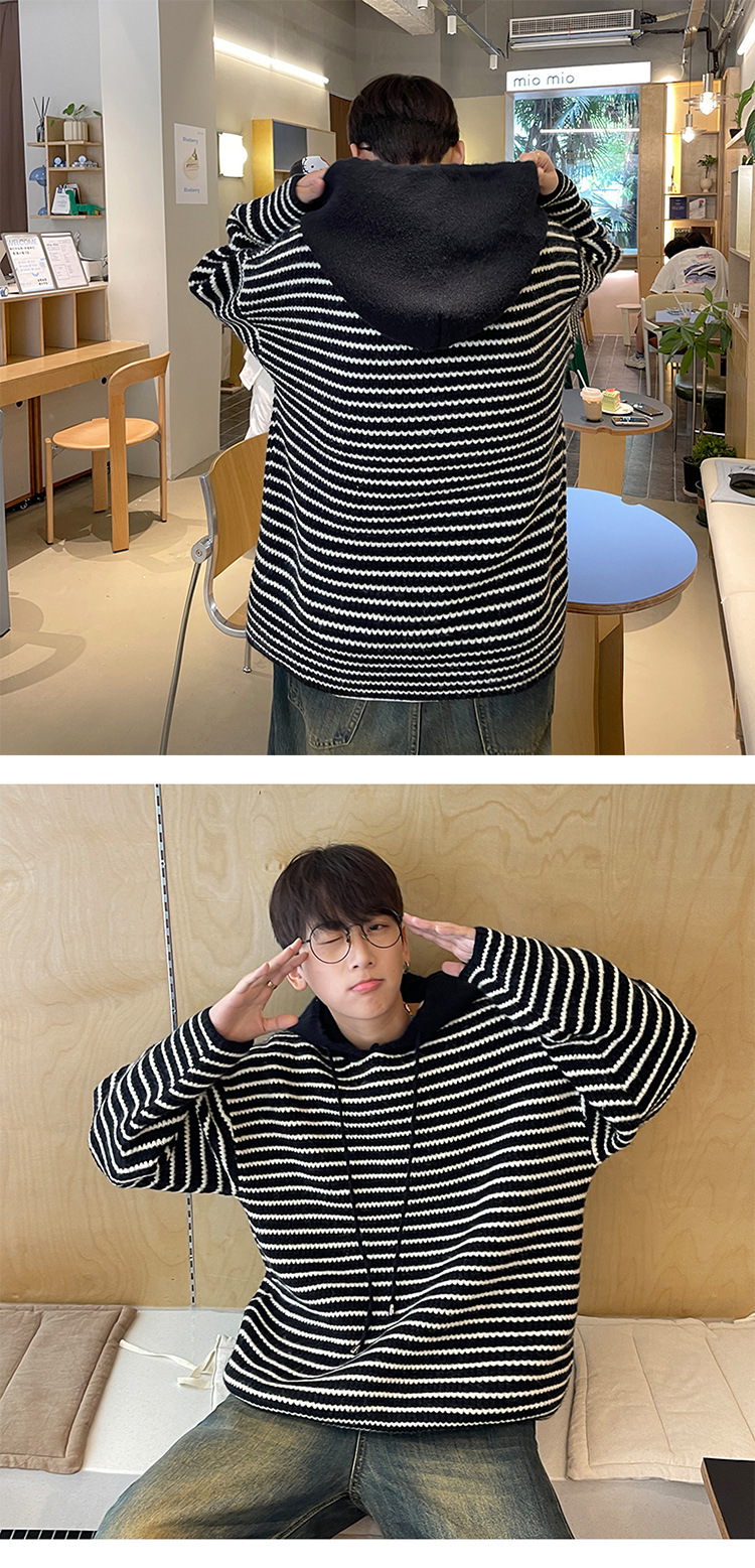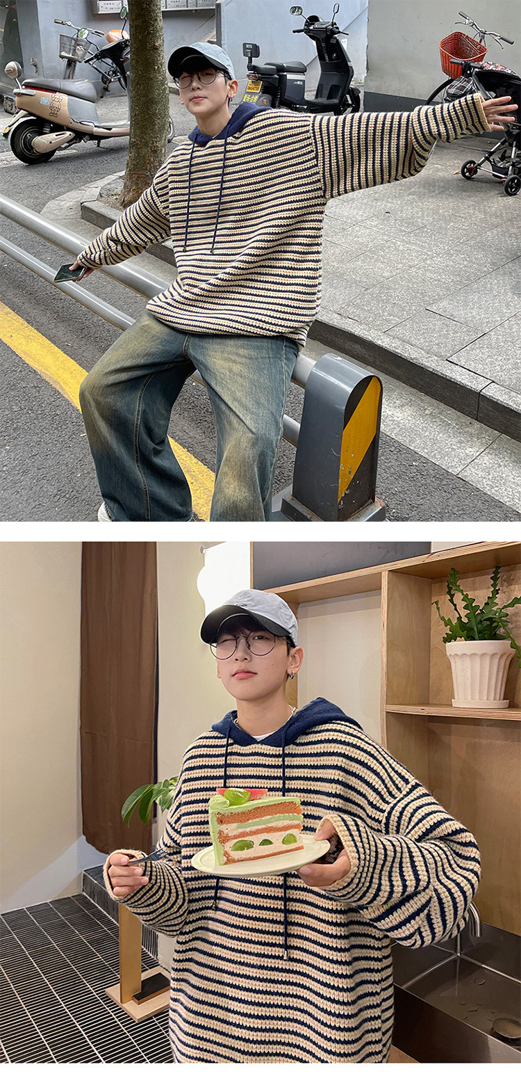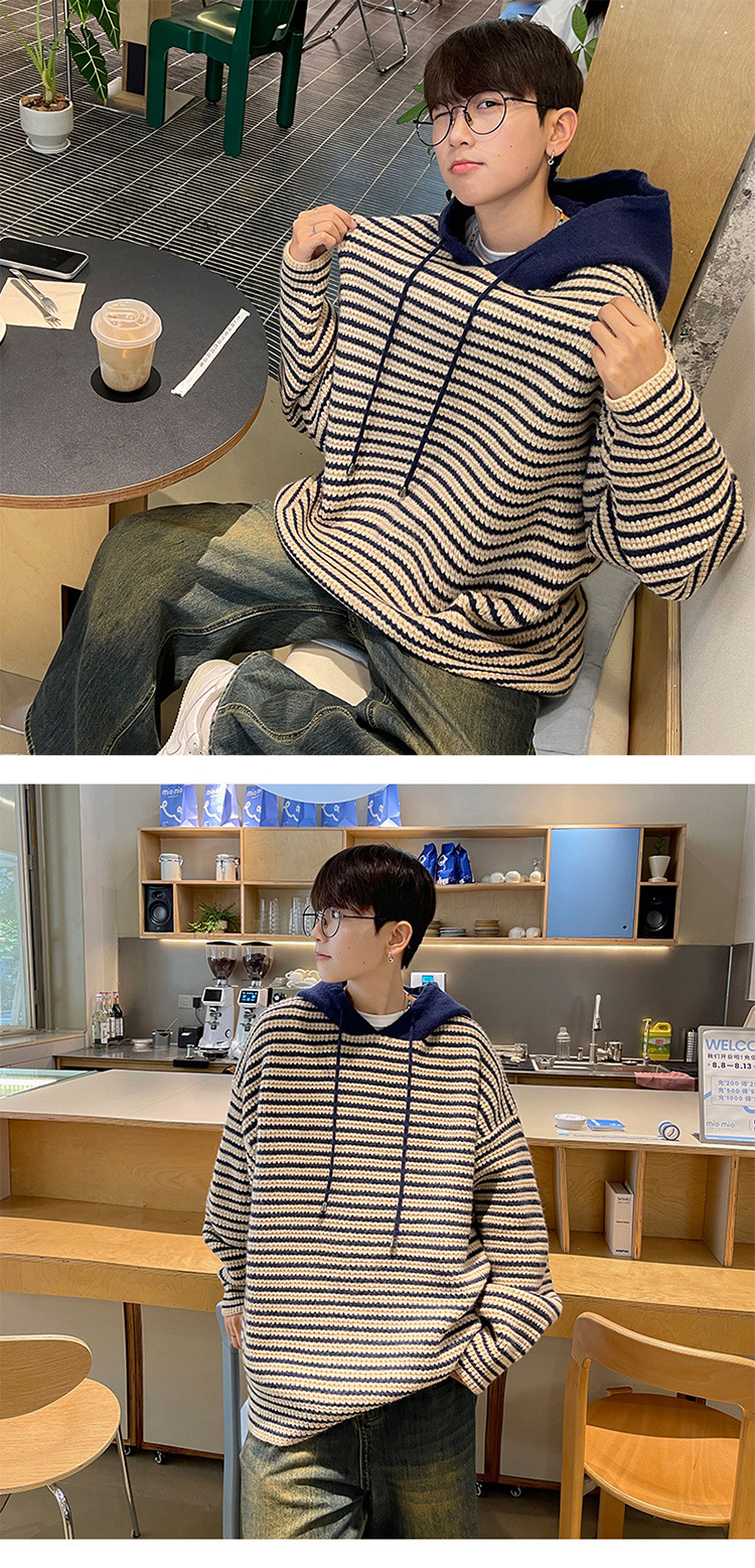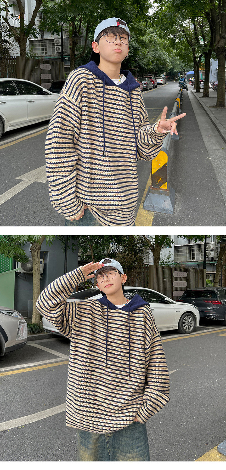 스트라이프 후드 스웨터 남자의 가을과 겨울 미국 복고풍 패션 브랜드 청소년 게으른 캐주얼 느슨한 니트 스웨터 재킷스토어 가기