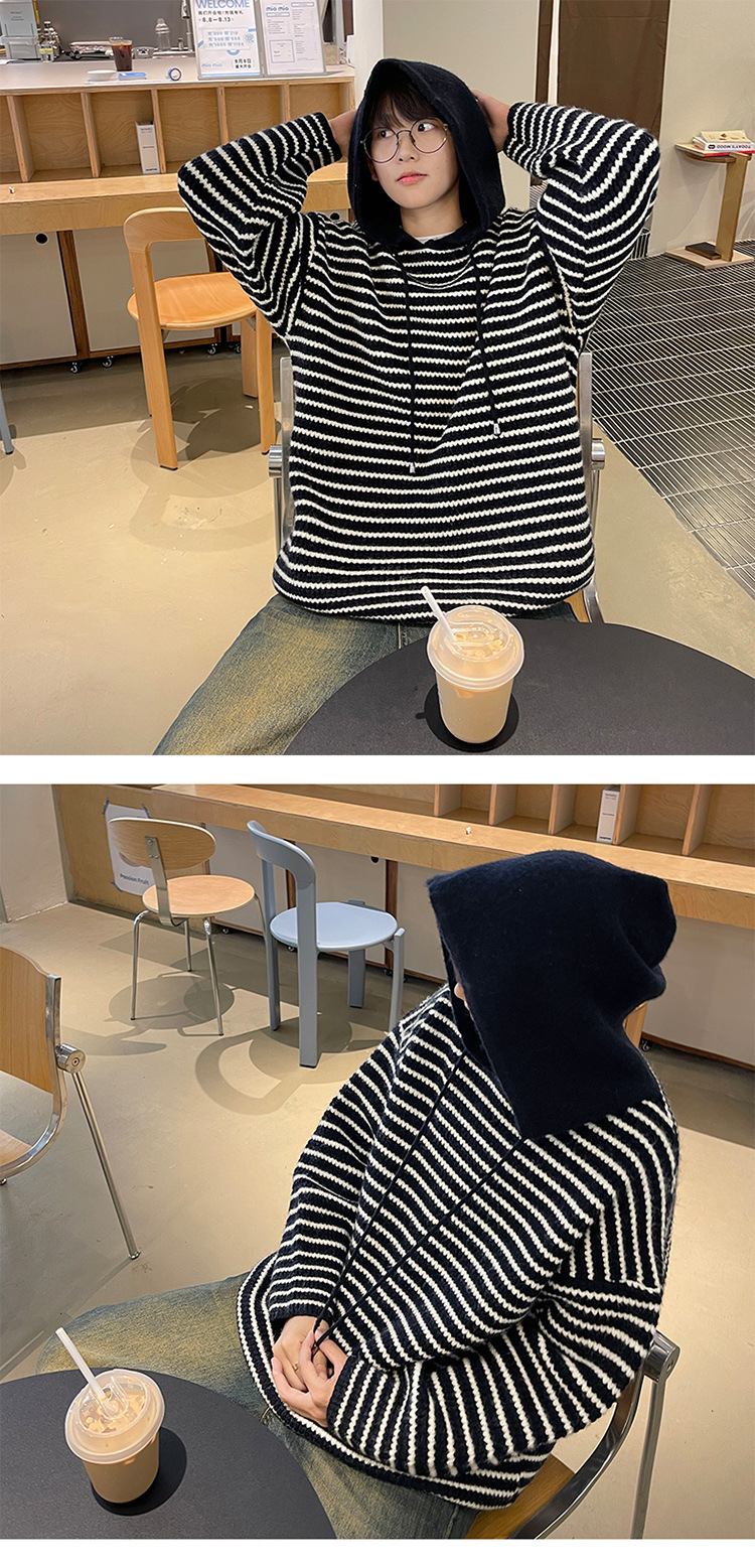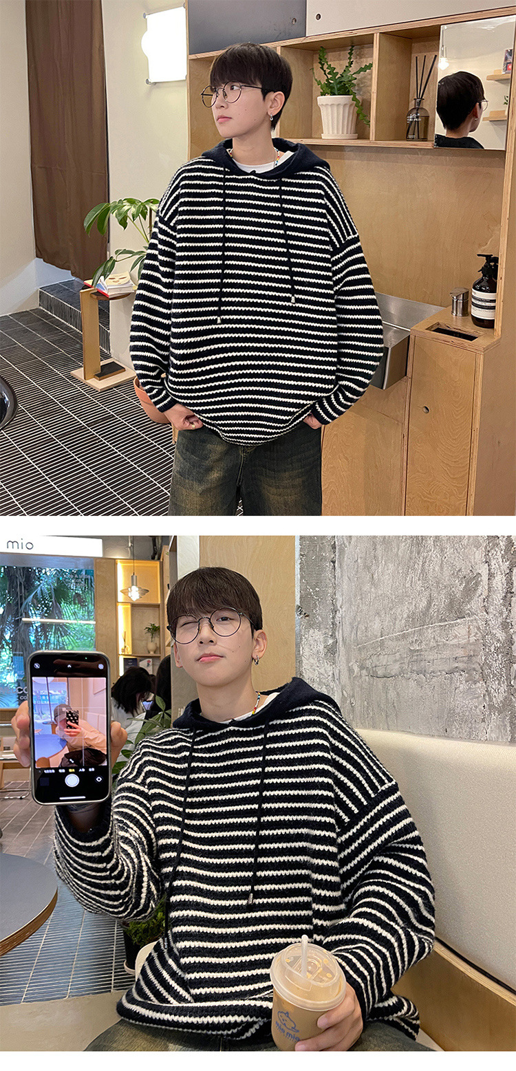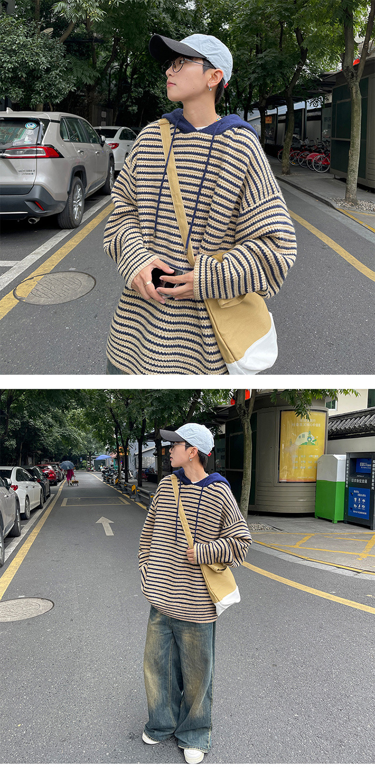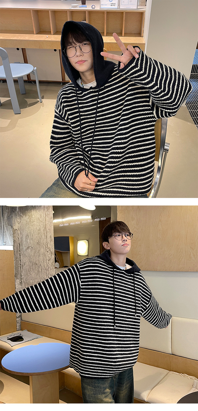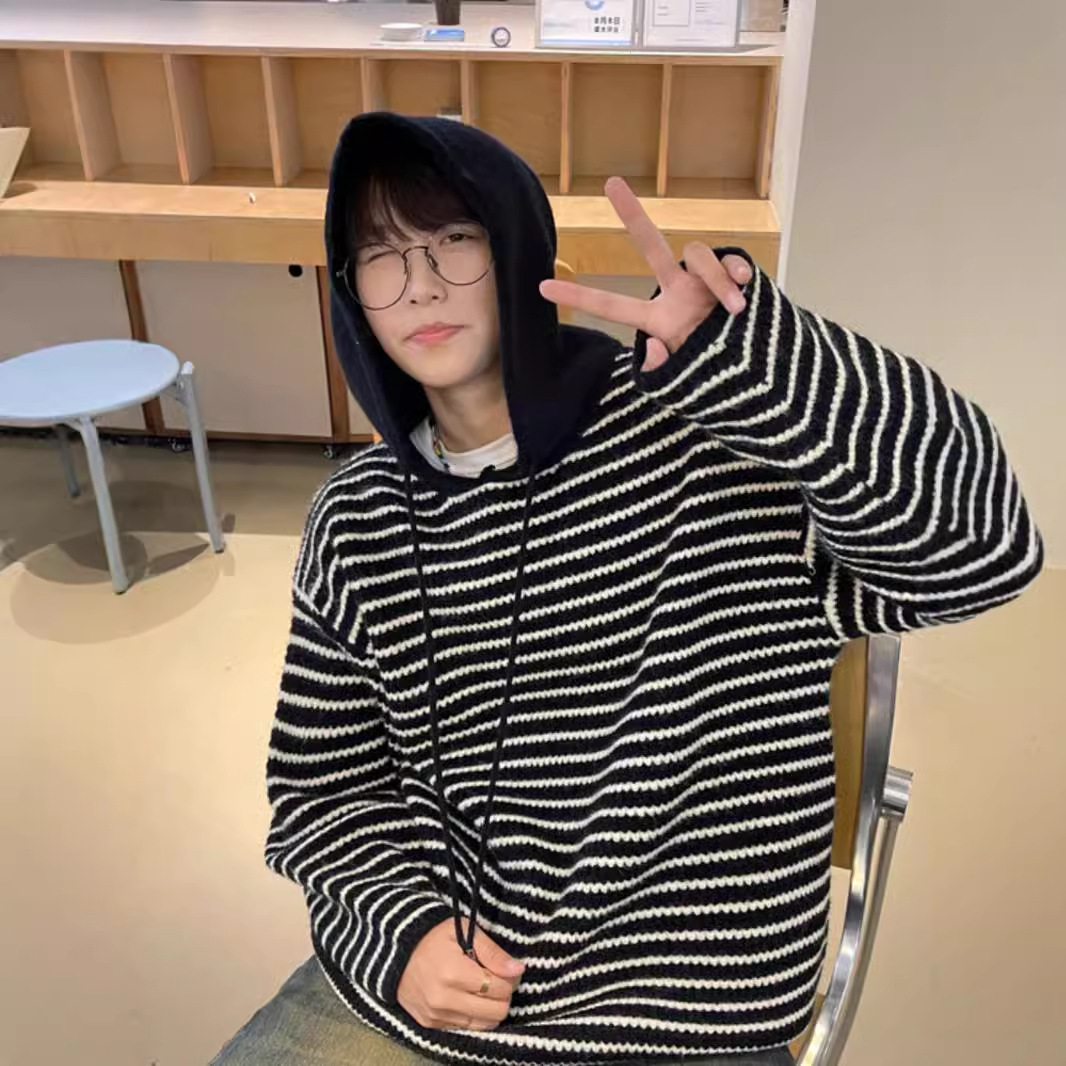 스트라이프 후드 스웨터 남자의 가을과 겨울 미국 복고풍 패션 브랜드 청소년 게으른 캐주얼 느슨한 니트 스웨터 재킷스토어 가기