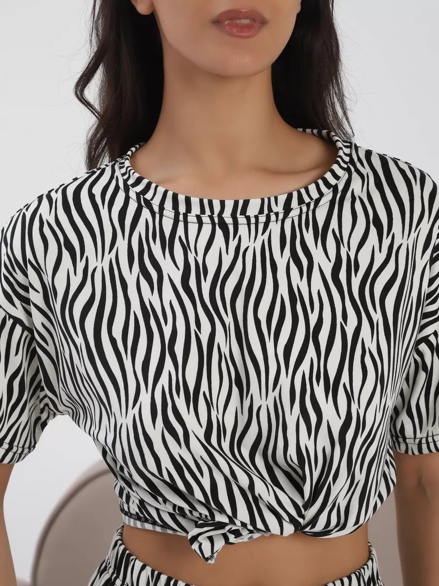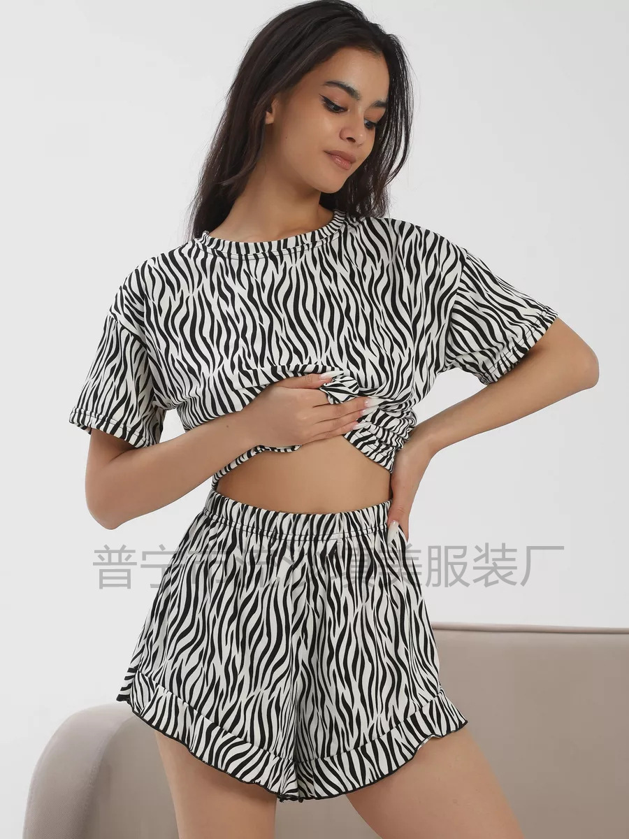 유럽과 미국의 여름 새로운 느슨한 레오파드 무늬 편안한 반팔 반바지 대외 무역 잠옷 세트 홈 의류 여성 외관