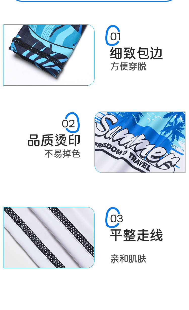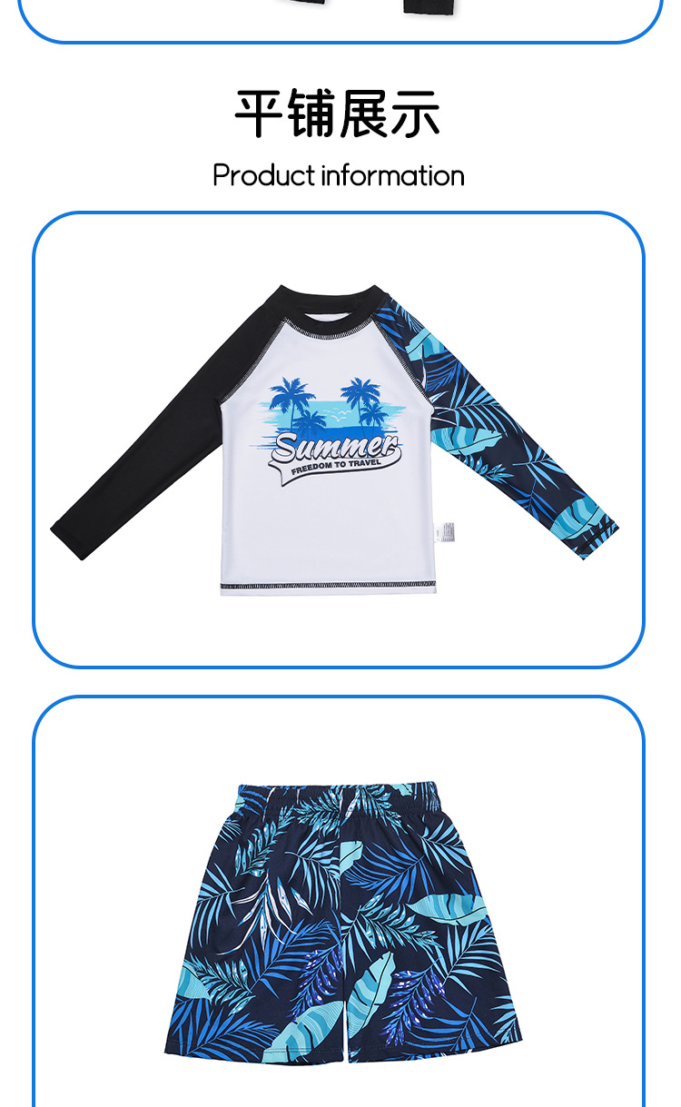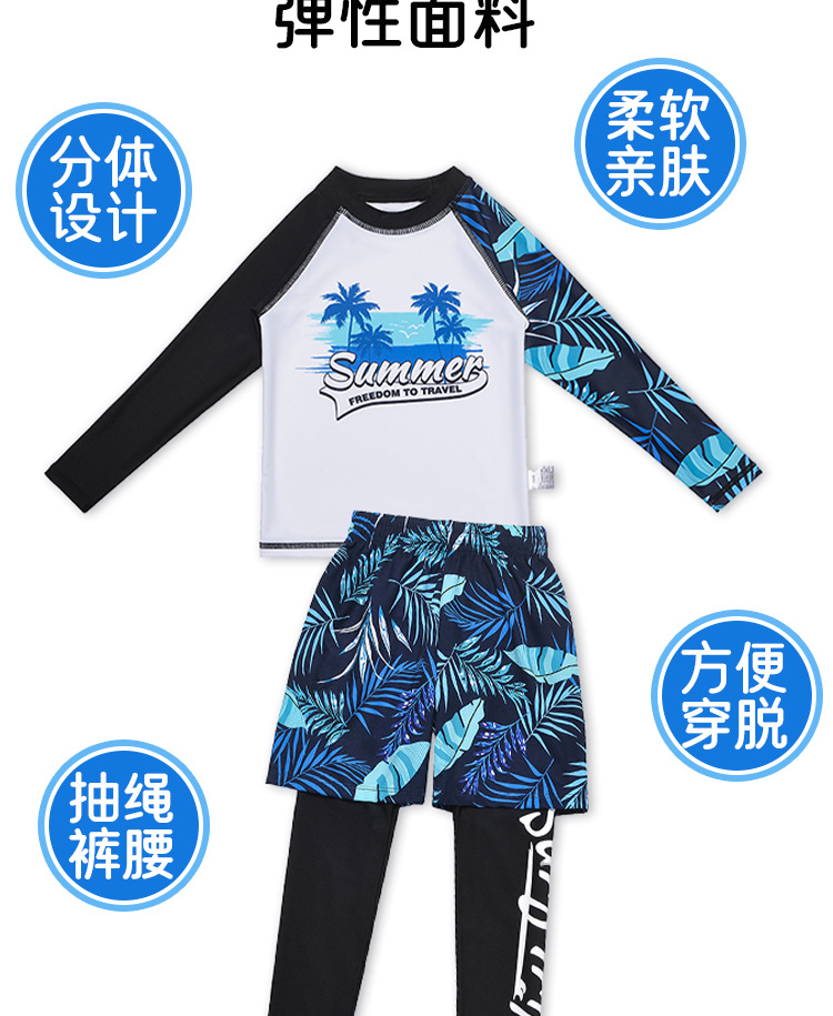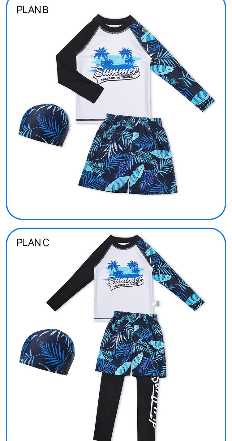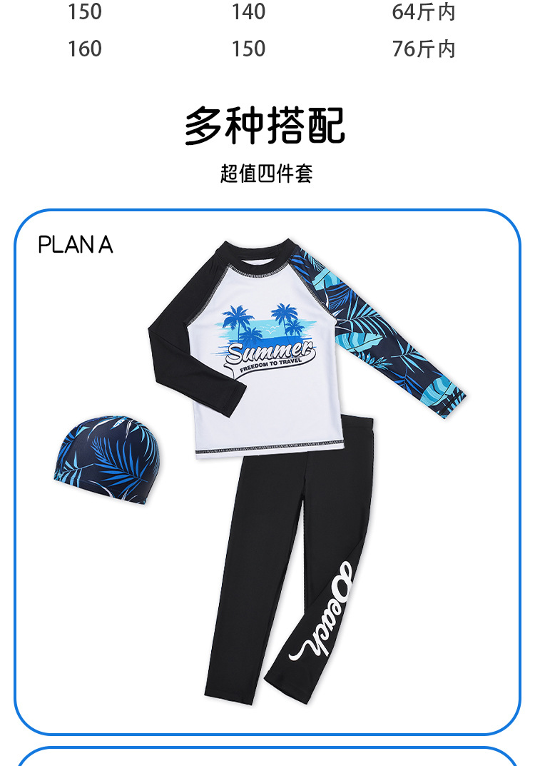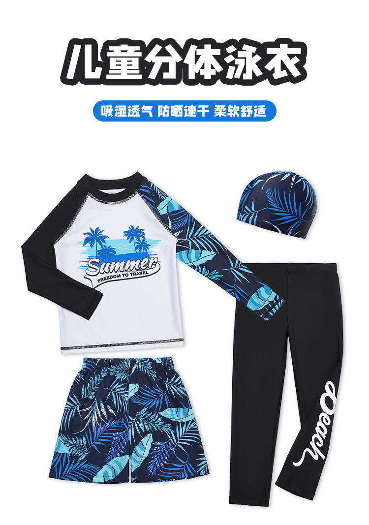 남아용 긴팔 수영복, 중대형 어린이용 자외선 차단 속건성 수영복, 남아용 수영모, 분리형 수영복 4종 세트