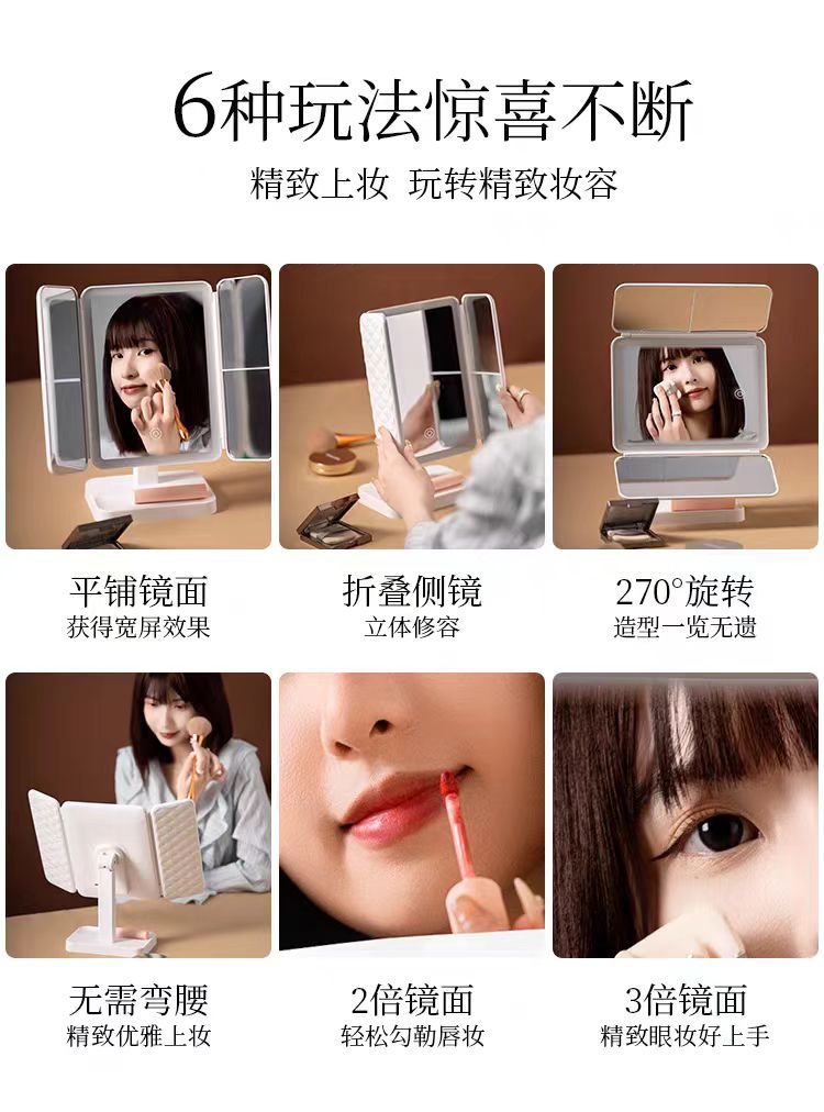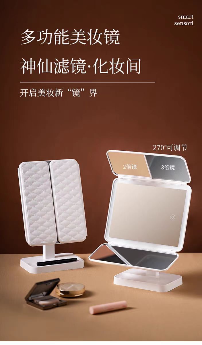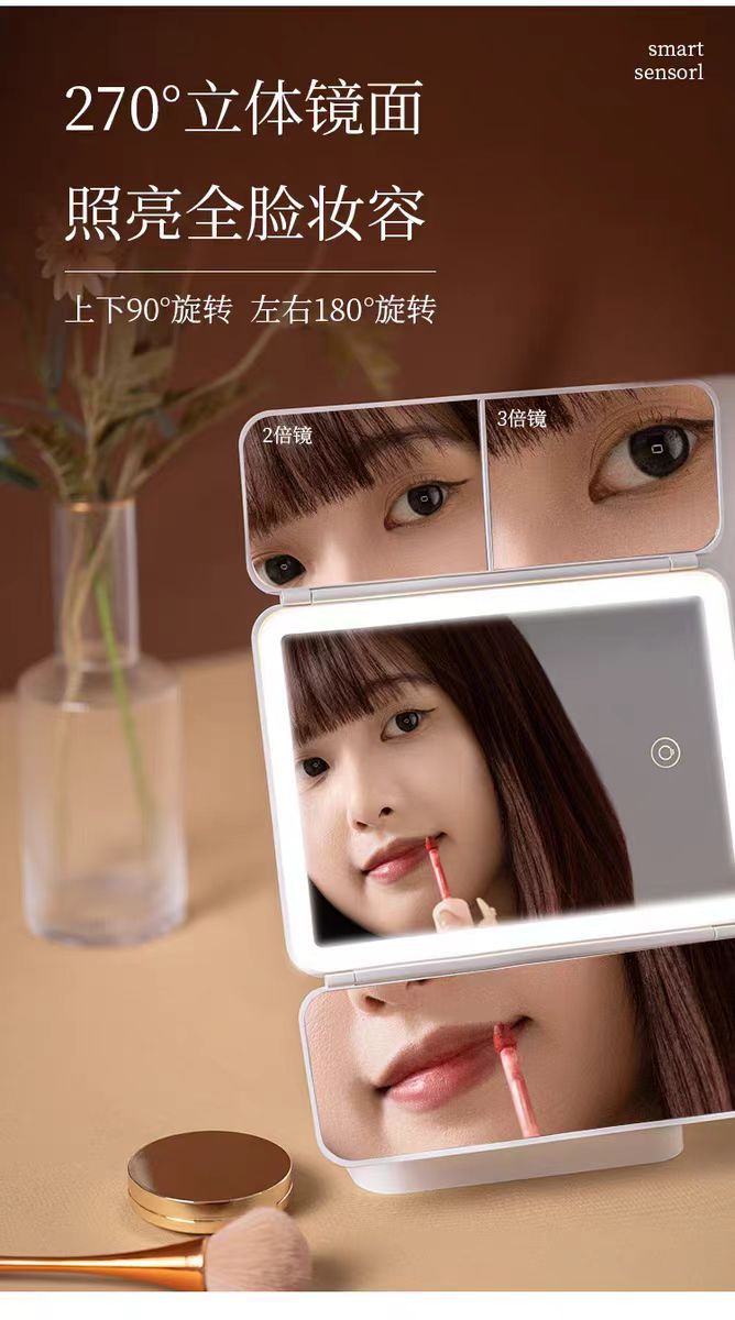 국경 데스크탑 led 다기능 쉘 접이식 거울 메이크업 거울 램프 데스크탑 세면대 거울 확대 거울