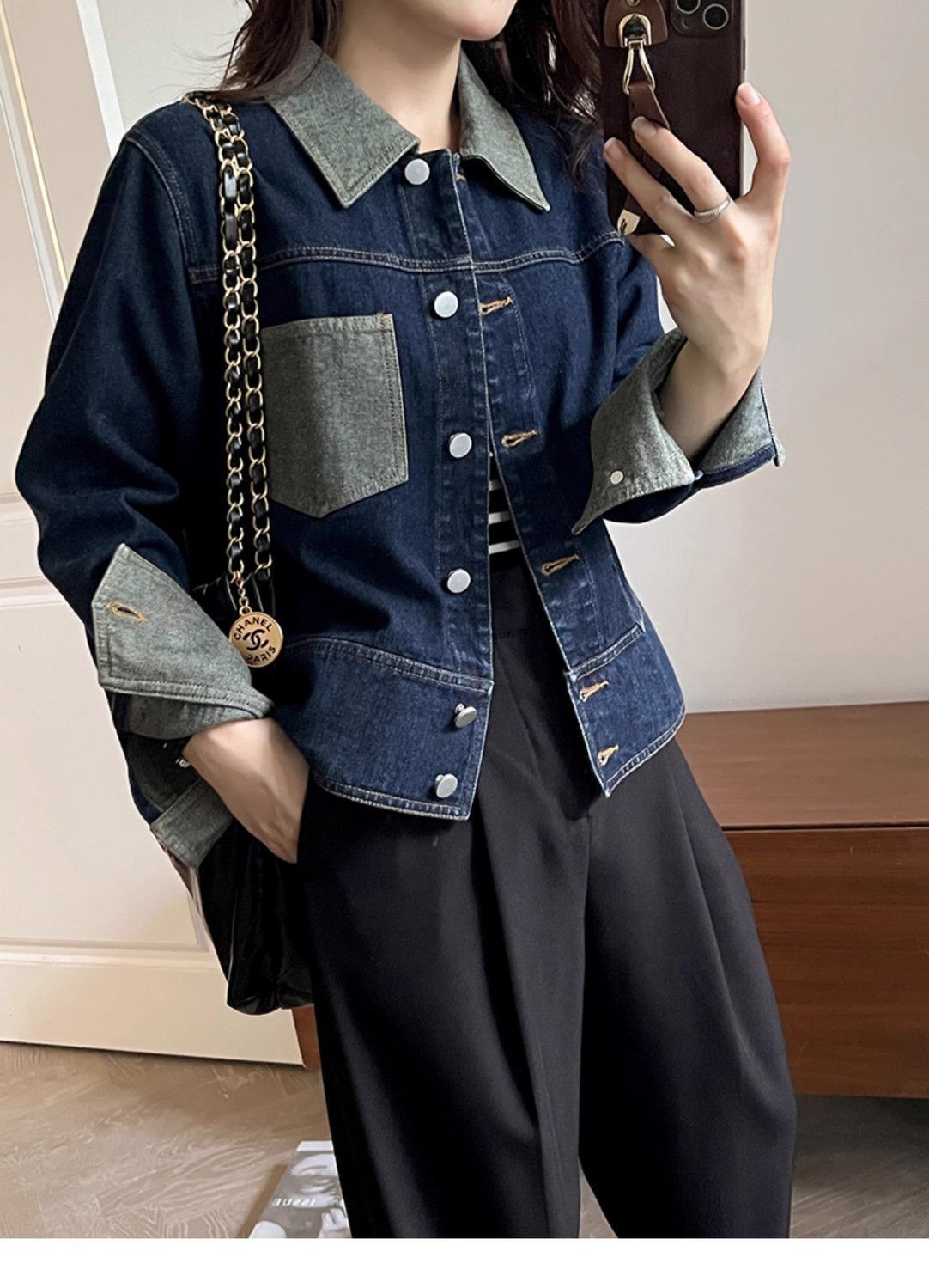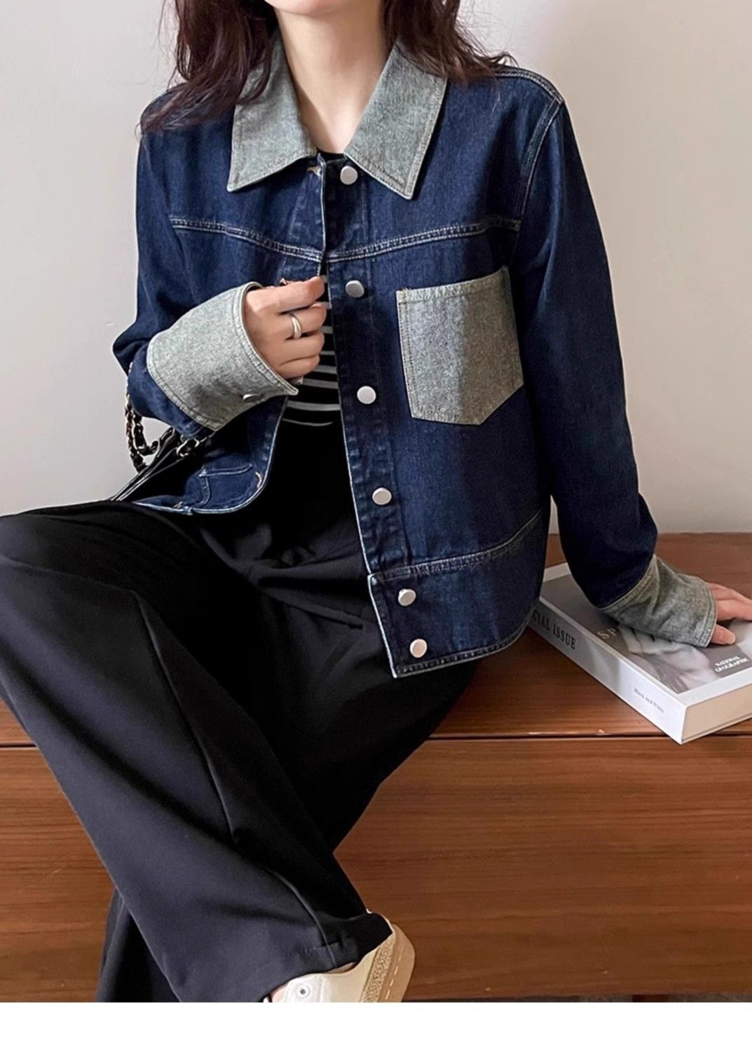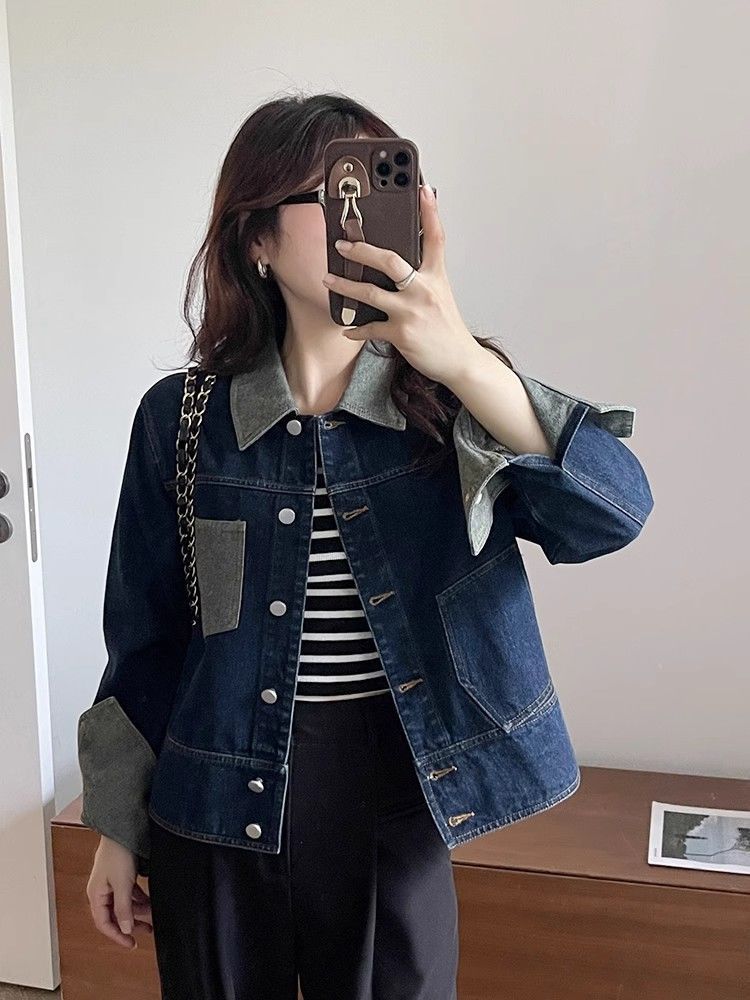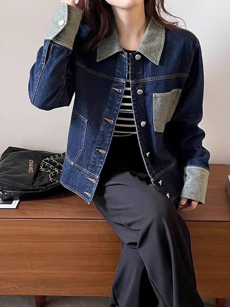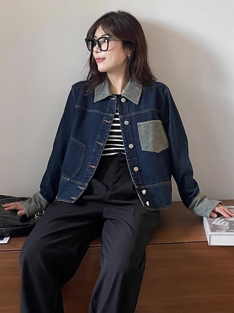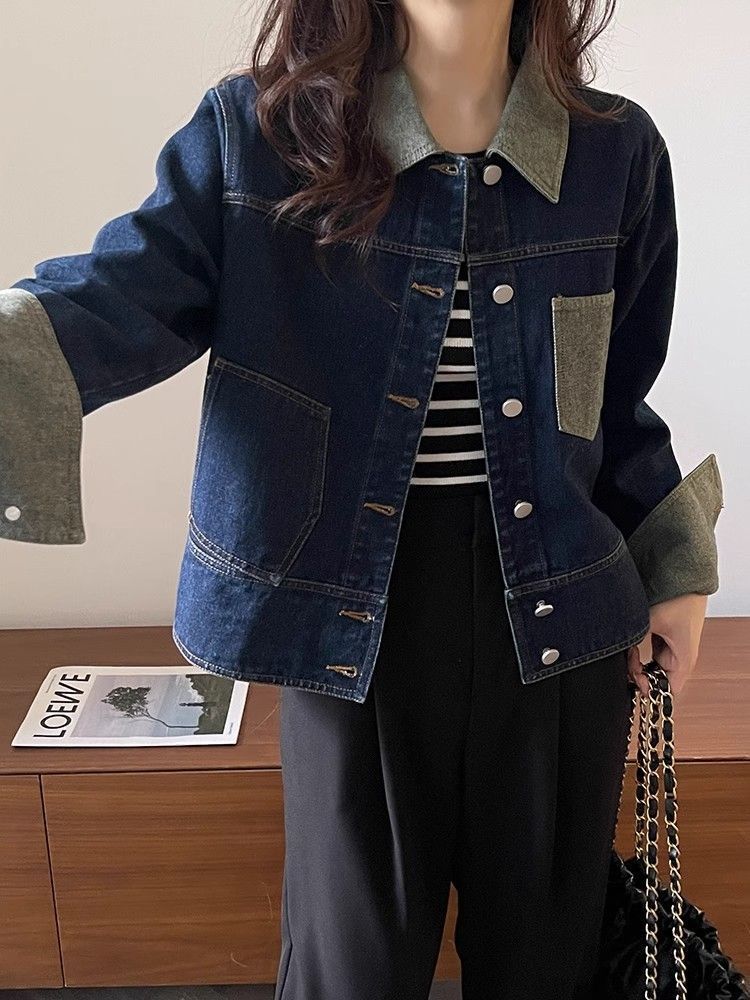 빈티지 콘트라스트 컬러 프록 데님 재킷 여성의 봄과 가을 새로운 하이 엔드 짧은 BF 스타일 작은 재킷 트렌디 탑스토어 가기