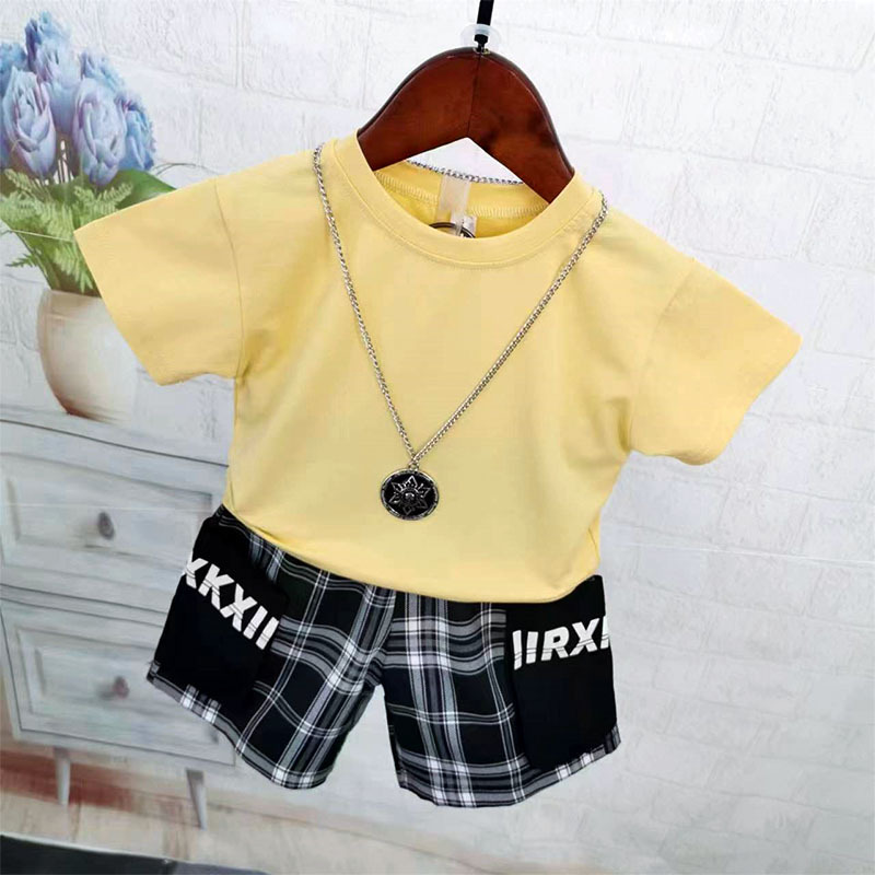 • F00114 노란색 반팔 T+F00142 검은색 체크무늬 바지