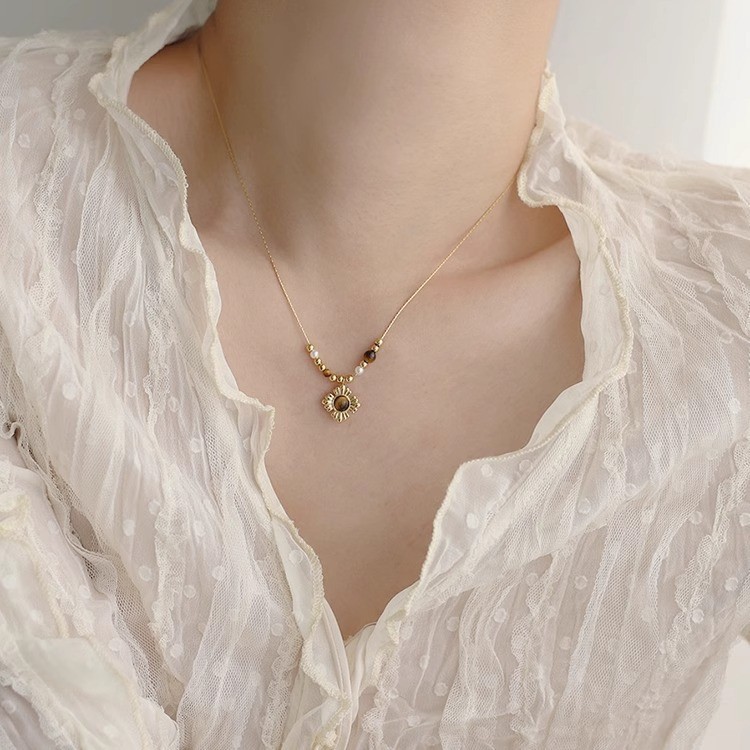 진한 베이지 마일라드 골동품 꽃 호랑이 눈 구슬 쇄골 체인 여성 틈새 디자인 고급 레트로 목걸이스토어 가기