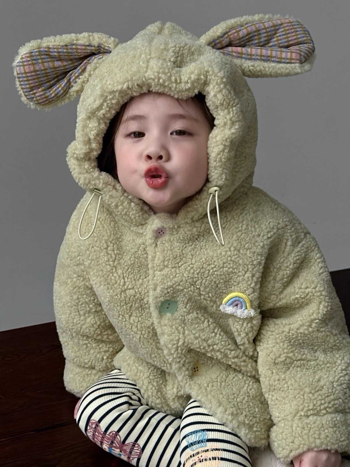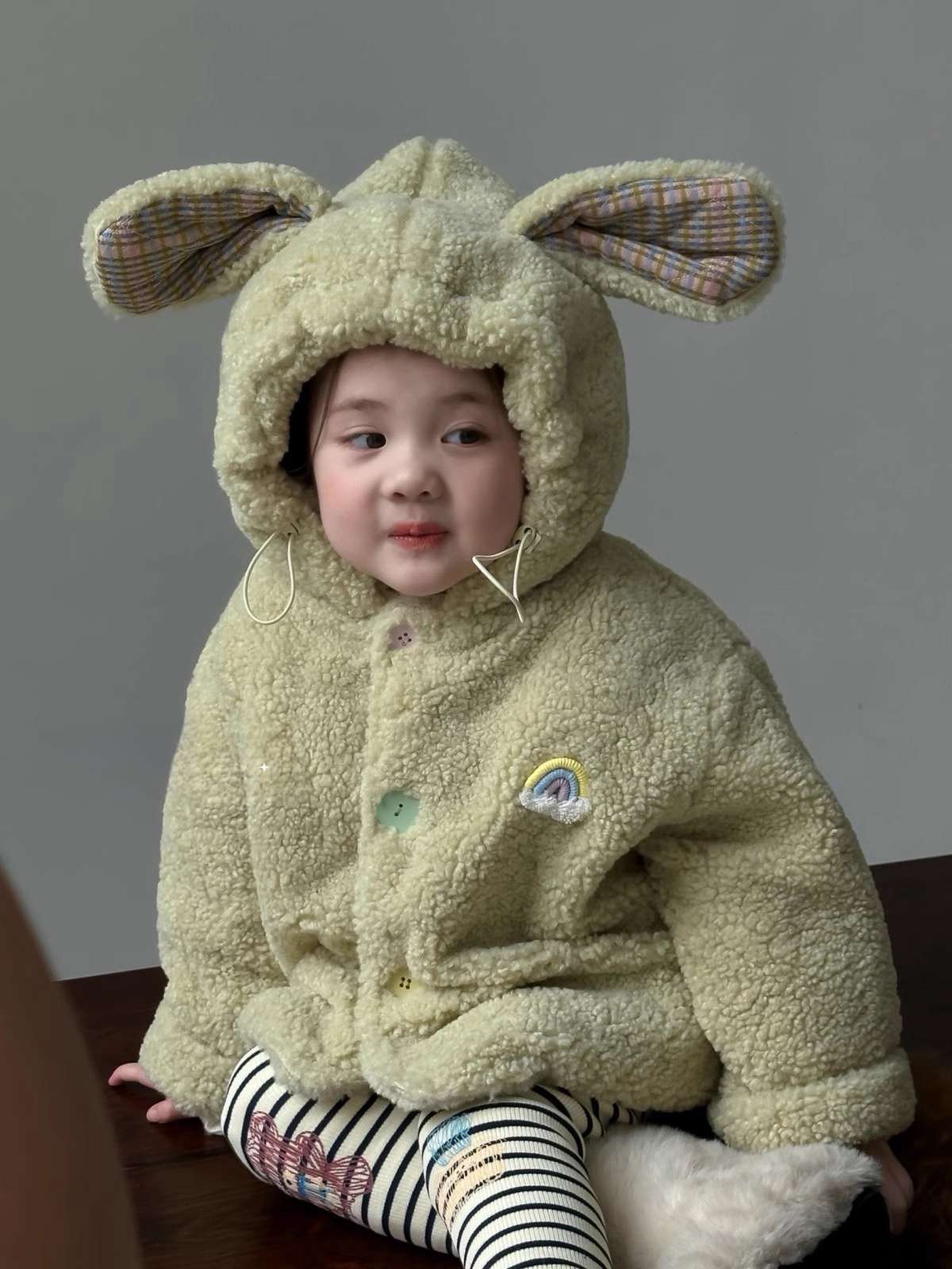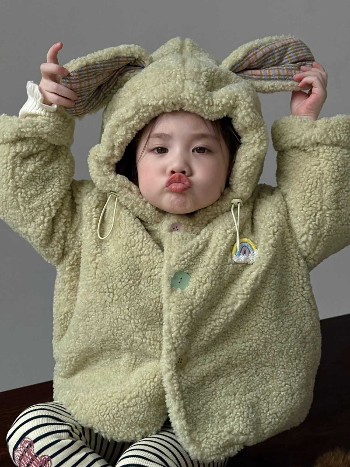 Tongxingyuan 한국 아동복 깊은 가을과 겨울 소녀 양고기 벨벳 자수 입체 귀 후드 코트 바지 세트