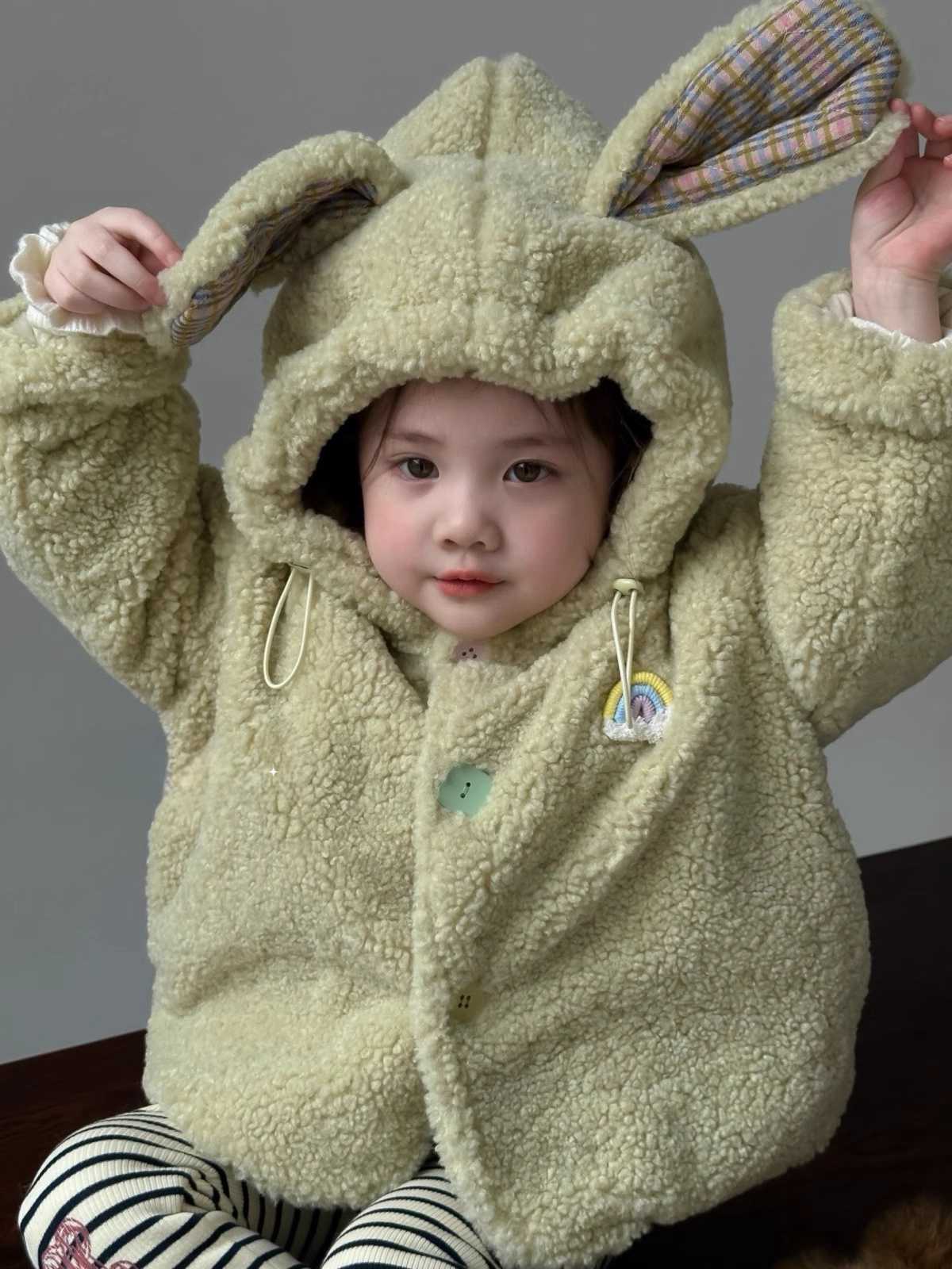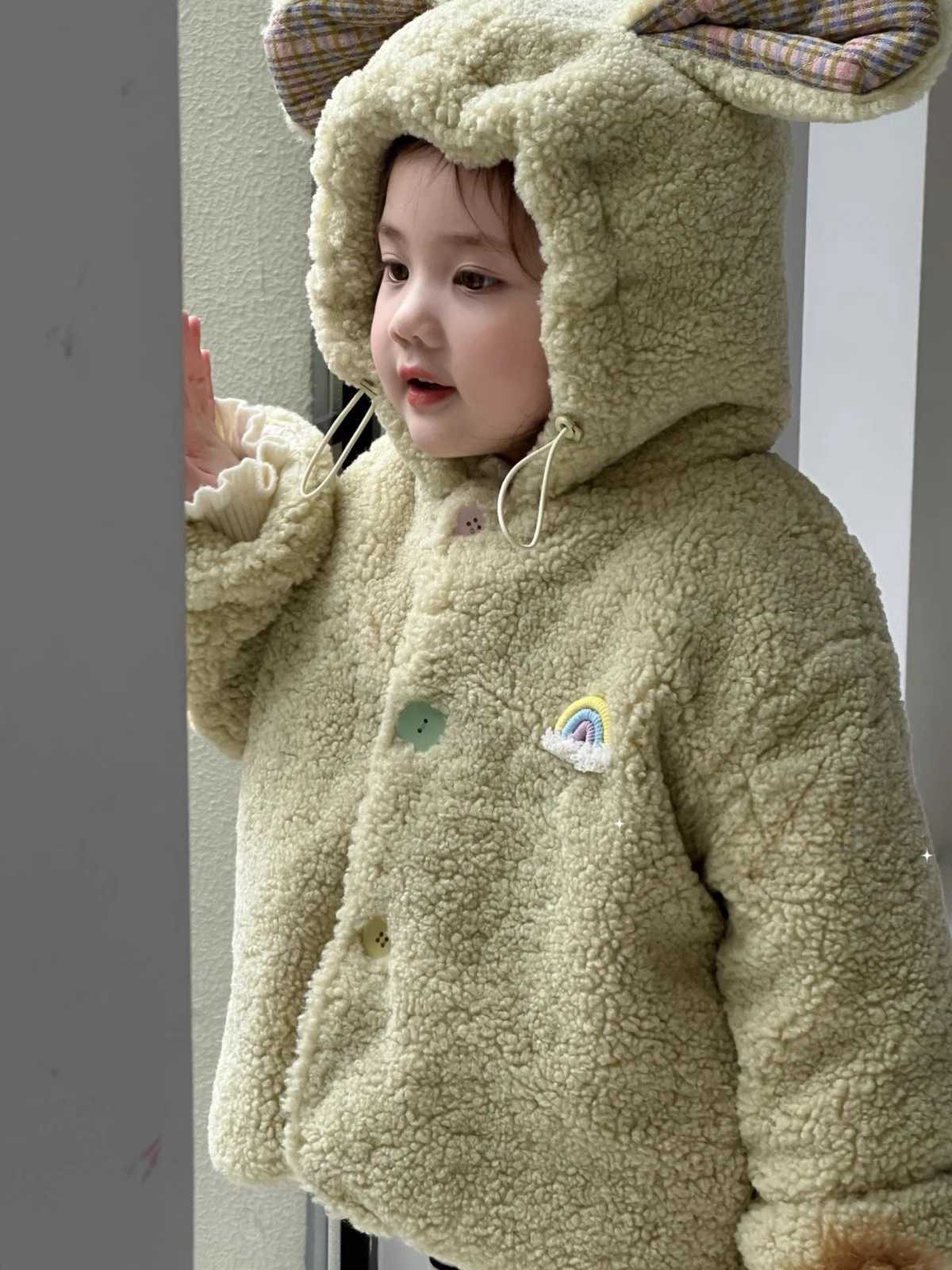 Tongxingyuan 한국 아동복 깊은 가을과 겨울 소녀 양고기 벨벳 자수 입체 귀 후드 코트 바지 세트스토어 가기