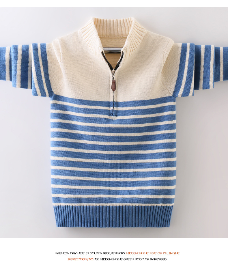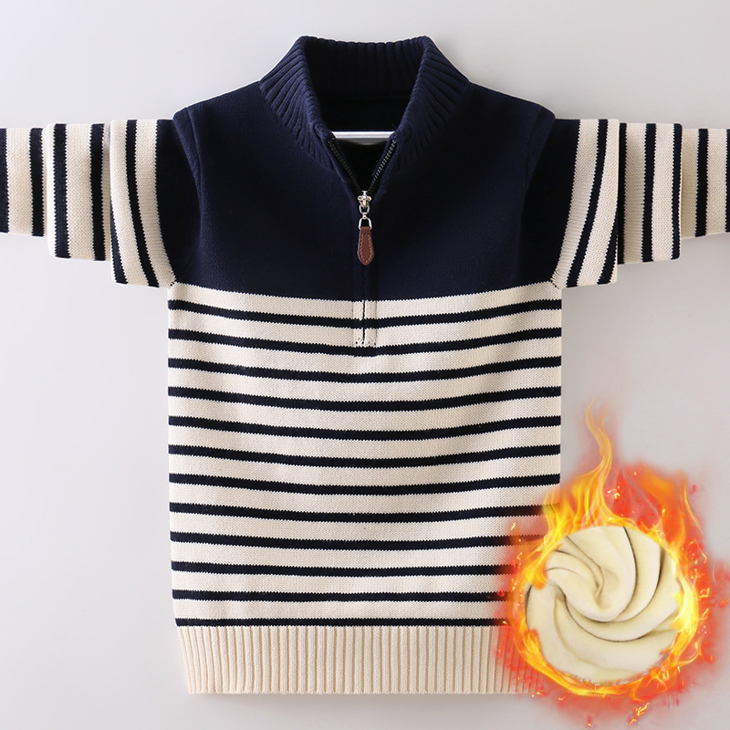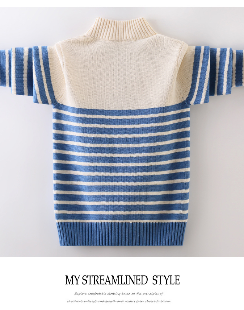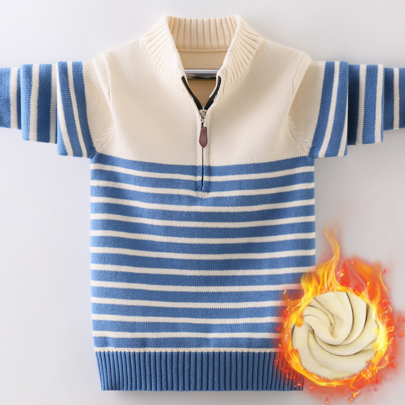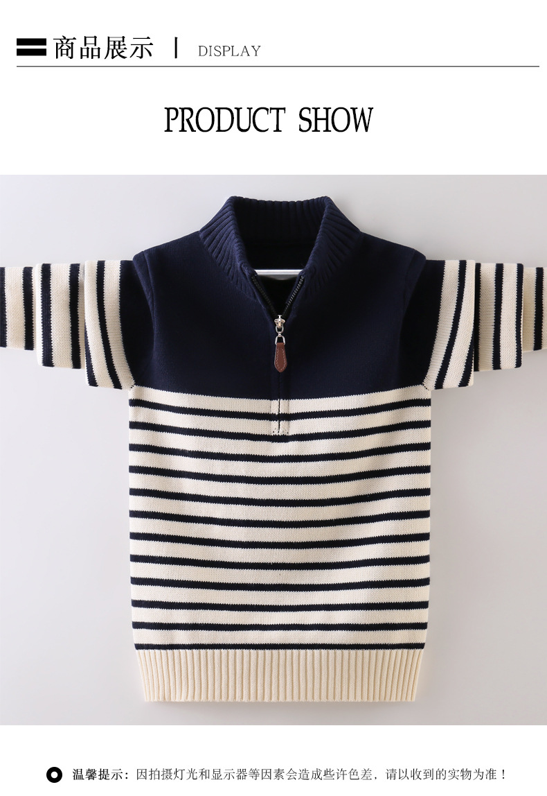 가을과 겨울 새 소년 기모 두꺼운 아동복 니트 셔츠 큰 어린이 만화 소년 줄무늬 면 지퍼 셔츠