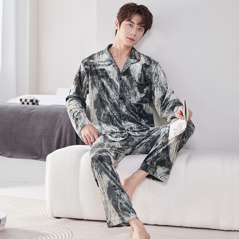 2024 가을과 겨울 새로운 남성 파자마 골드 벨벳 패딩 긴 소매 옷깃 카디건 세트 남성 플러스 사이즈 홈 의류스토어 가기