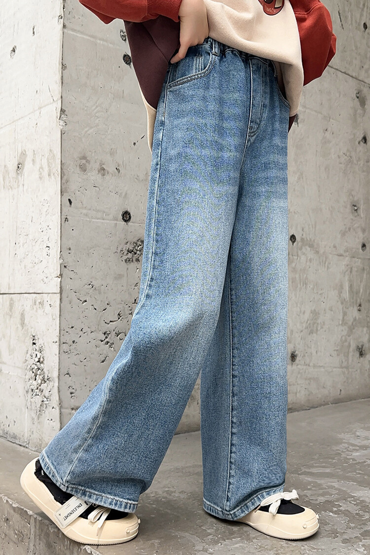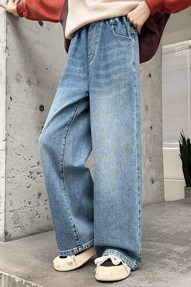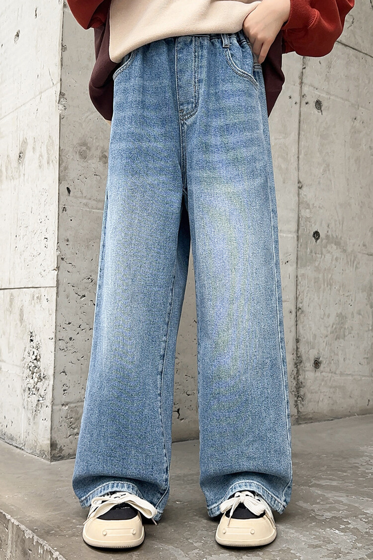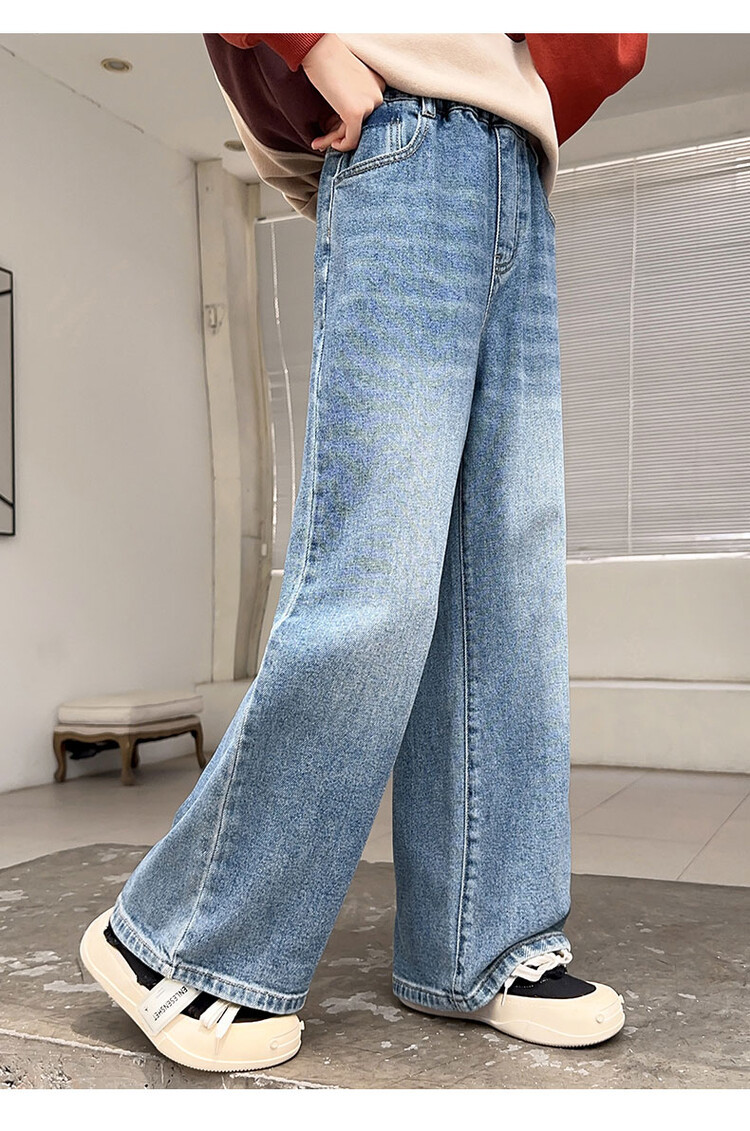 소녀 바지 봄과 가을 2024 새로운 어린이 가을 스트레이트 넓은 다리 바지 여성용 큰 어린이 느슨한 청바지