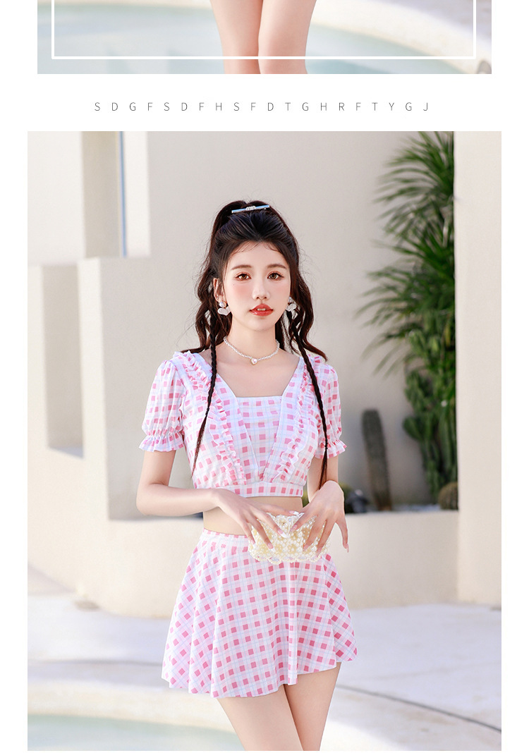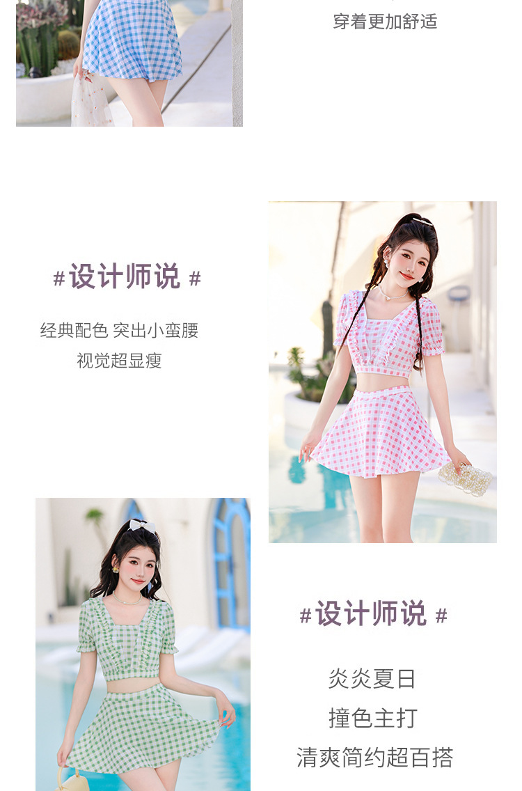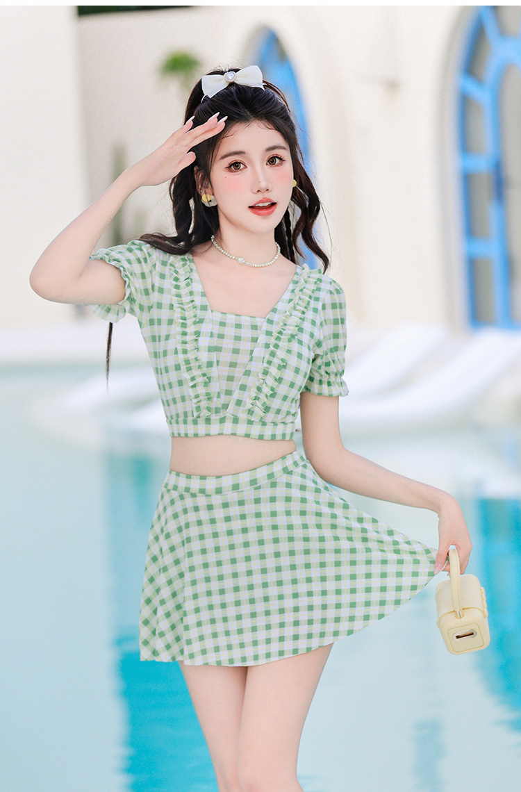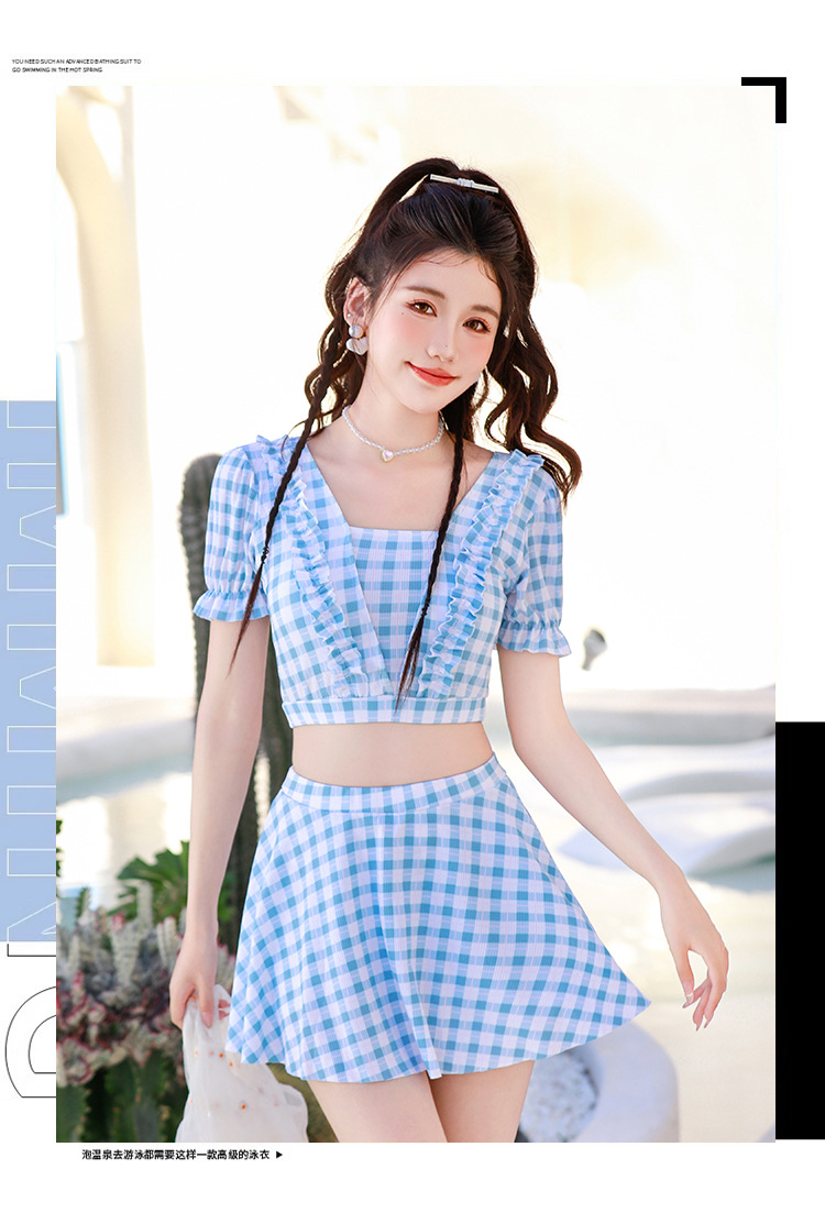 2024 새로운 분할 수영복 여성용 격자 무늬 스커트 투피스 세트 보수적 인 높은 허리 슬리밍 신선한 수영복스토어 가기