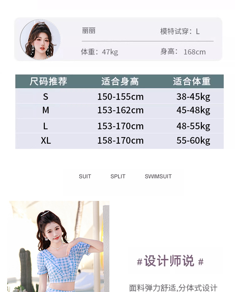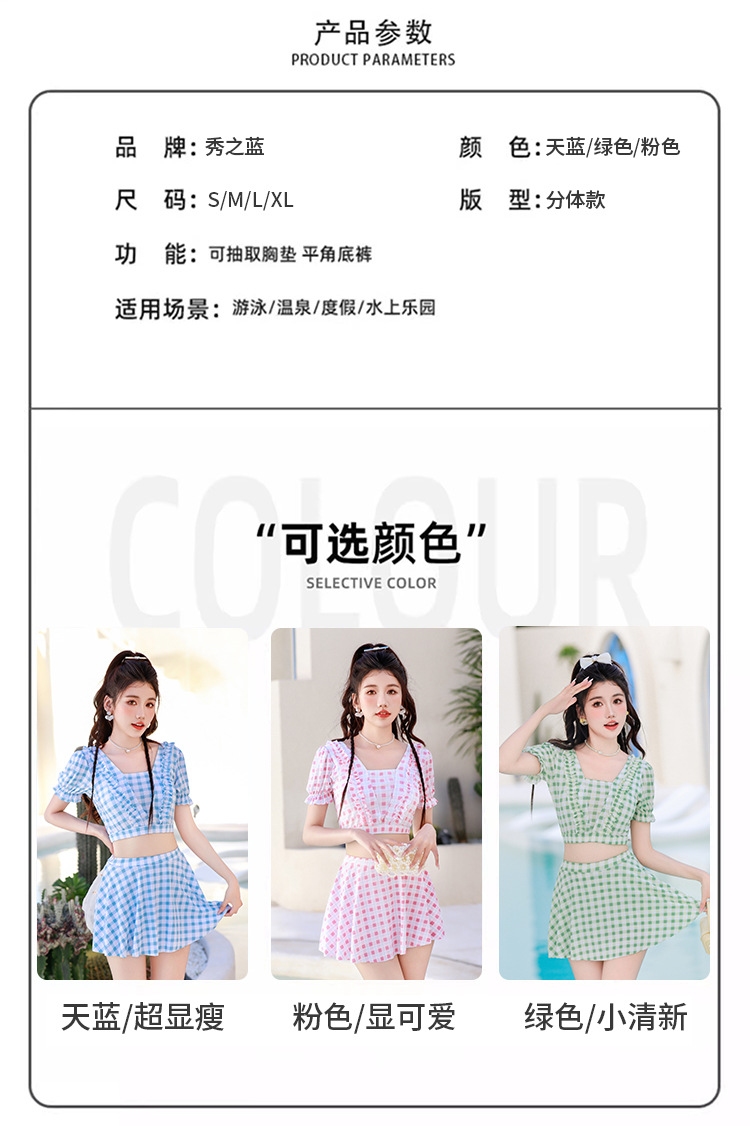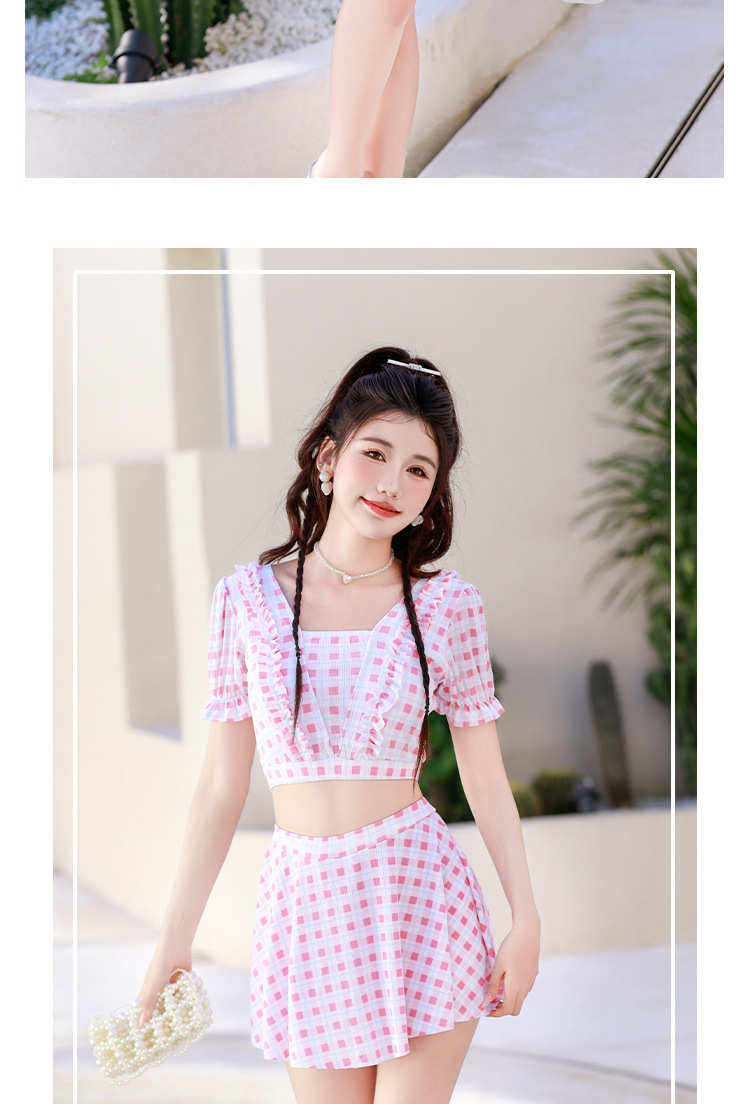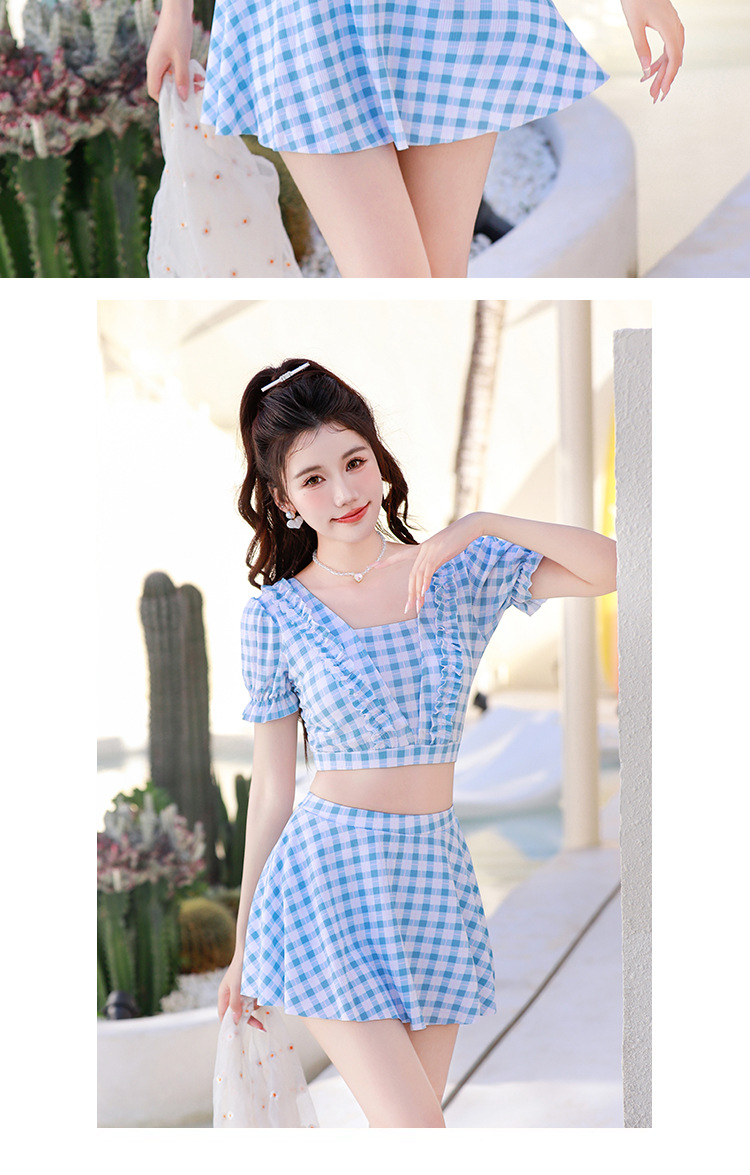 2024 새로운 분할 수영복 여성용 격자 무늬 스커트 투피스 세트 보수적 인 높은 허리 슬리밍 신선한 수영복스토어 가기