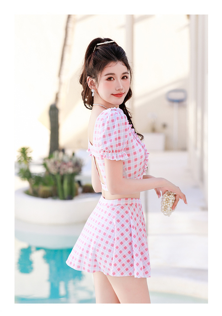 2024 새로운 분할 수영복 여성용 격자 무늬 스커트 투피스 세트 보수적 인 높은 허리 슬리밍 신선한 수영복