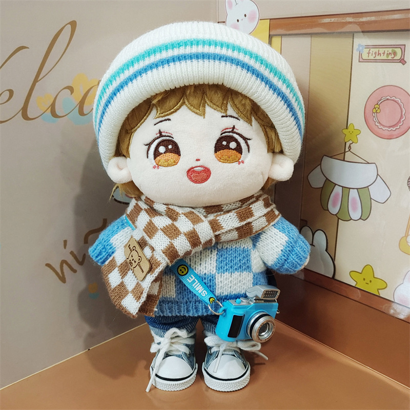 • Tang Jiuzhou + 파란색과 흰색 체크 무늬 스웨터, 갈색과 흰색 스카프 6종 세트/데님 신발