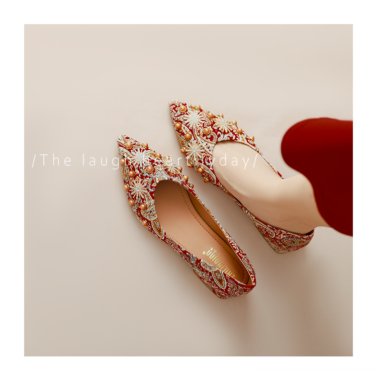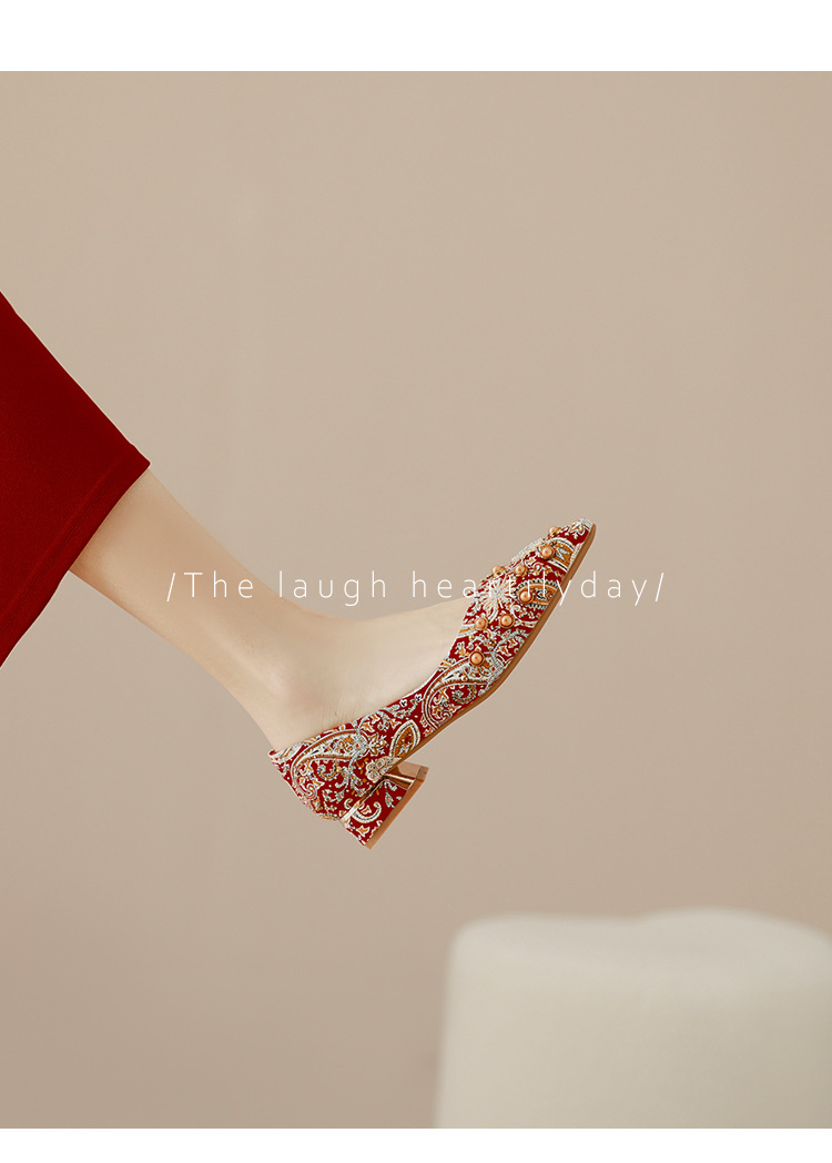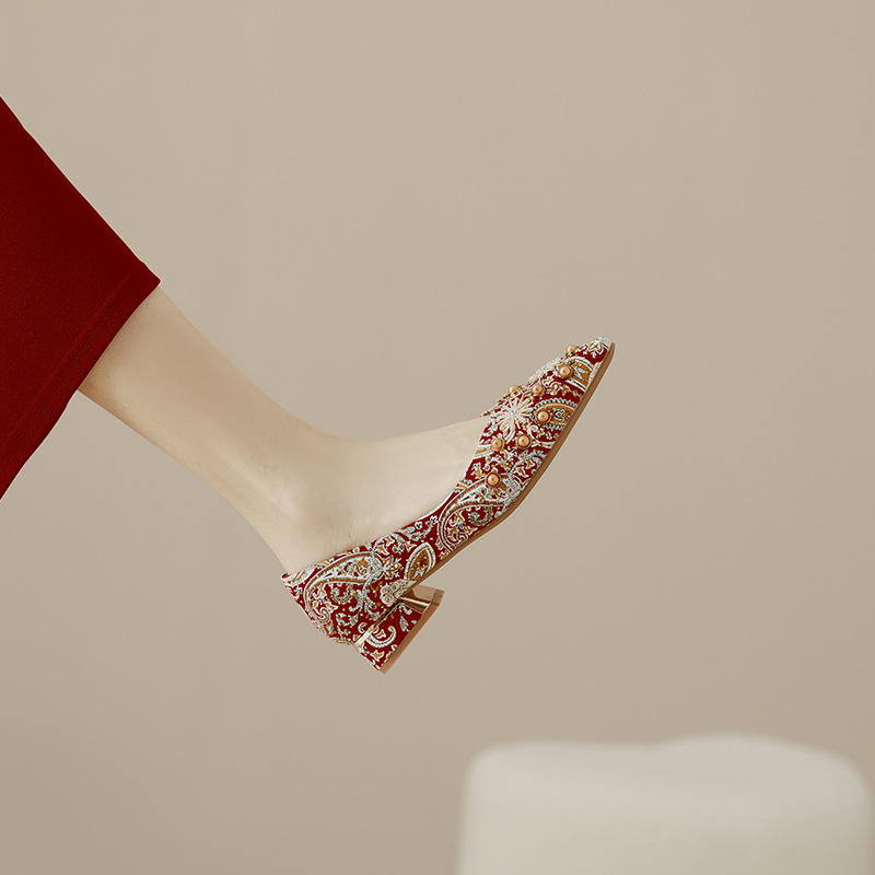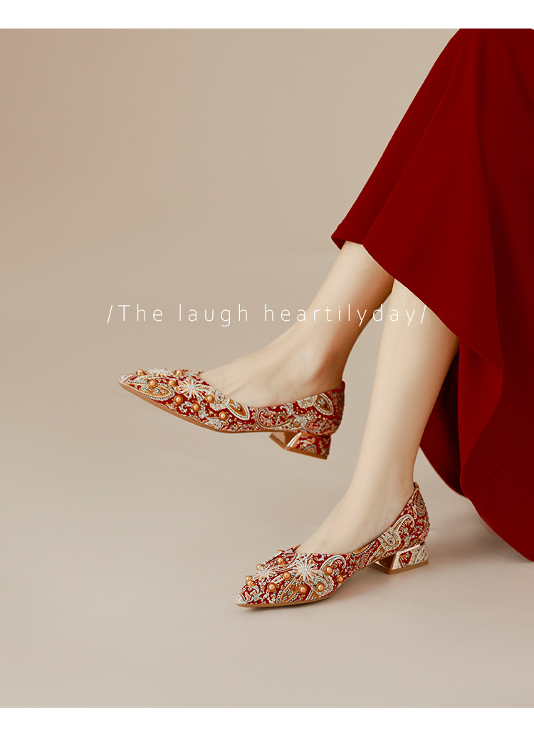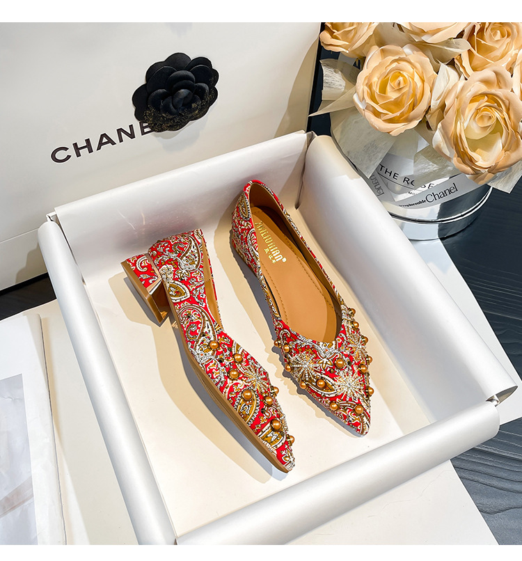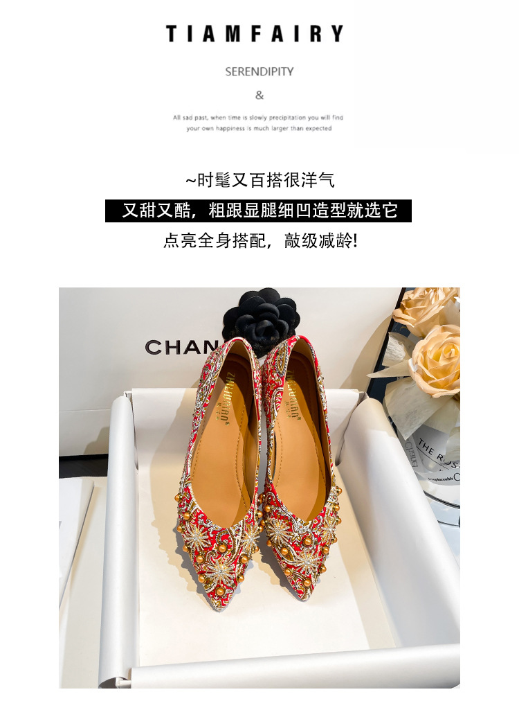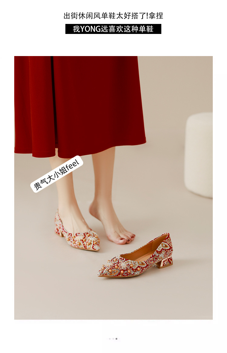 66-A9 웨딩 슈즈 가을과 겨울 2024 새로운 포인팅 슈즈 두꺼운 힐 미들 라인스톤 핸드 메이드 올 매치 슈즈 슈즈