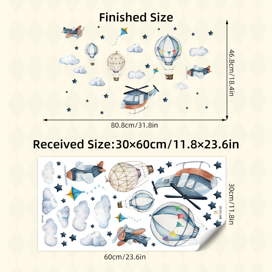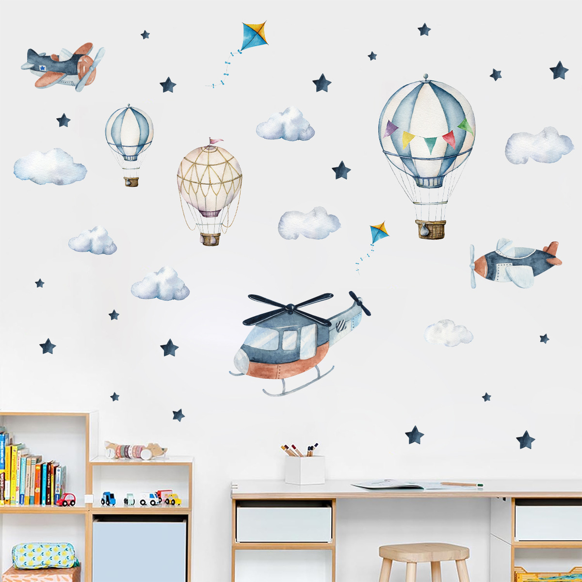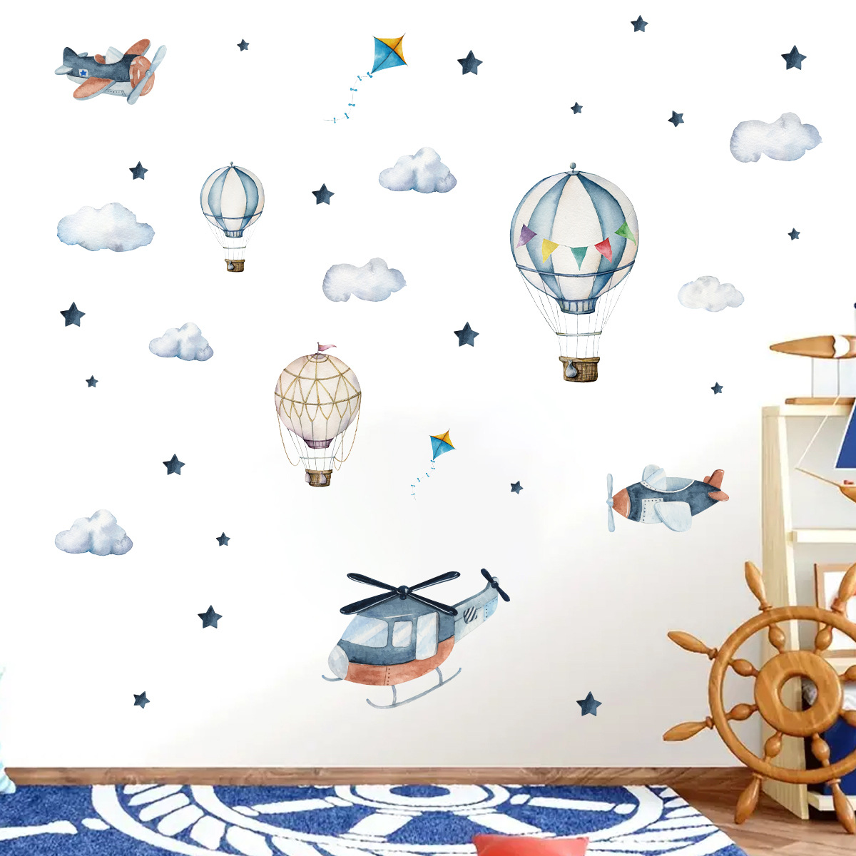 BR1053E 만화 열기구 구름 헬리콥터 셀프 접착 벽 스티커 ins 어린이 방 유치원 장식 스티커스토어 가기