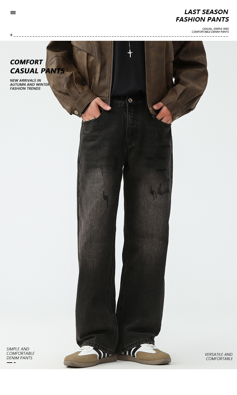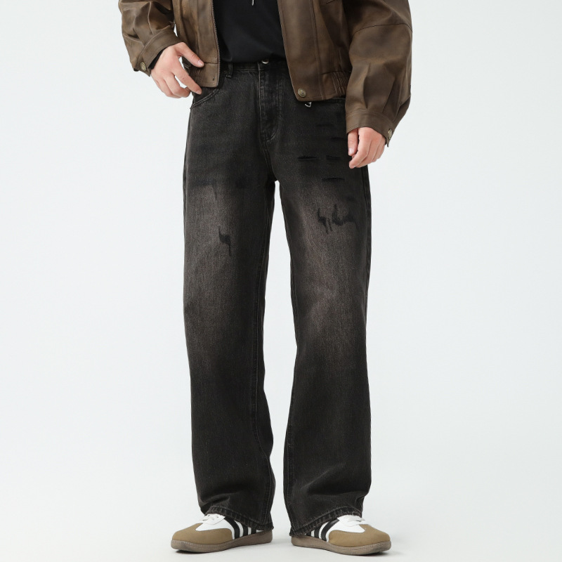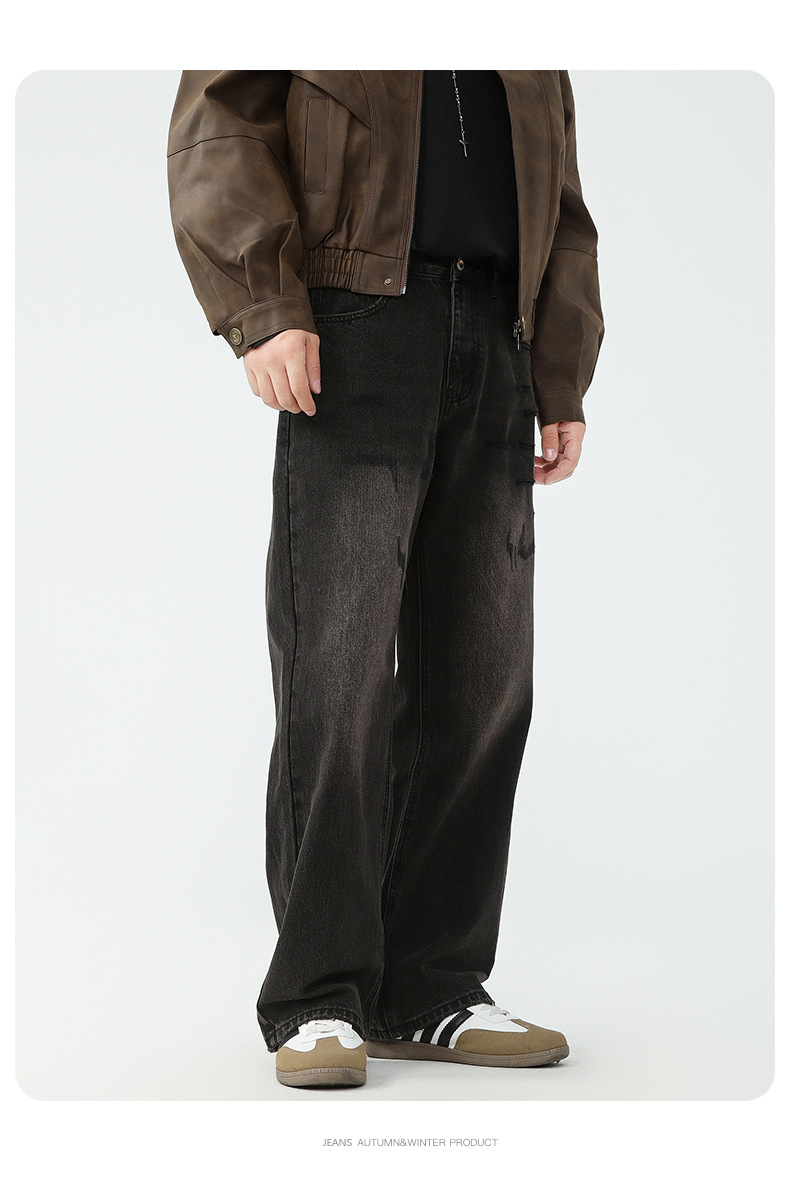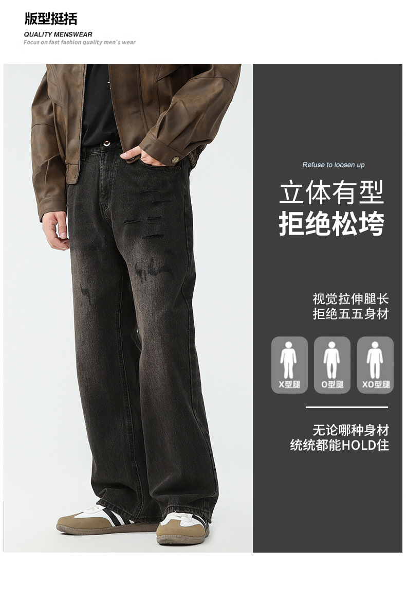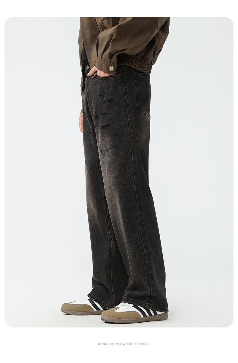Muqiu 남성복 ∠ American High Street Ripped 청바지 남성용 클린 핏 트렌디 브랜드 레트로 느슨한 스트레이트 바지스토어 가기