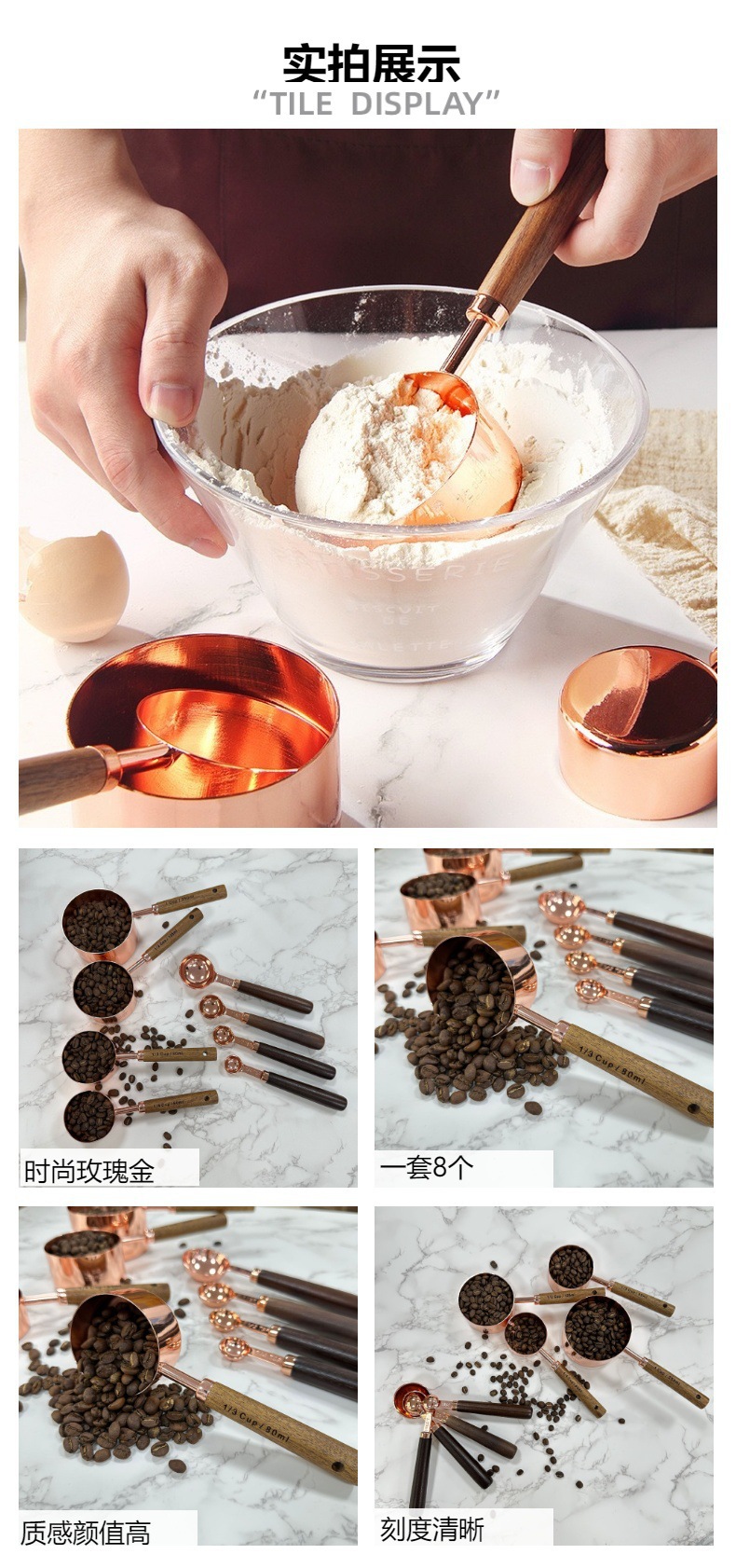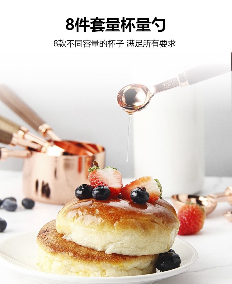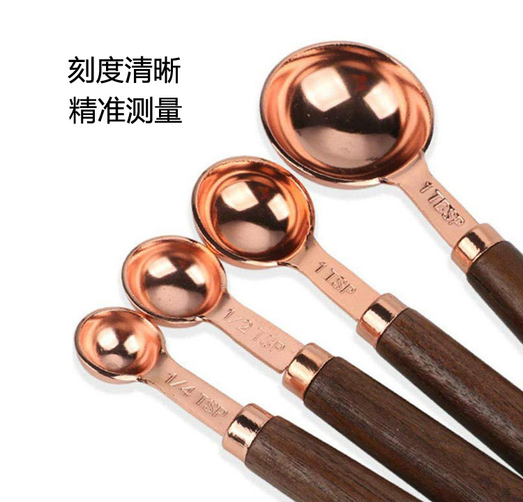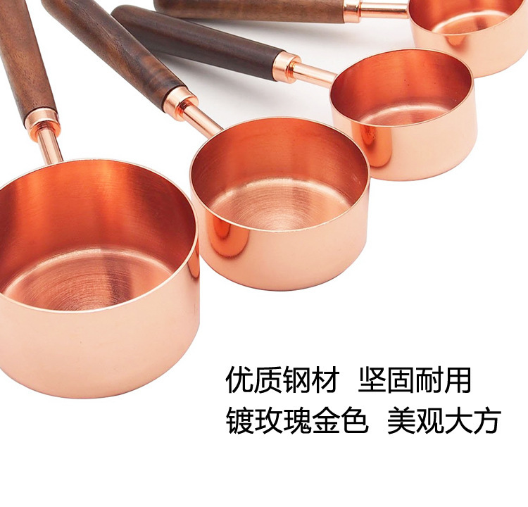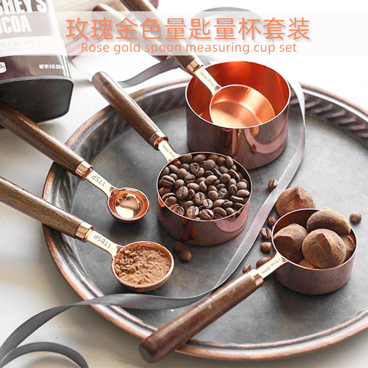 产品名称:8件套木柄玫瑰金量杯量匙套装