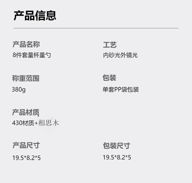 产品规格:4件套量杯:368.9g      4件套量匙:129.5g