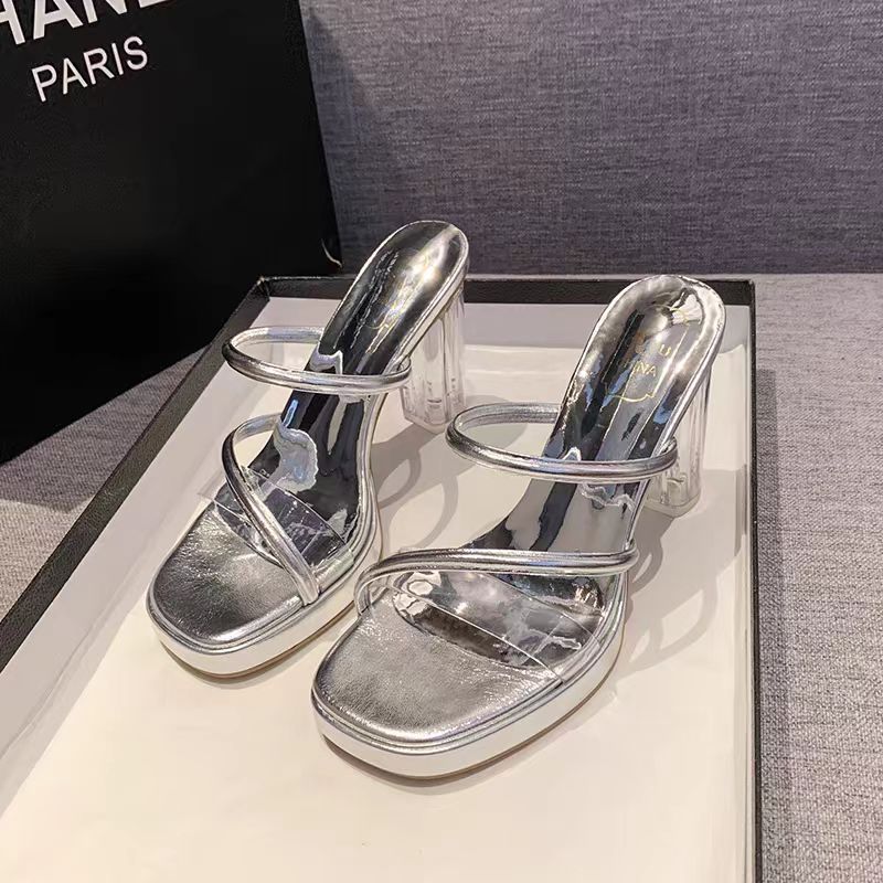 크리스탈 투명 굵은 굵은 대형 신발 2024 여름 새 스타일 간단한 하이힐 샌들, 외부 착용을위한 하나의 단어 스트랩 간단한 여성용 신발