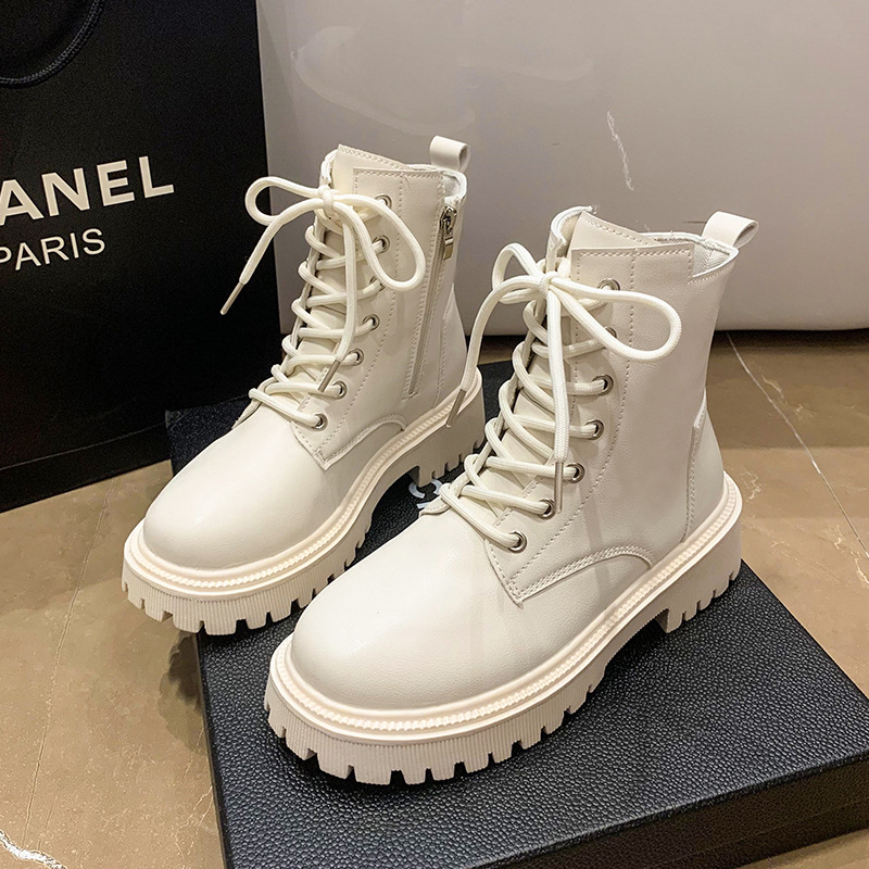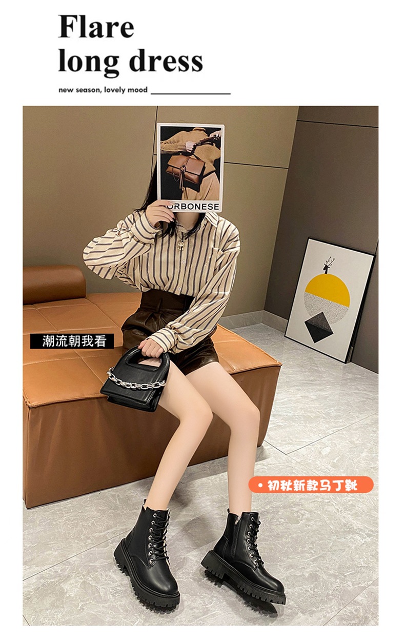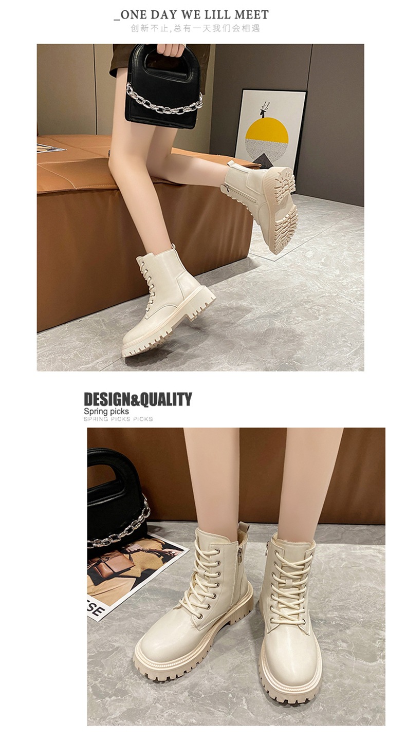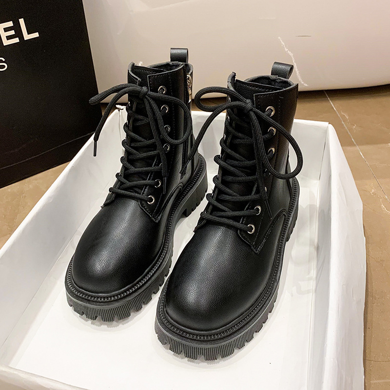 마틴 부츠 여성 신발 2024 년 봄과 가을 새로운 하이 탑 캐주얼 두꺼운 밑창 짧은 부츠 루트 레이스 업 기모 오토바이 부츠 여성스토어 가기