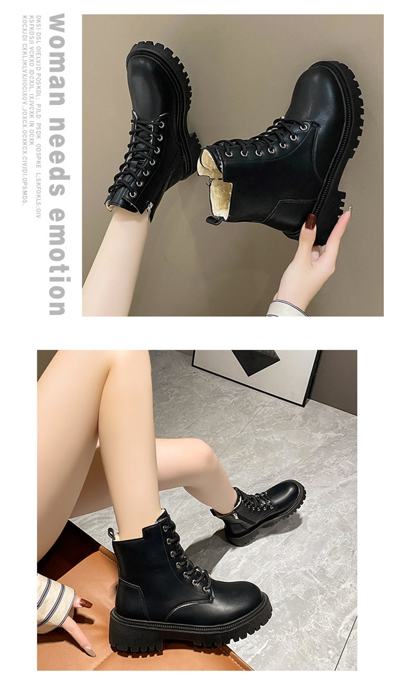 마틴 부츠 여성 신발 2024 년 봄과 가을 새로운 하이 탑 캐주얼 두꺼운 밑창 짧은 부츠 루트 레이스 업 기모 오토바이 부츠 여성