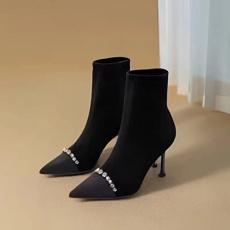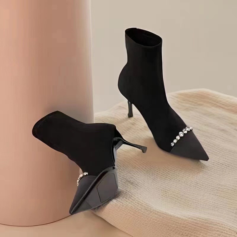 주주가의 프렌치 스타일 워터드 라인스톤 뾰족코 얇은 굽 하이힐 숏부츠 2025 가을 겨울 신상 탄력 슬림 부츠 26B890스토어 가기