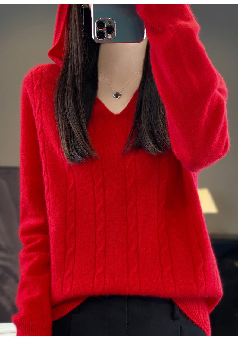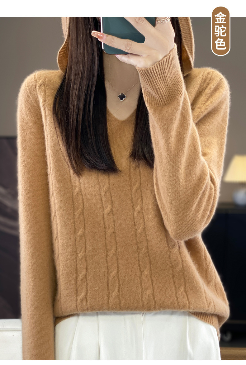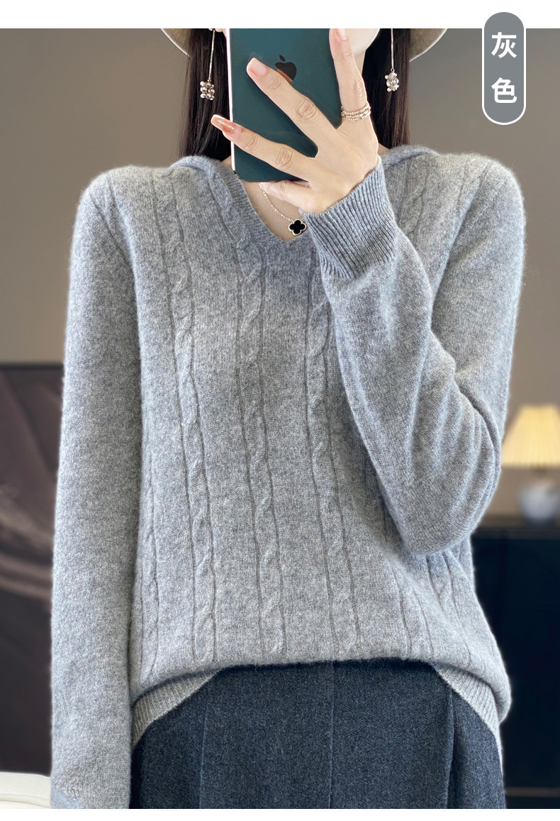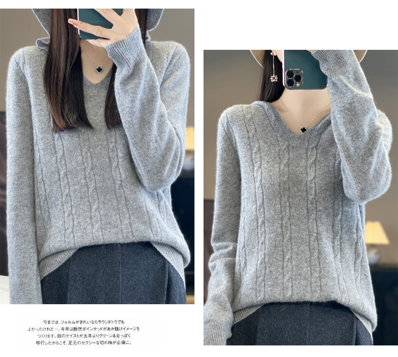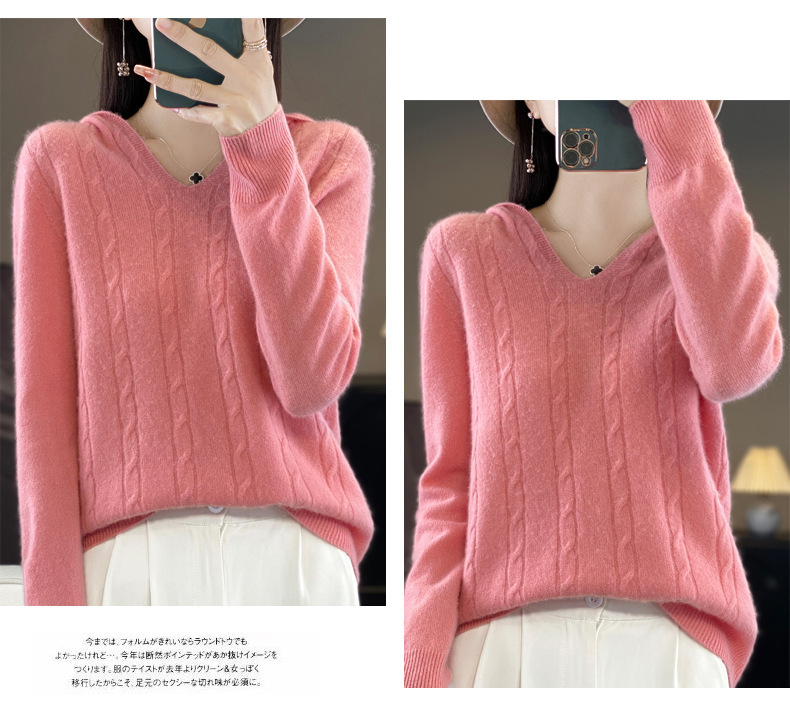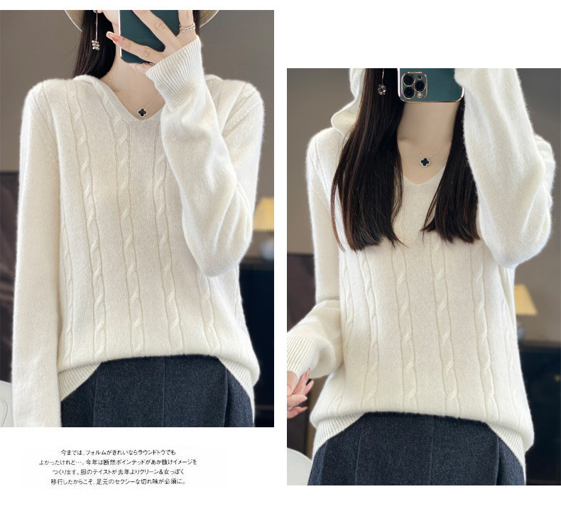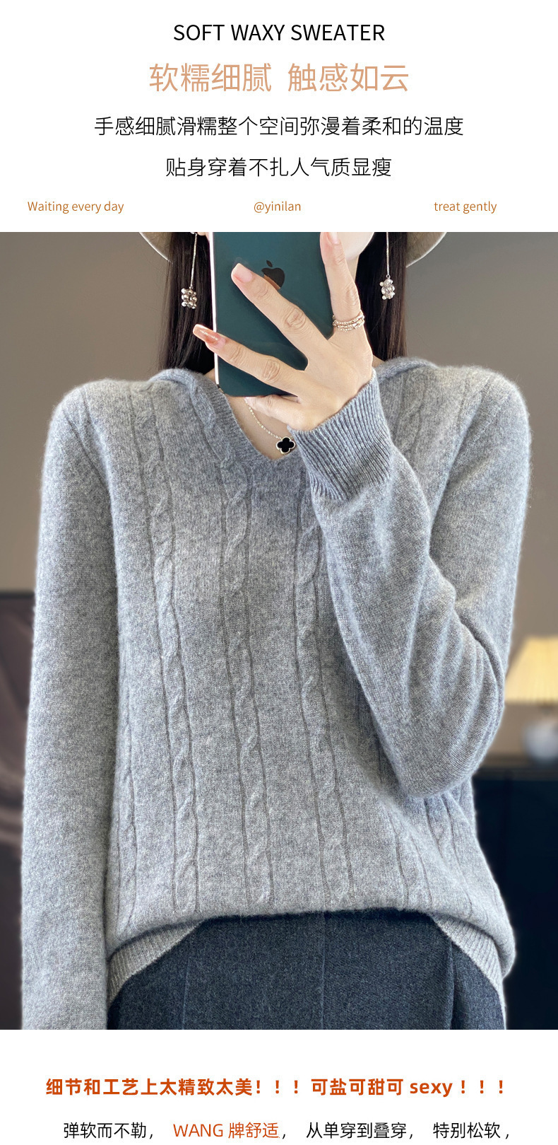 V-Neck Twisted Hoodie 여성용 순수 양모 스웨터 가을과 겨울 풀오버 새로운 느슨한 게으른 부드러운 왁스 스웨터 탑 틈새스토어 가기
