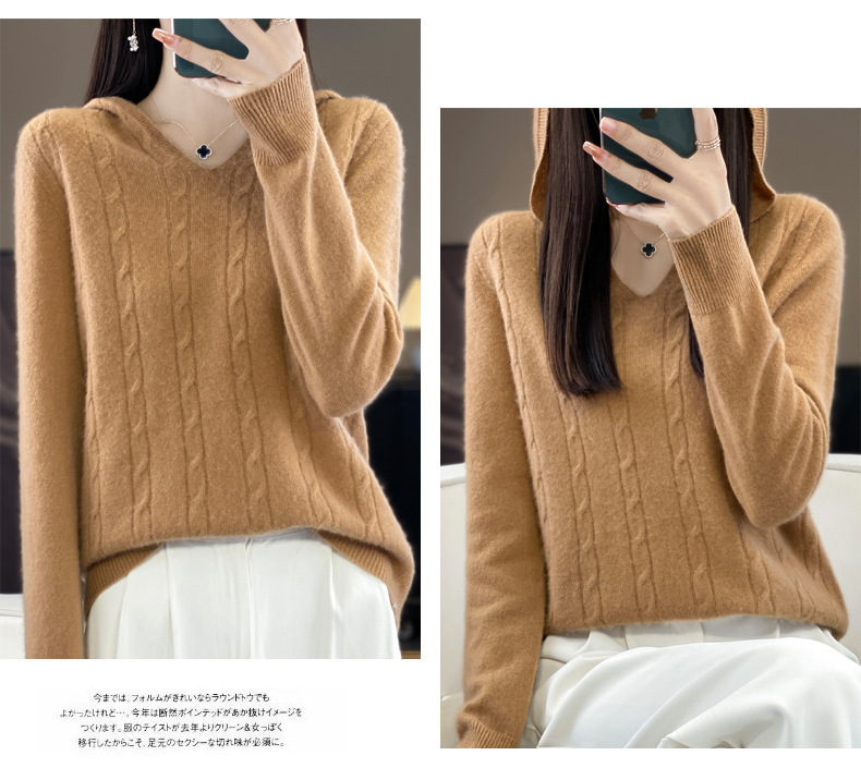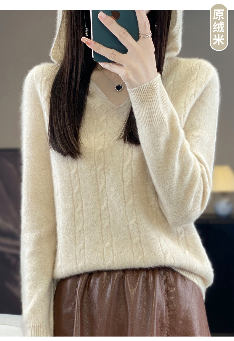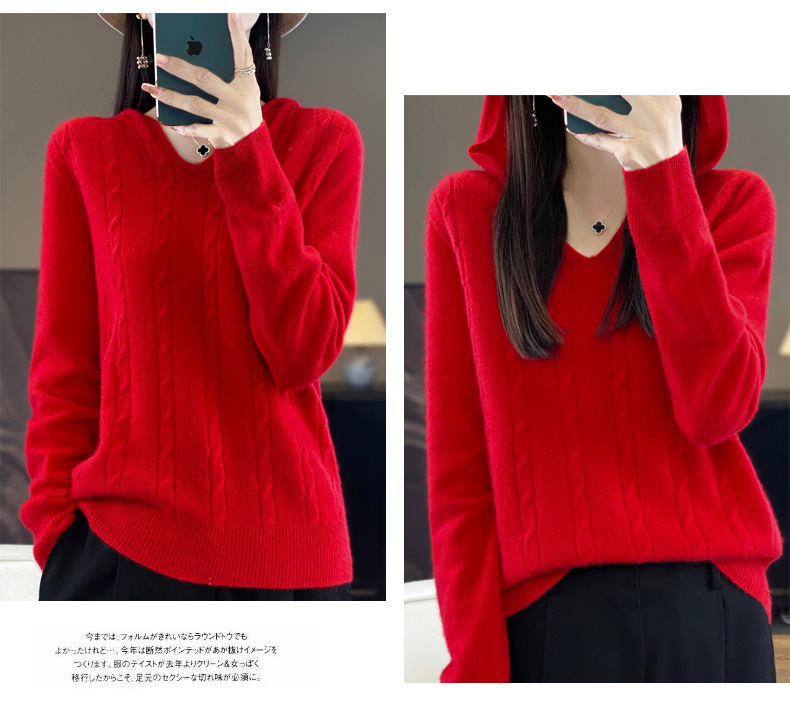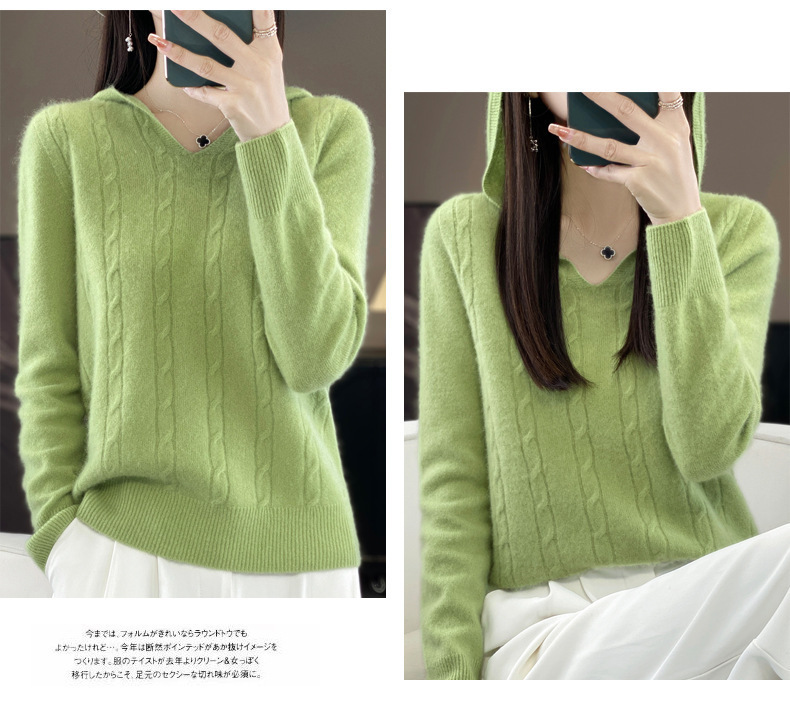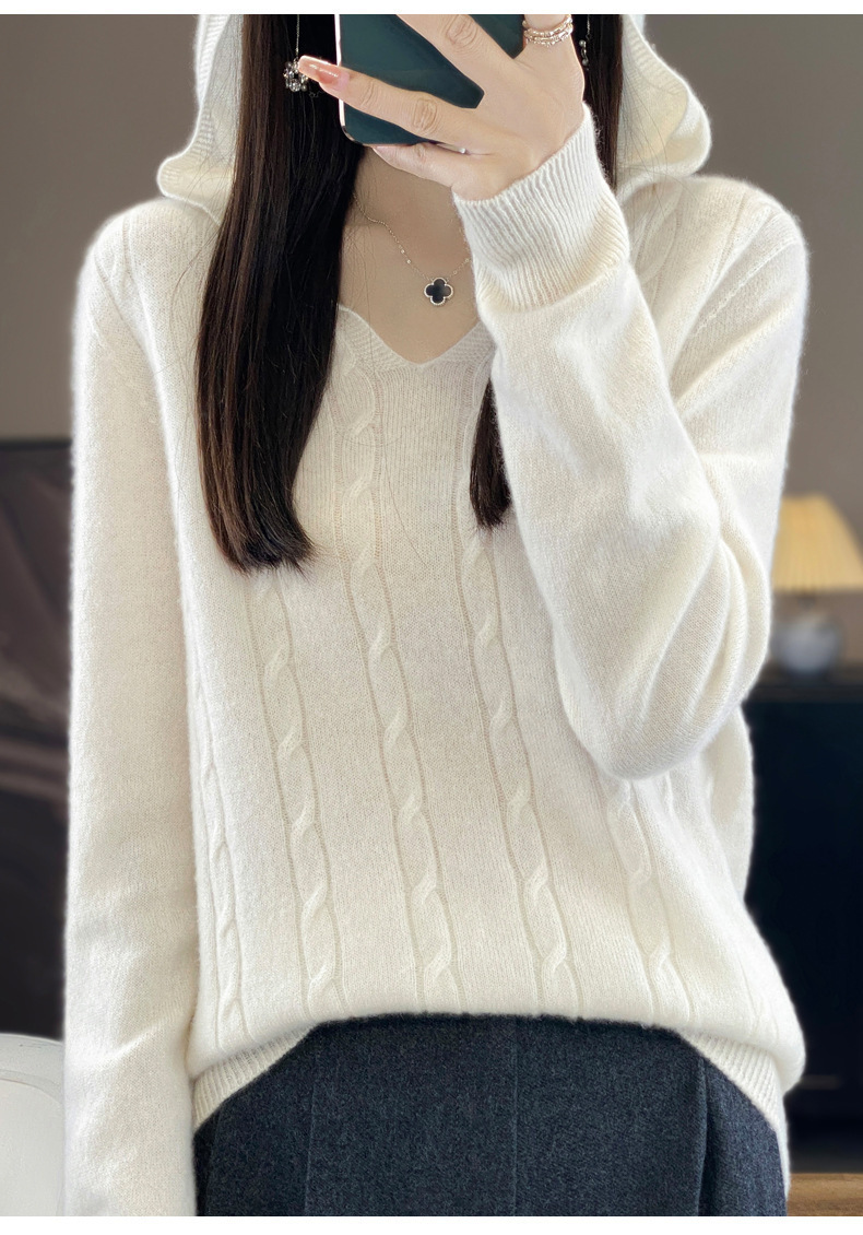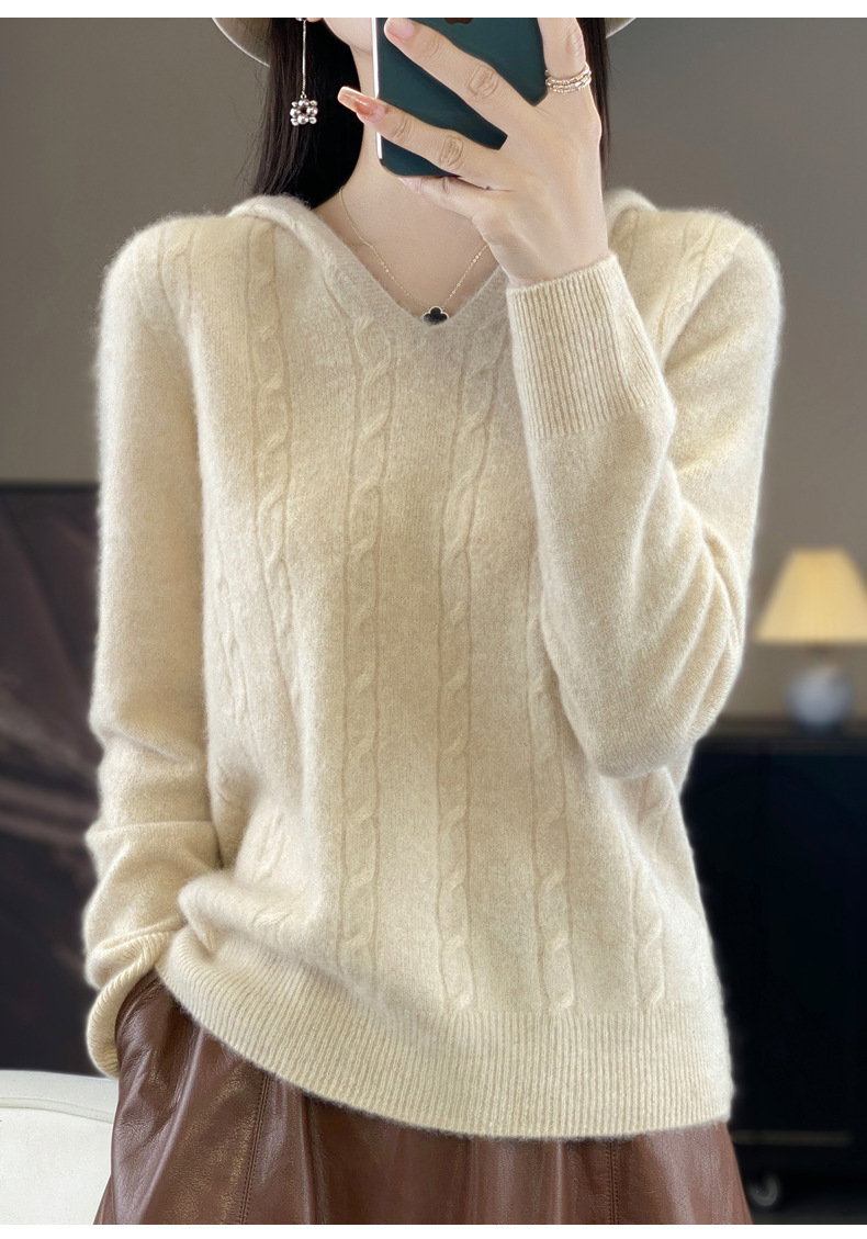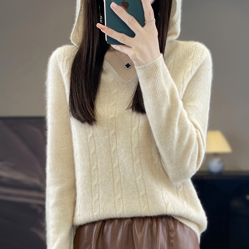 V-Neck Twisted Hoodie 여성용 순수 양모 스웨터 가을과 겨울 풀오버 새로운 느슨한 게으른 부드러운 왁스 스웨터 탑 틈새스토어 가기