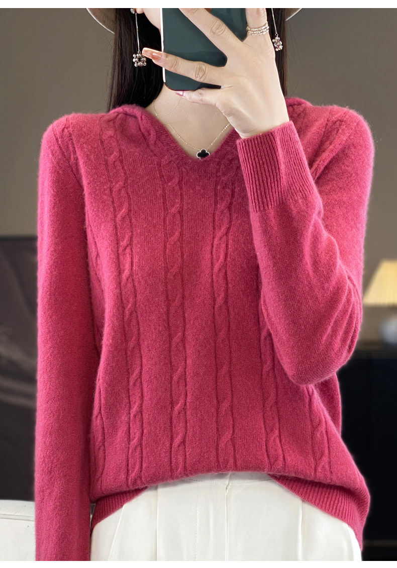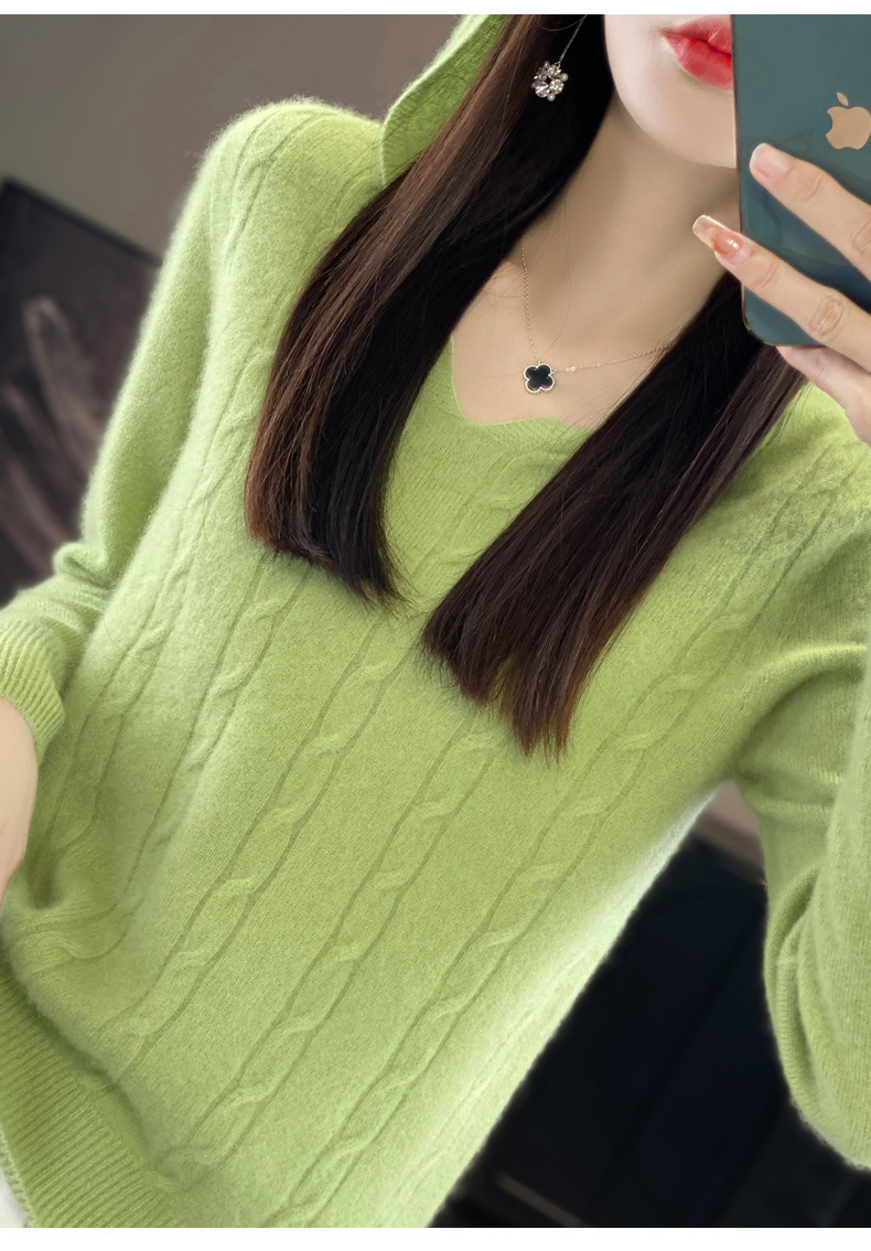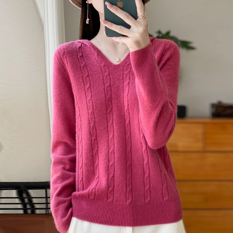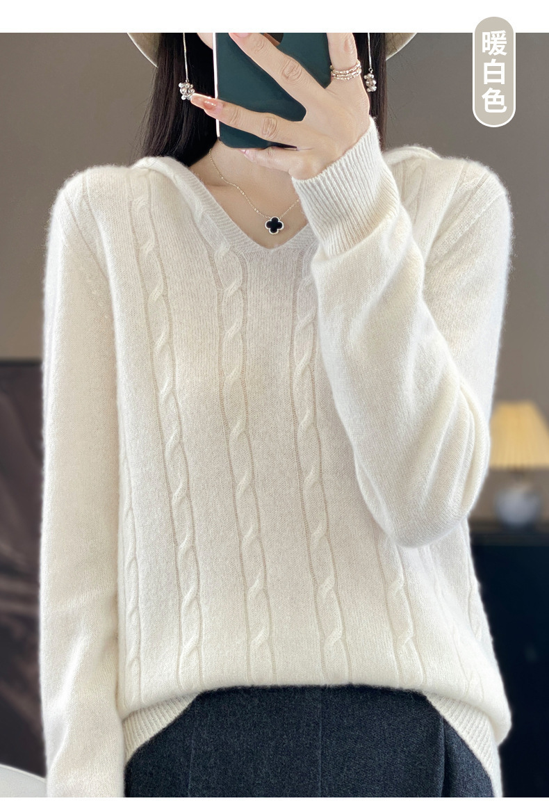 V-Neck Twisted Hoodie 여성용 순수 양모 스웨터 가을과 겨울 풀오버 새로운 느슨한 게으른 부드러운 왁스 스웨터 탑 틈새
