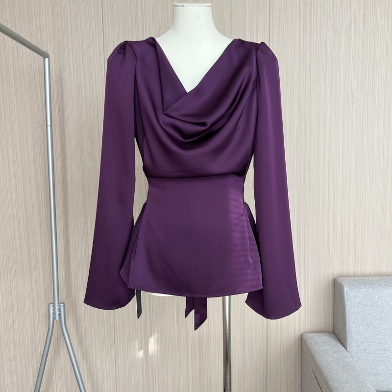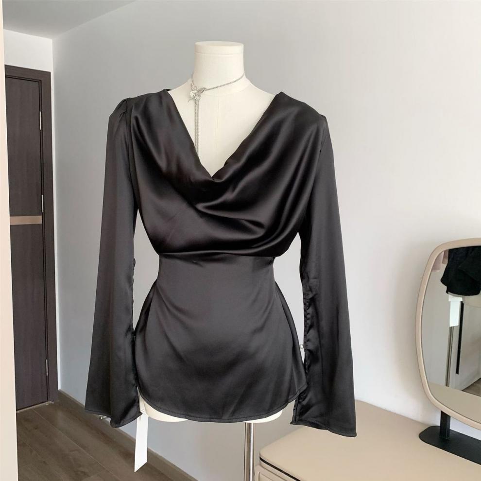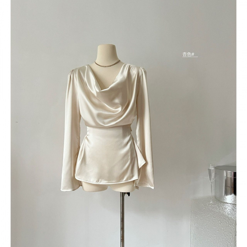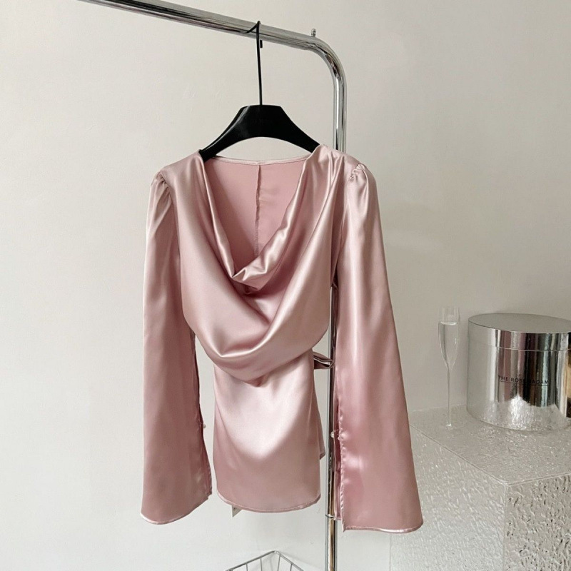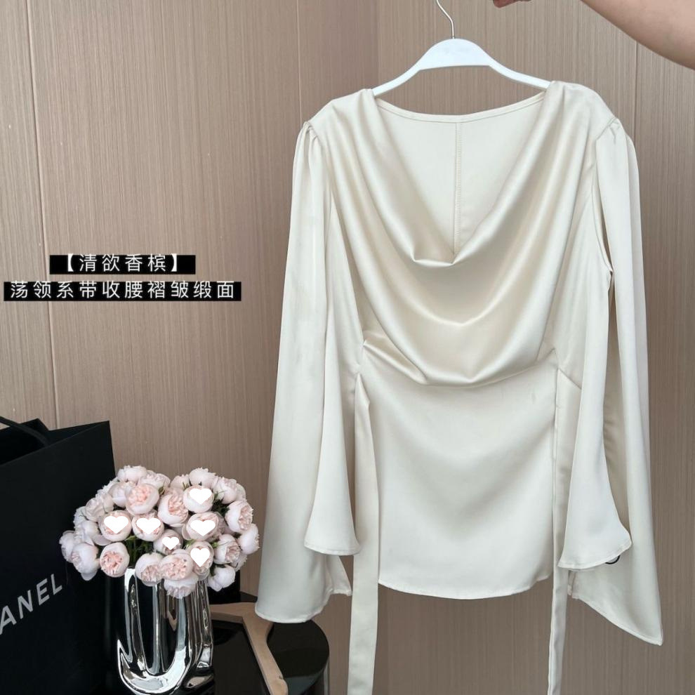 프랑스 새틴 우아한 고급 긴팔 셔츠 여성용 봄 새 스윙 칼라 느슨한 레이스 업 웨이스트 셔츠 탑