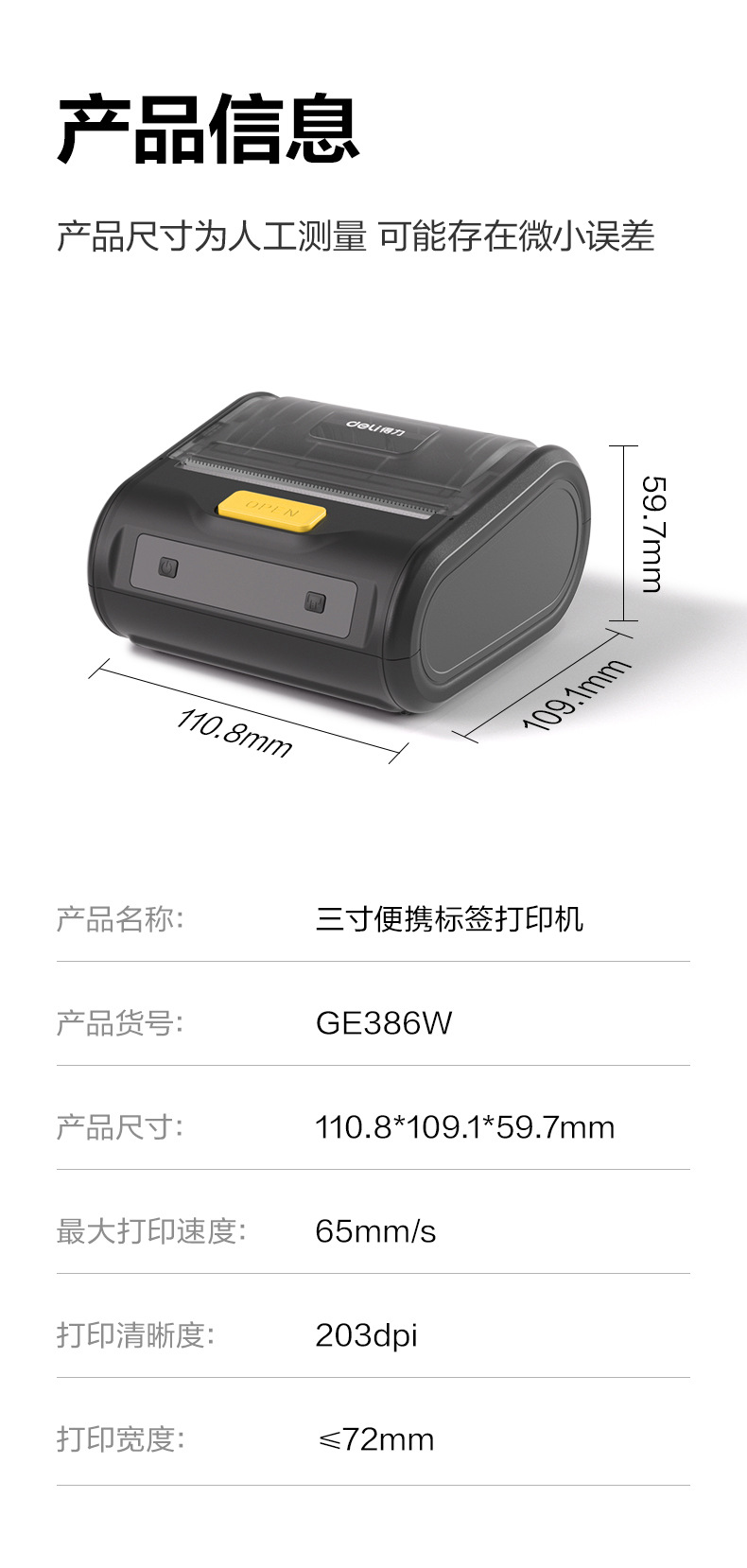 델리 GE386W 익스프레스 싱글 플레이어 휴대용 휴대 전화 블루투스 포스트 스테이션 부두 코드 라벨 기계 바코드 프린터