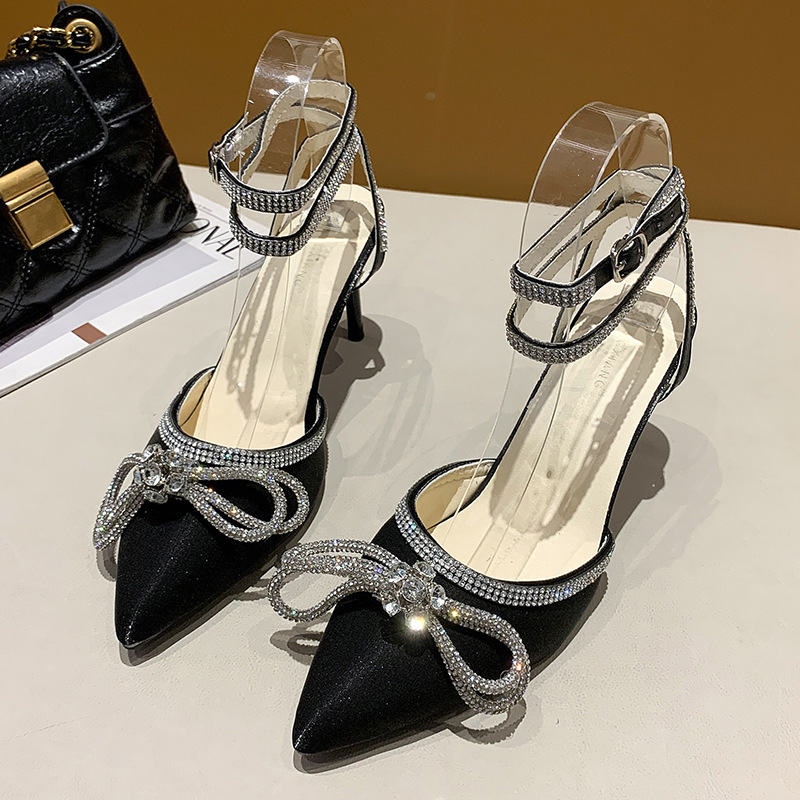 라인스톤 쿨 페어리 스타일 2024 새로운 여름 블랙 우아한 하이힐을 가진 섹시한 포인팅 얇은 힐 신발스토어 가기
