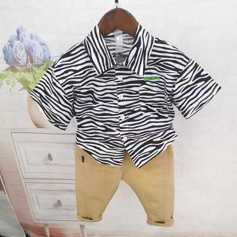 소년 반팔 얼룩말 셔츠 어린이 중소형 어린이 느슨한 서양식 셔츠 캐주얼 바지 잘 생긴 투피스 세트 아기 트렌디