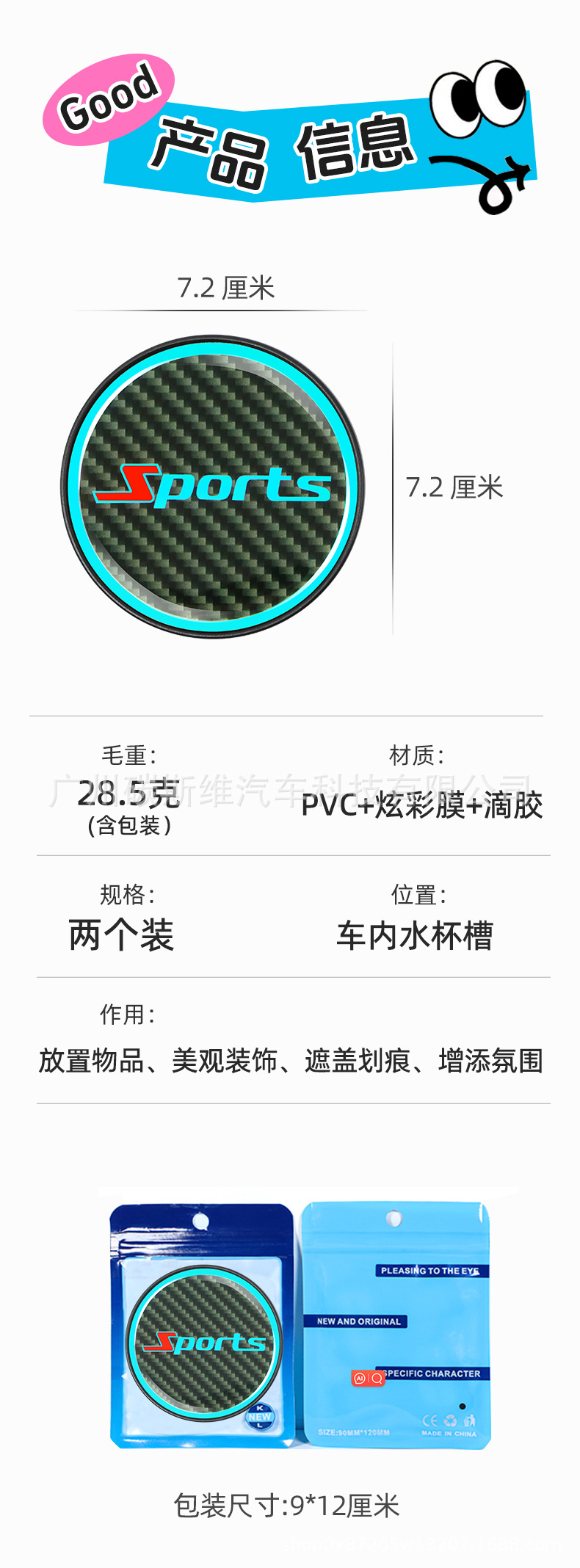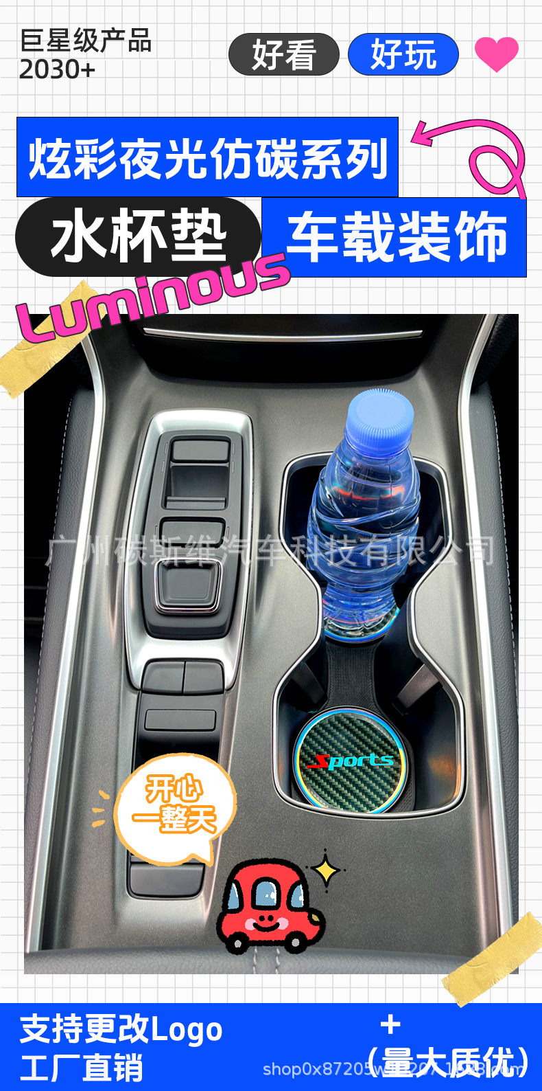 국경 새로운 탄소 섬유 패턴 자동차 발광 컵 패드 맞춤형 라운드 범용 럭셔리카 로고 인테리어 제품