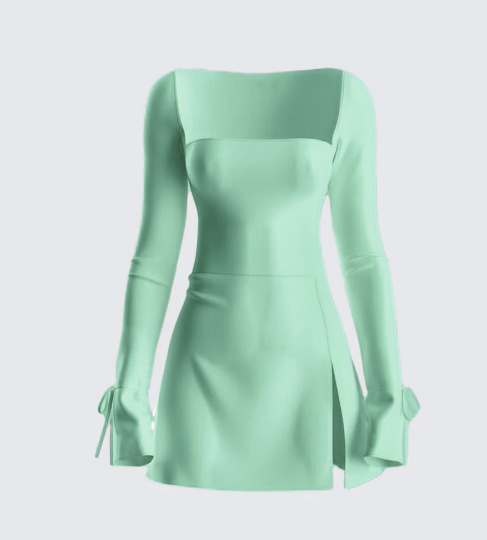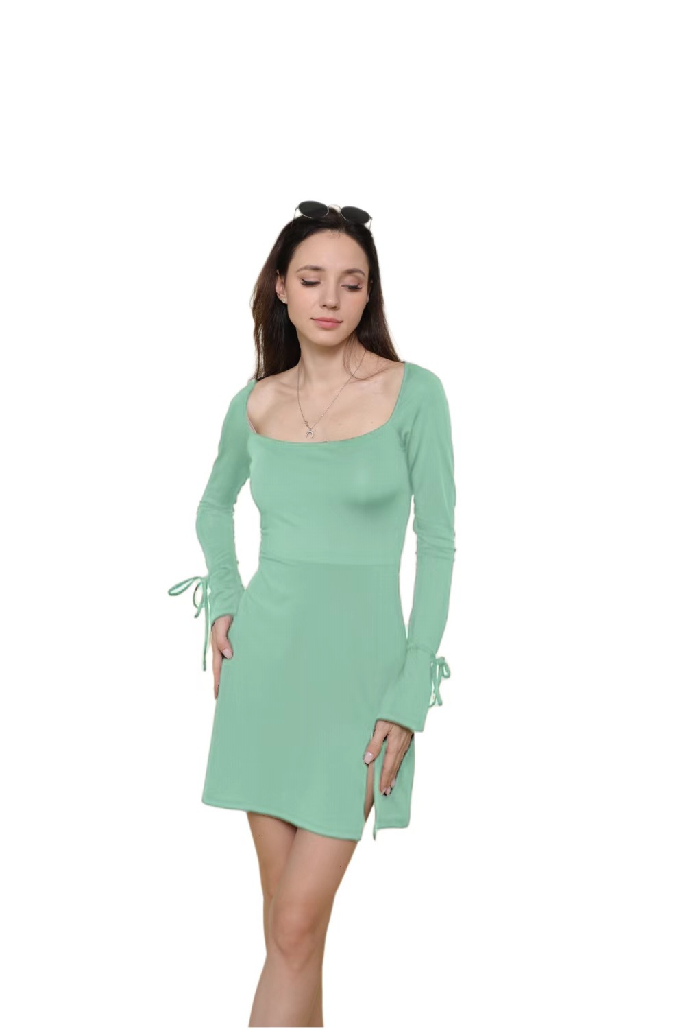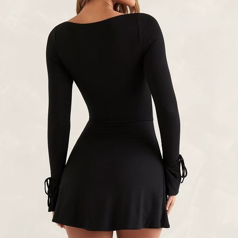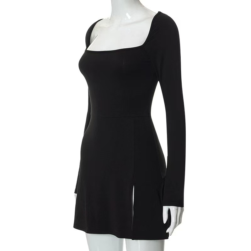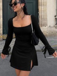 AYJ24L014 단색 스퀘어넥 약간의 플레어 긴팔 숏 하이웨이스트 캐주얼 슬릿 A라인 원피스 핫걸