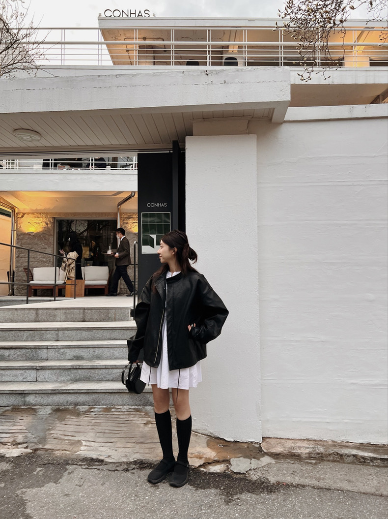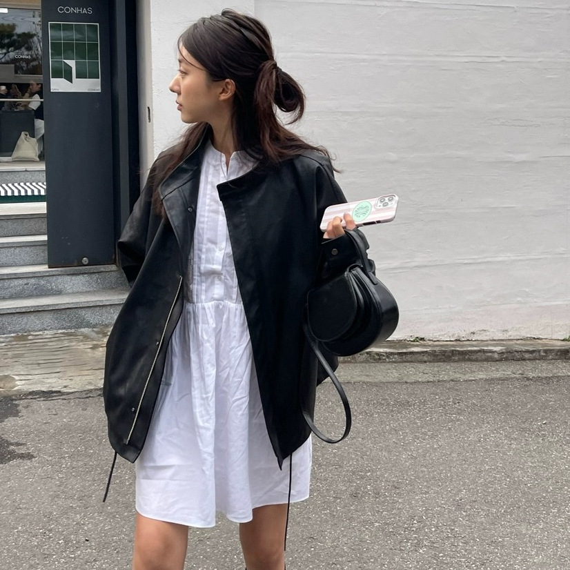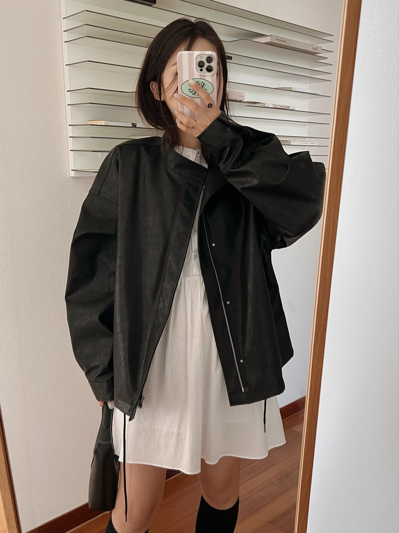 한국의 새로운 도착 블랙 모방 가죽 자켓 여성의 2024 봄과 가을 새로운 도착 홍콩 스타일 캐주얼 PU 가죽 자켓 탑스토어 가기