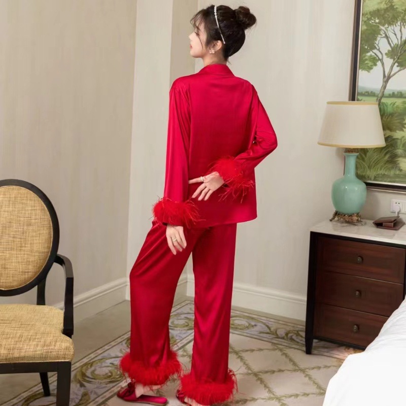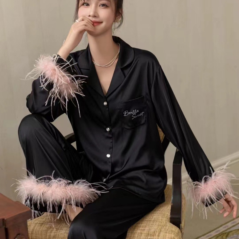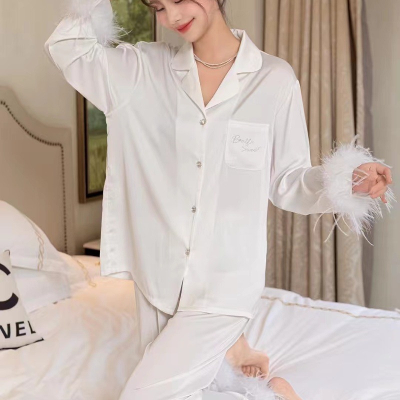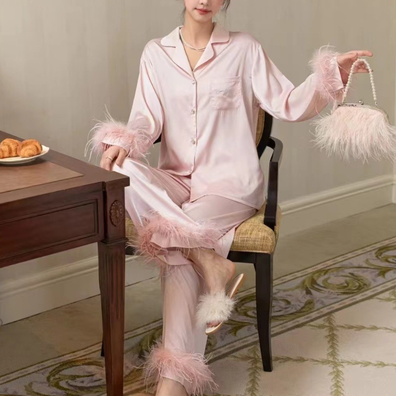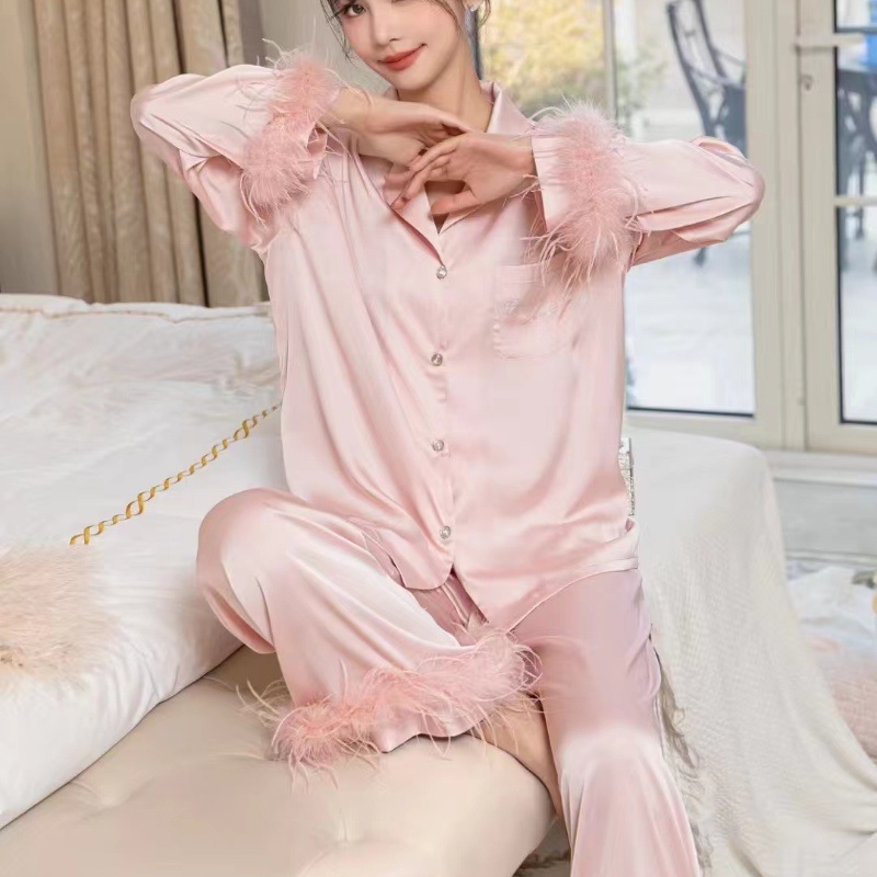 봄과 가을 새로운 아이스 실크 파자마 여성 투피스 깃털 긴팔 바지 고급 실크 홈 의류 세트