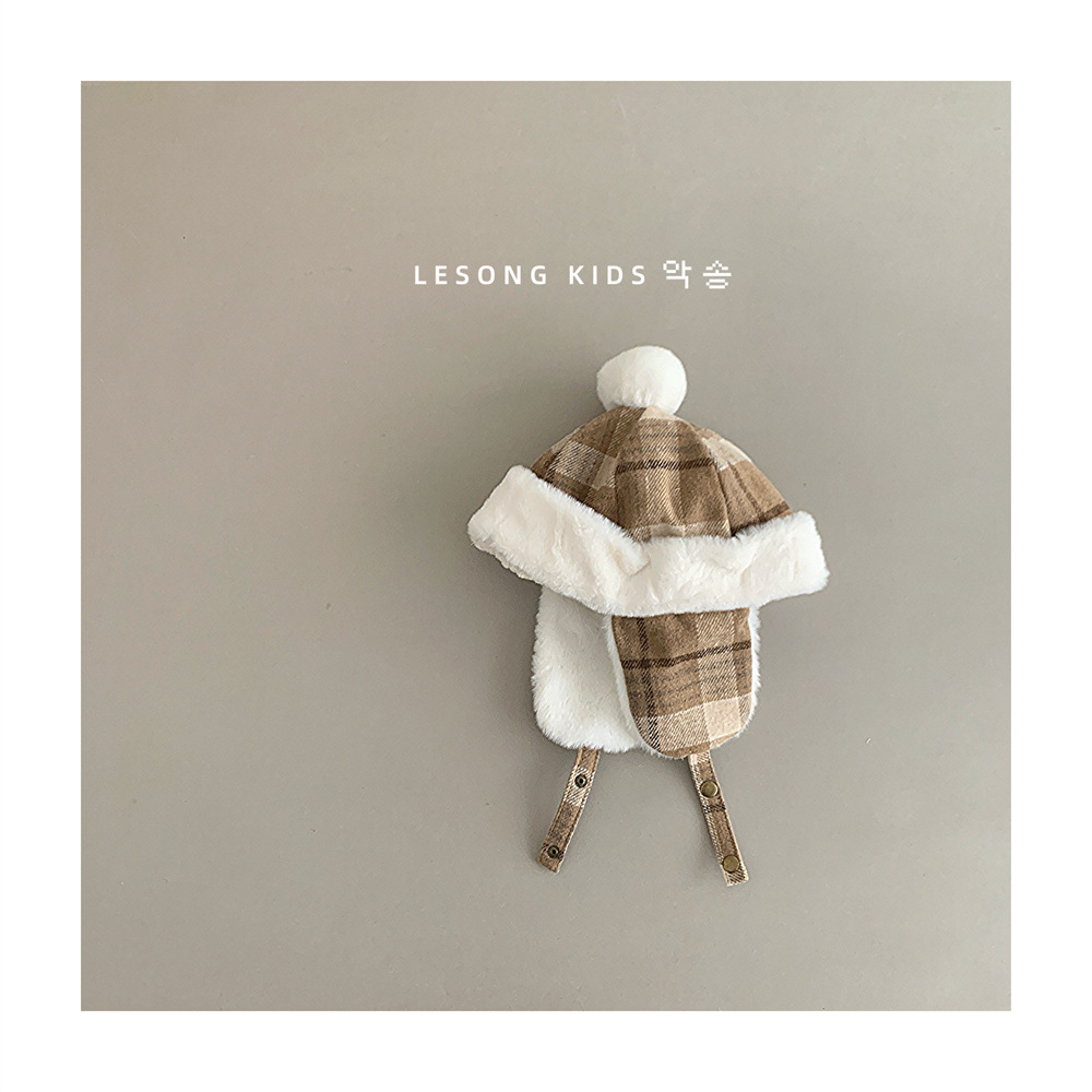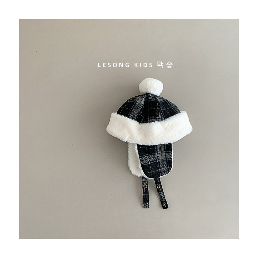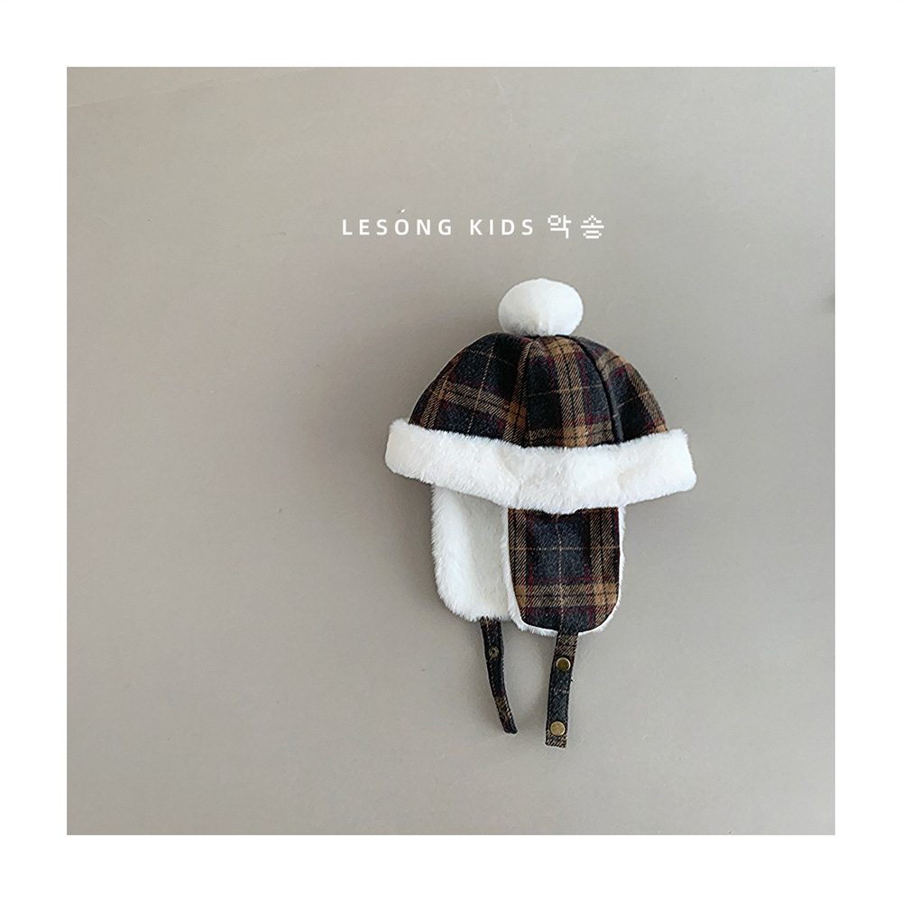 일본 격자 무늬 어린이 레이 펑 모자 소녀 겨울 빈티지 가을과 겨울 기모 어린이 두꺼운 봉제 귀 보호 차가운 모자