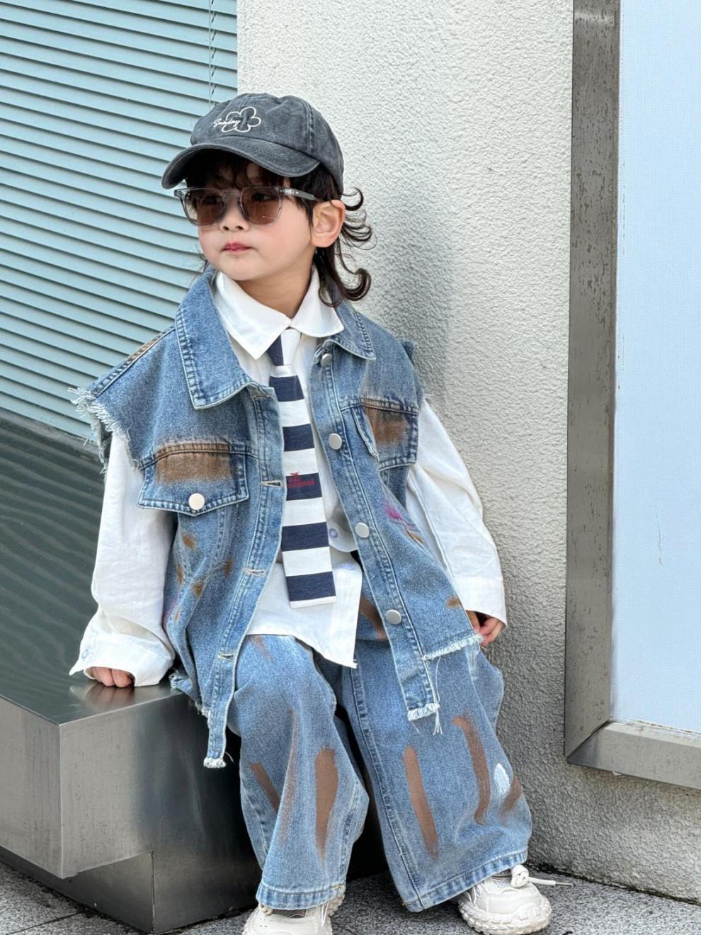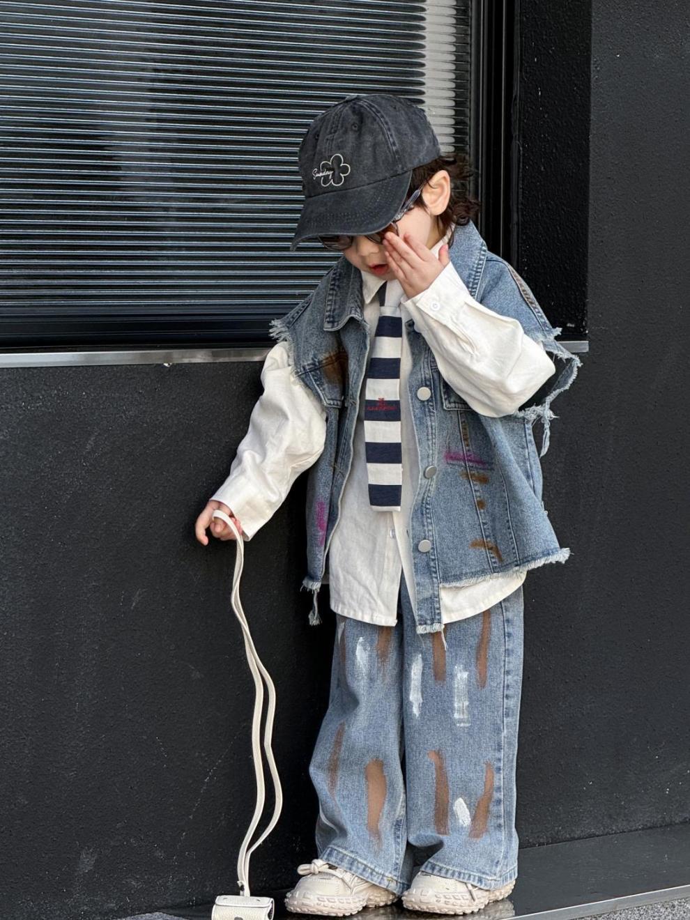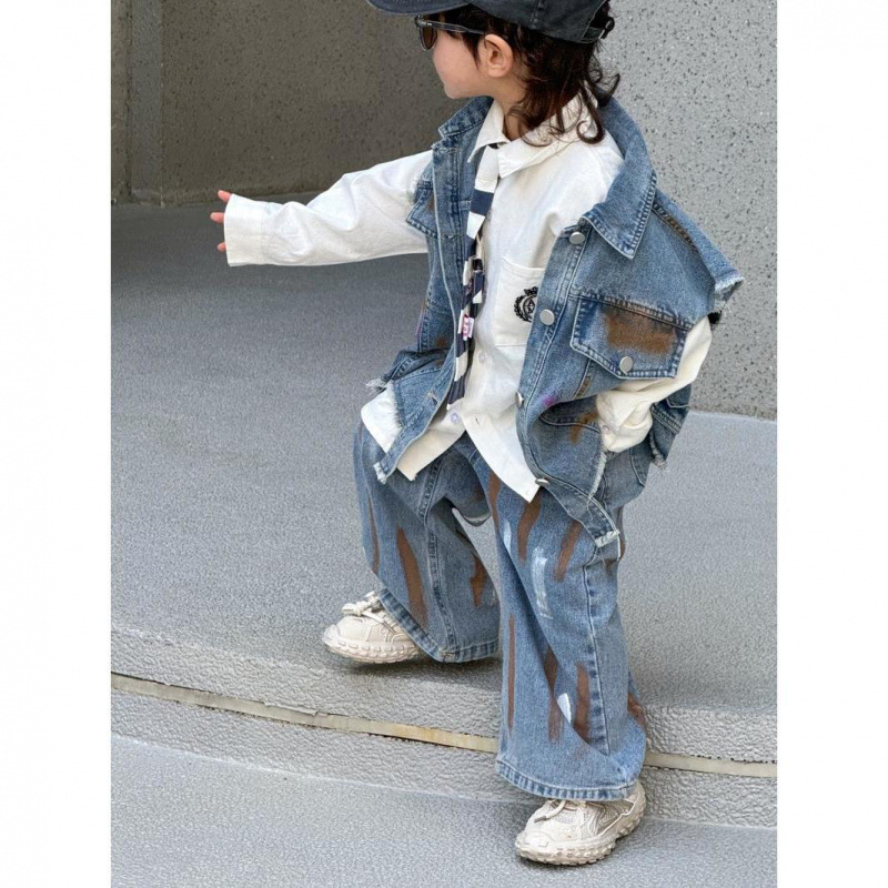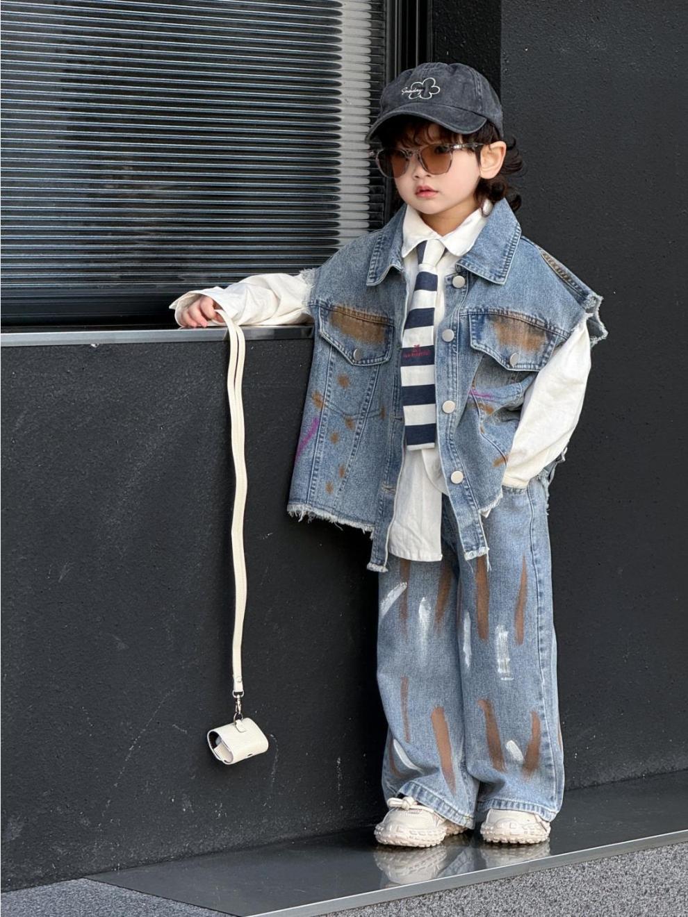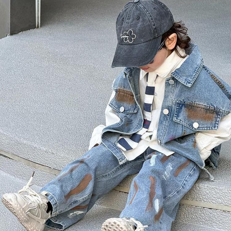2024 년 봄과 가을 세트 소년 데님 조끼 폭발 서양식 새로운 어린이 캐주얼 가을 청바지 투피스 세트