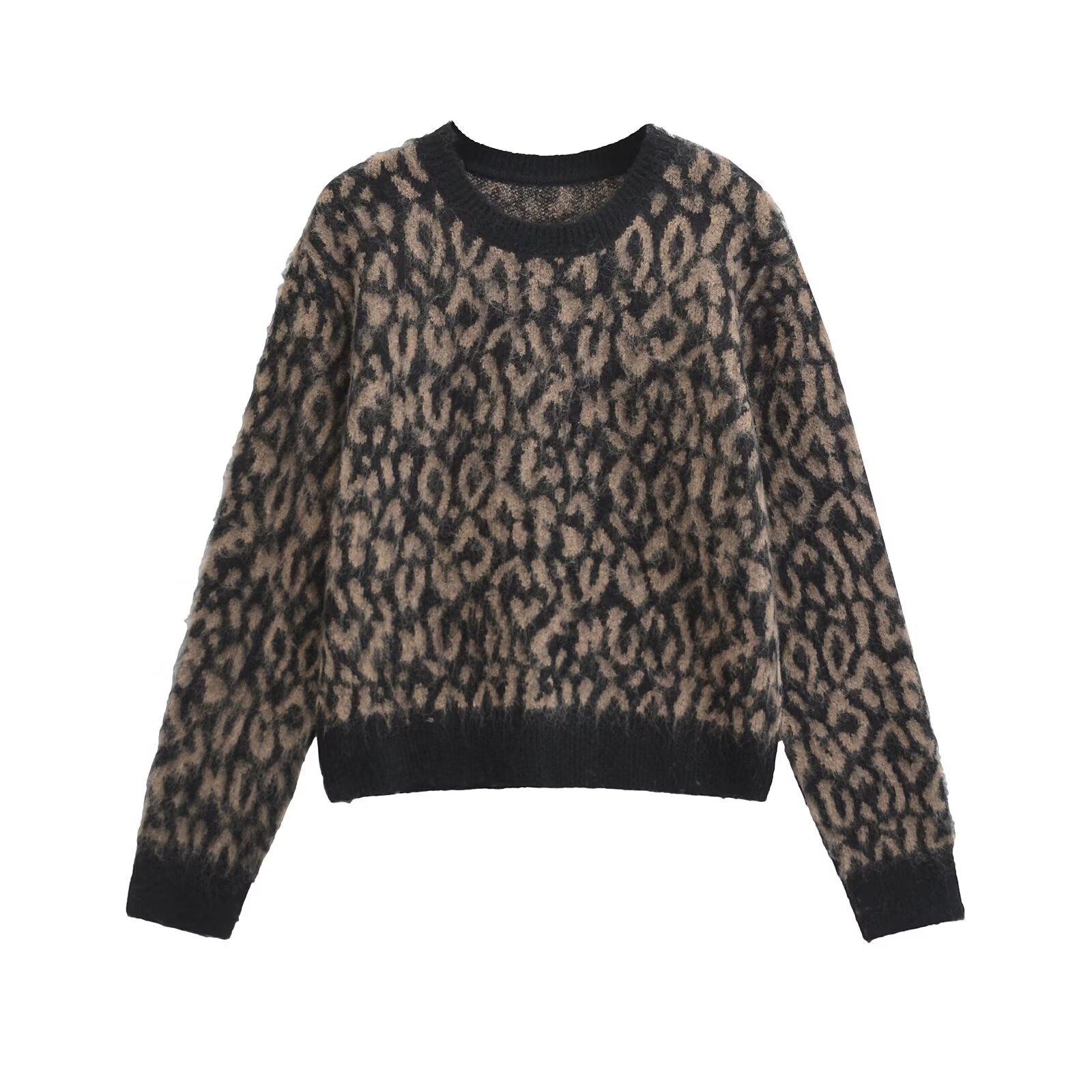 UC & ZA 국경 유럽 및 미국 여성의 2024 가을 새 라운드 넥 레오파드 자카드 느슨한 짧은 니트 스웨터 스웨터 스웨터