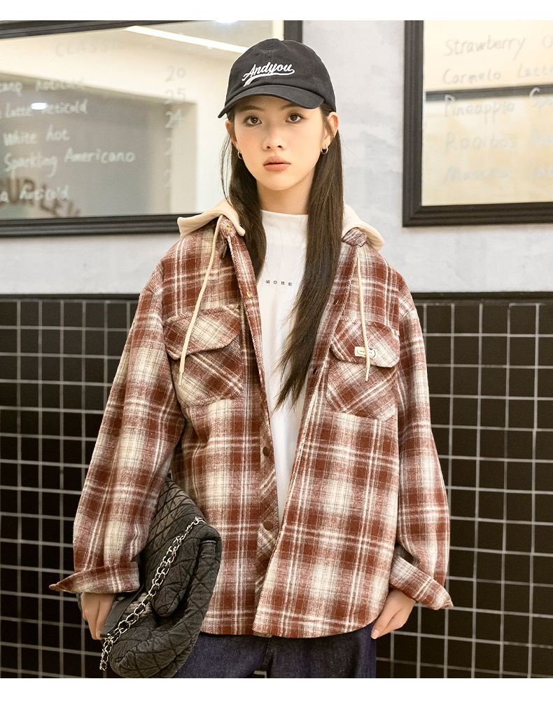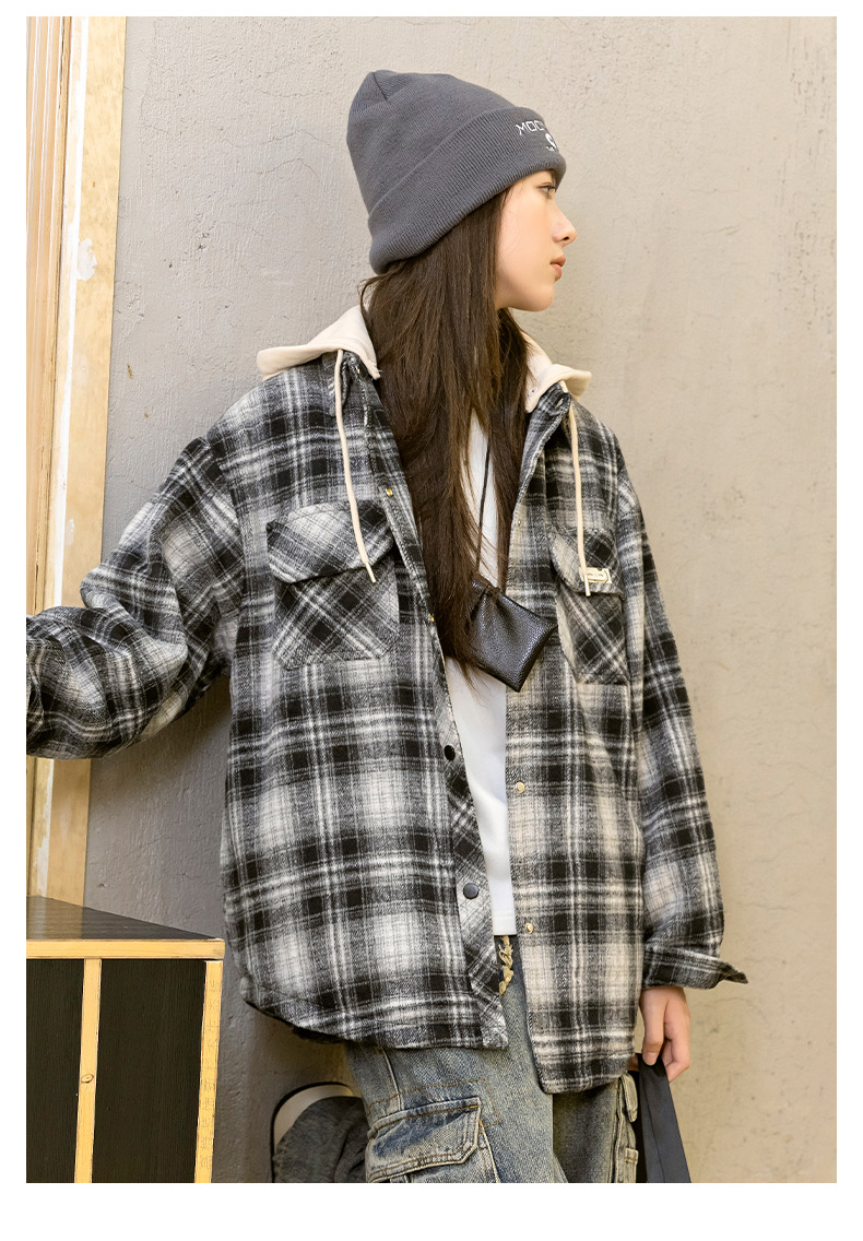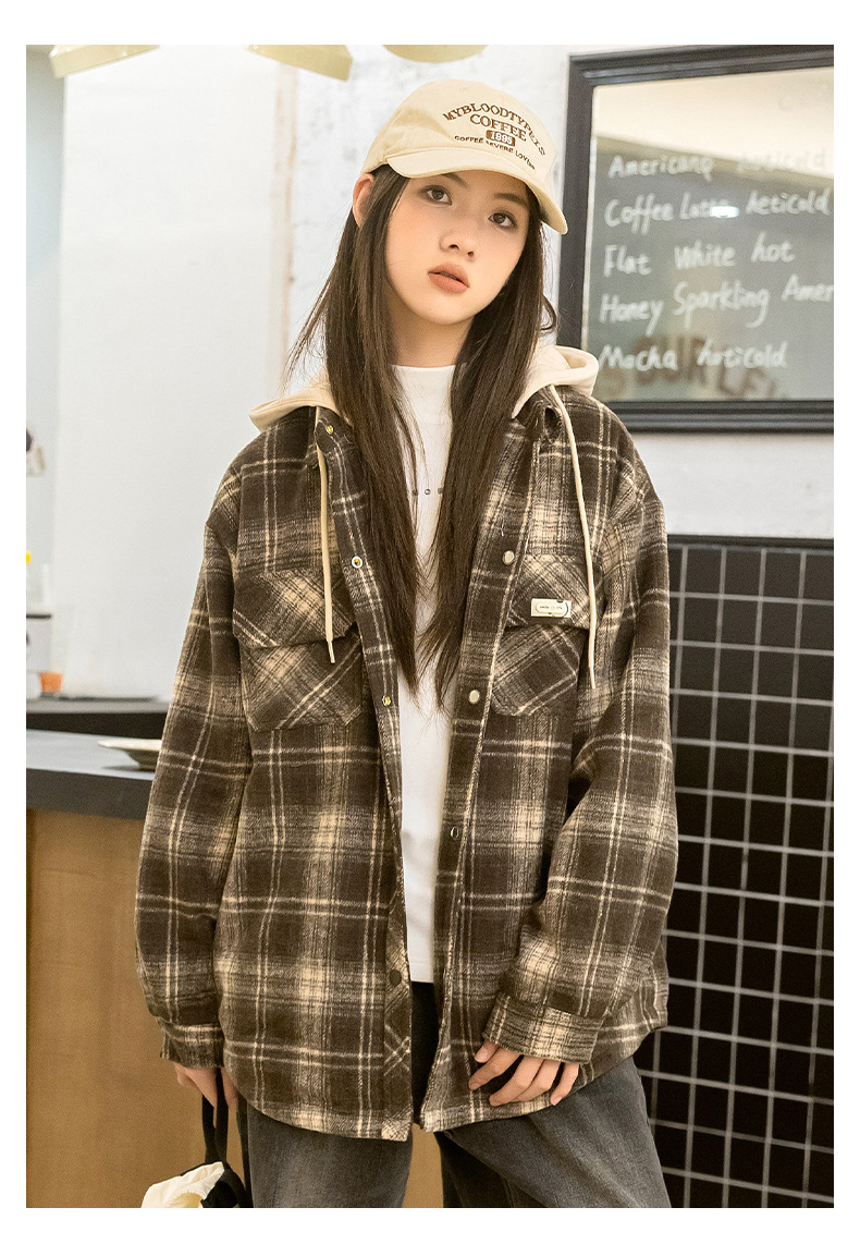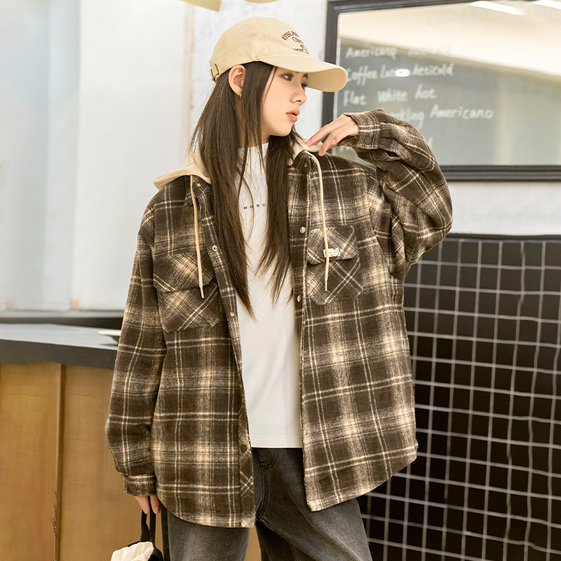 소녀들의 가을과 겨울 후드 체크 셔츠 2024 새로운 한국식 고등학생 면 탁상